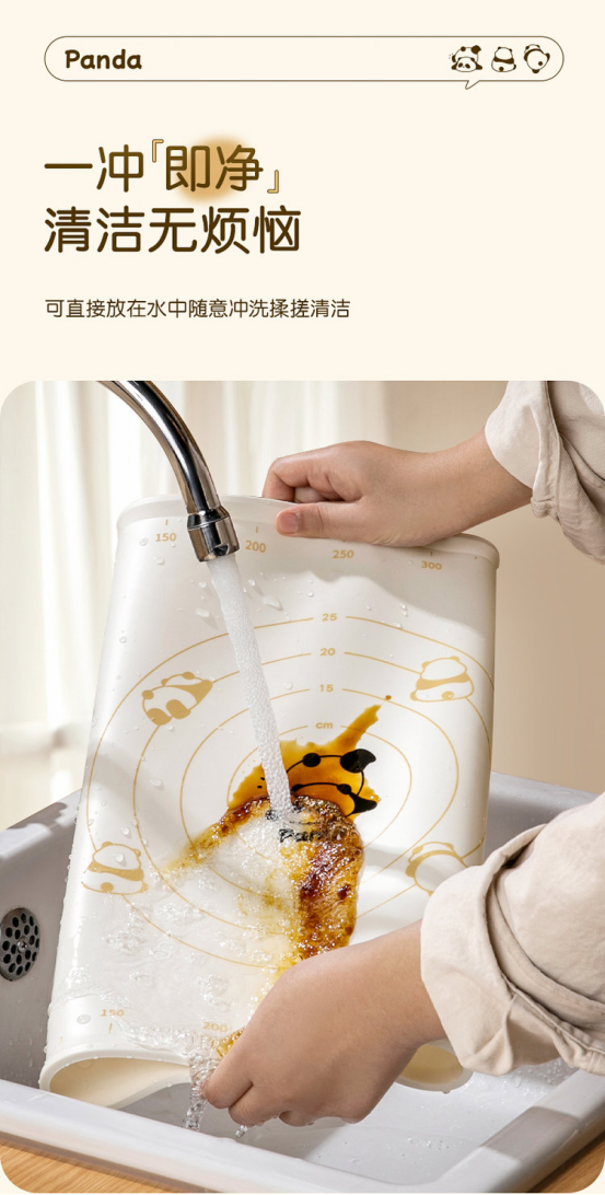 食品接触级材质 使用起来更放心! 这款揉面垫选用的是奶嘴同款材质——食品接触级的硅胶 可放心与食物接触无异味同时也不会产生有害物质,可以放心使用! 耐高温、高温消毒 耐230℃高温,-40℃低温 更不易滋生细菌 它可以直接高温消毒也可直接放进沸水蒸煮 而且边缘加厚的凸起设计,有效防止水溢出~