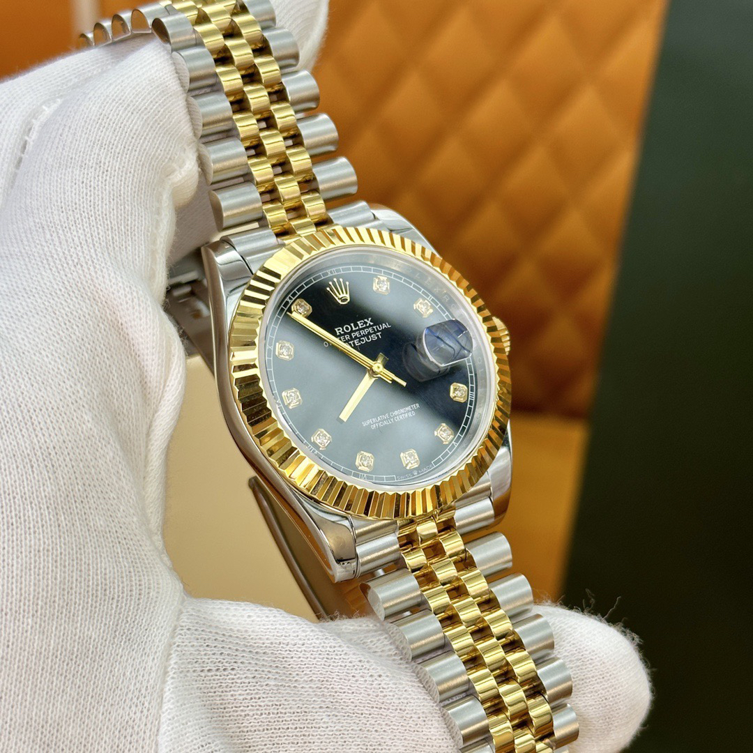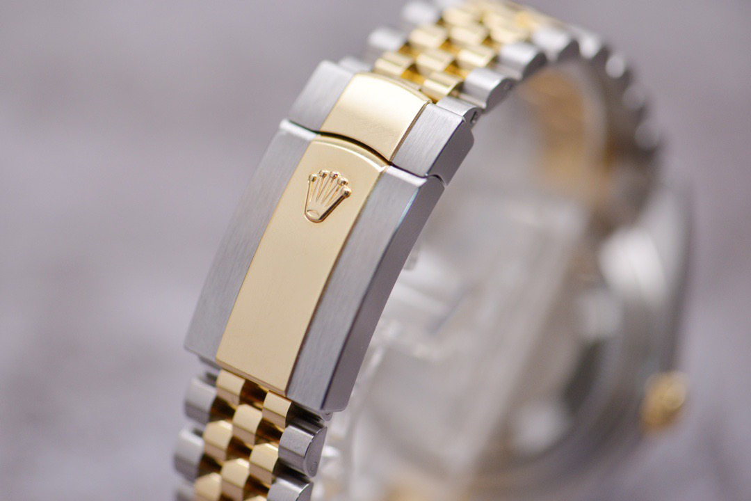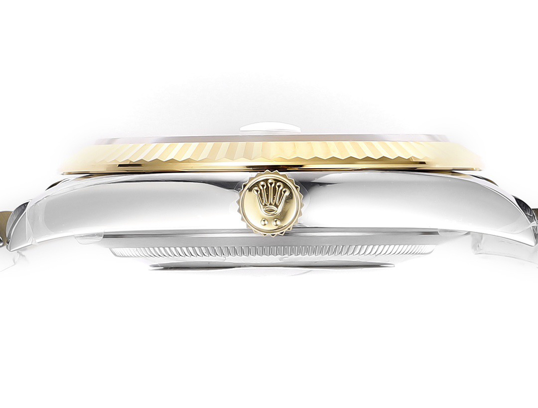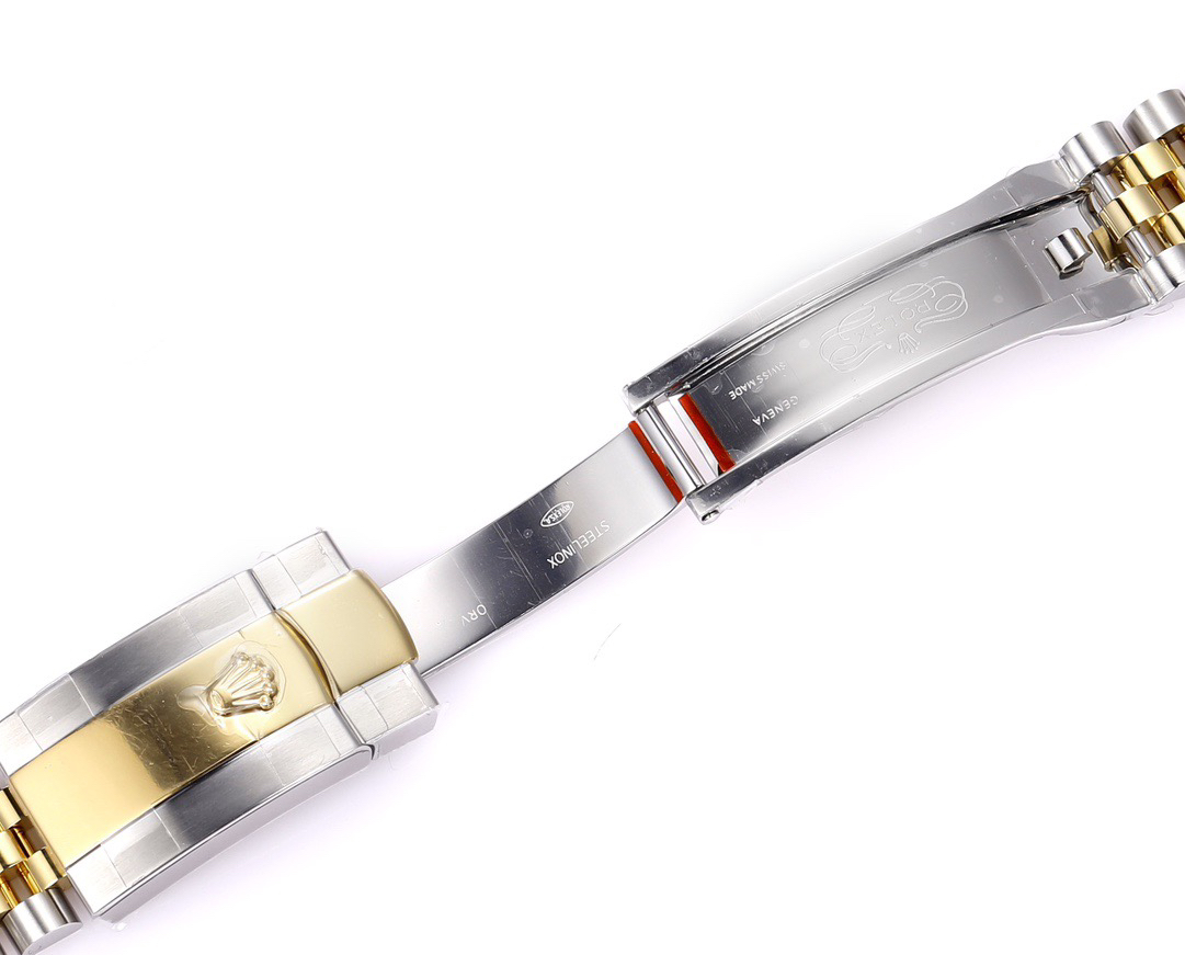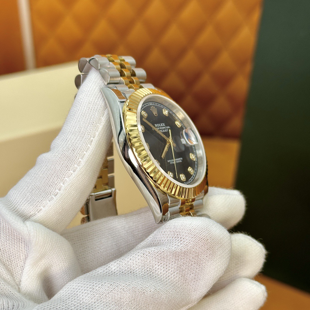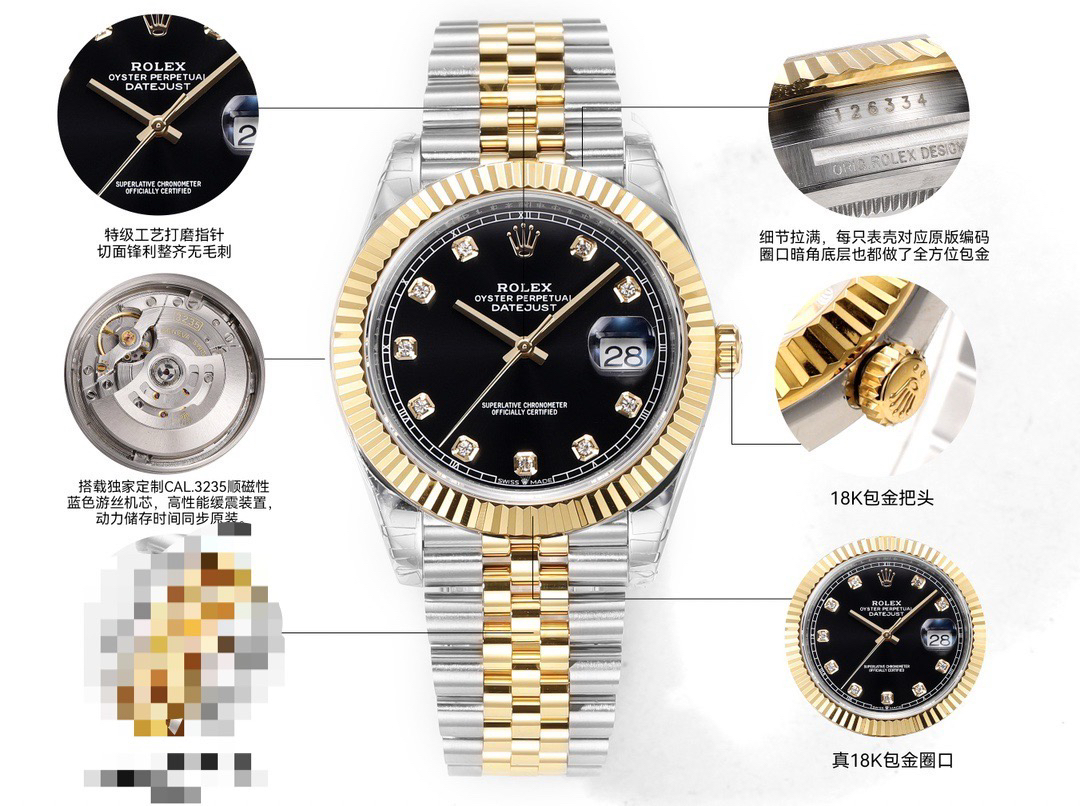 The perfect version of the black disc log features the original 3235 automatic mechanical movement, 904L stainless steel paired with a golden case and strap, with a smooth texture that can be fully pulled and pushed. The electroplated platinum teeth ring is durable and not easy to fade!