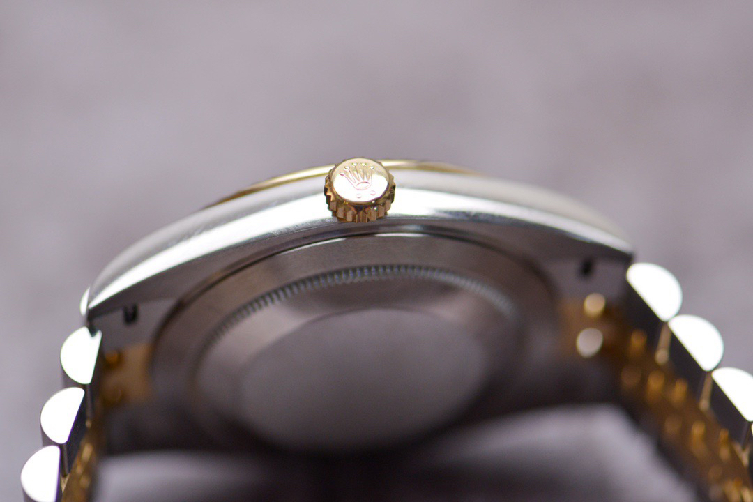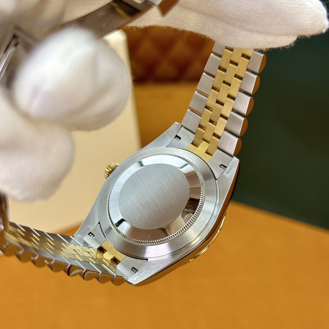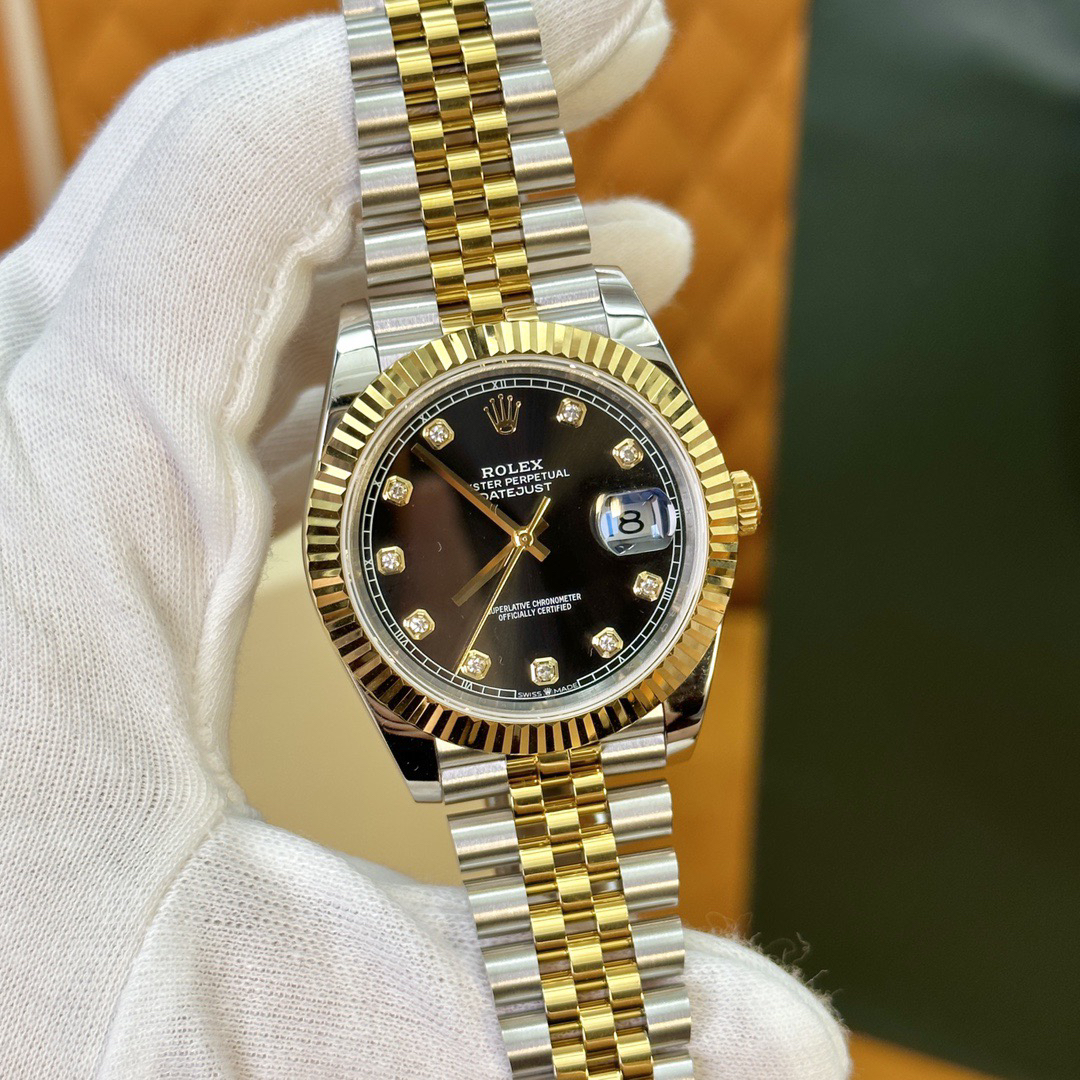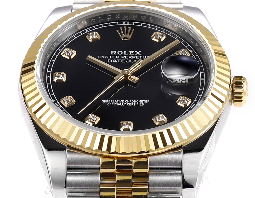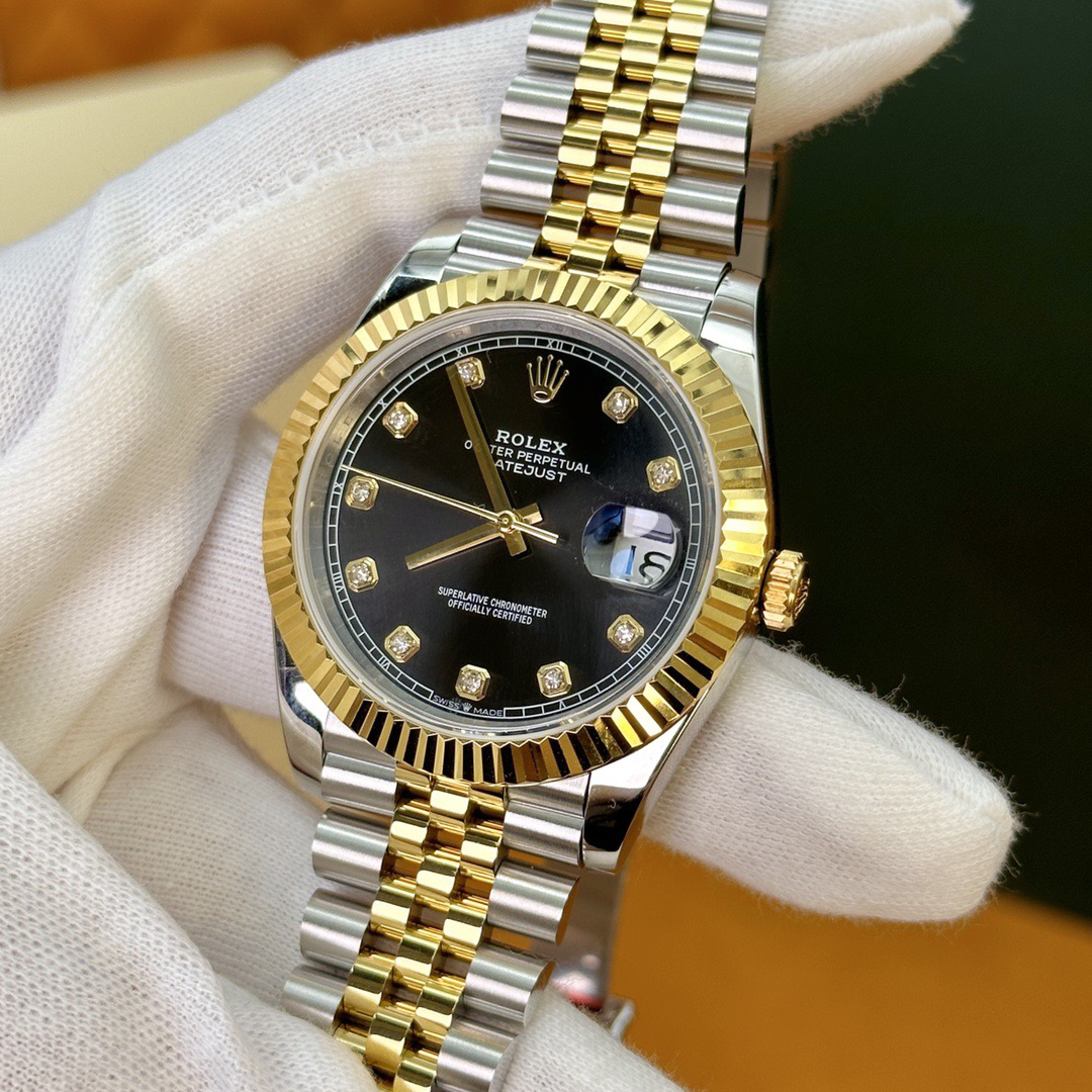 The perfect version of the black disc log features the original 3235 automatic mechanical movement, 904L stainless steel paired with a golden case and strap, with a smooth texture that can be fully pulled and pushed. The electroplated platinum teeth ring is durable and not easy to fade!