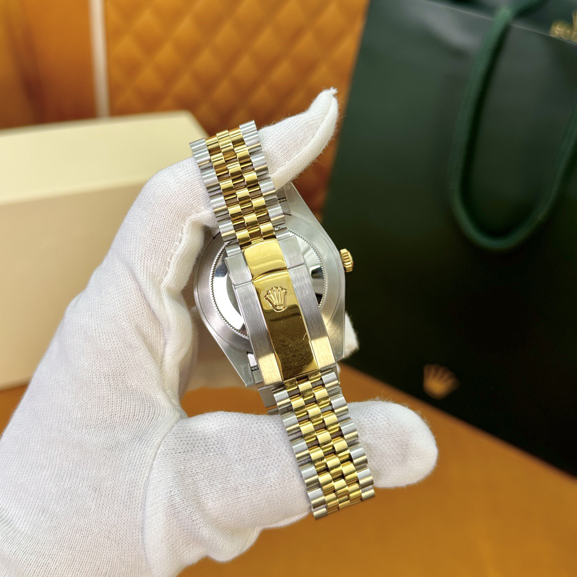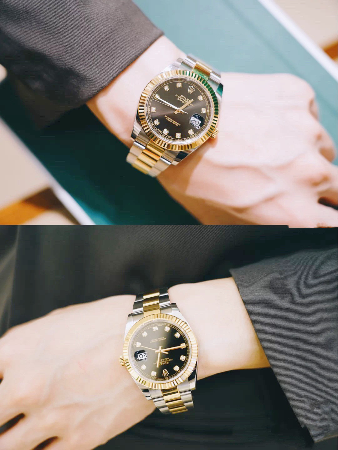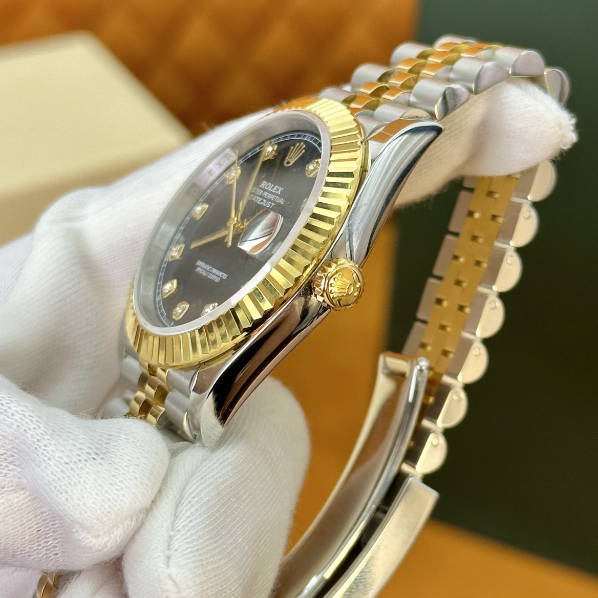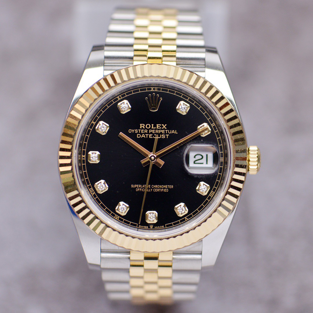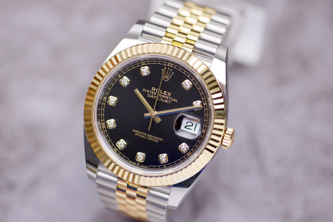 The perfect version of the black disc log features the original 3235 automatic mechanical movement, 904L stainless steel paired with a golden case and strap, with a smooth texture that can be fully pulled and pushed. The electroplated platinum teeth ring is durable and not easy to fade!