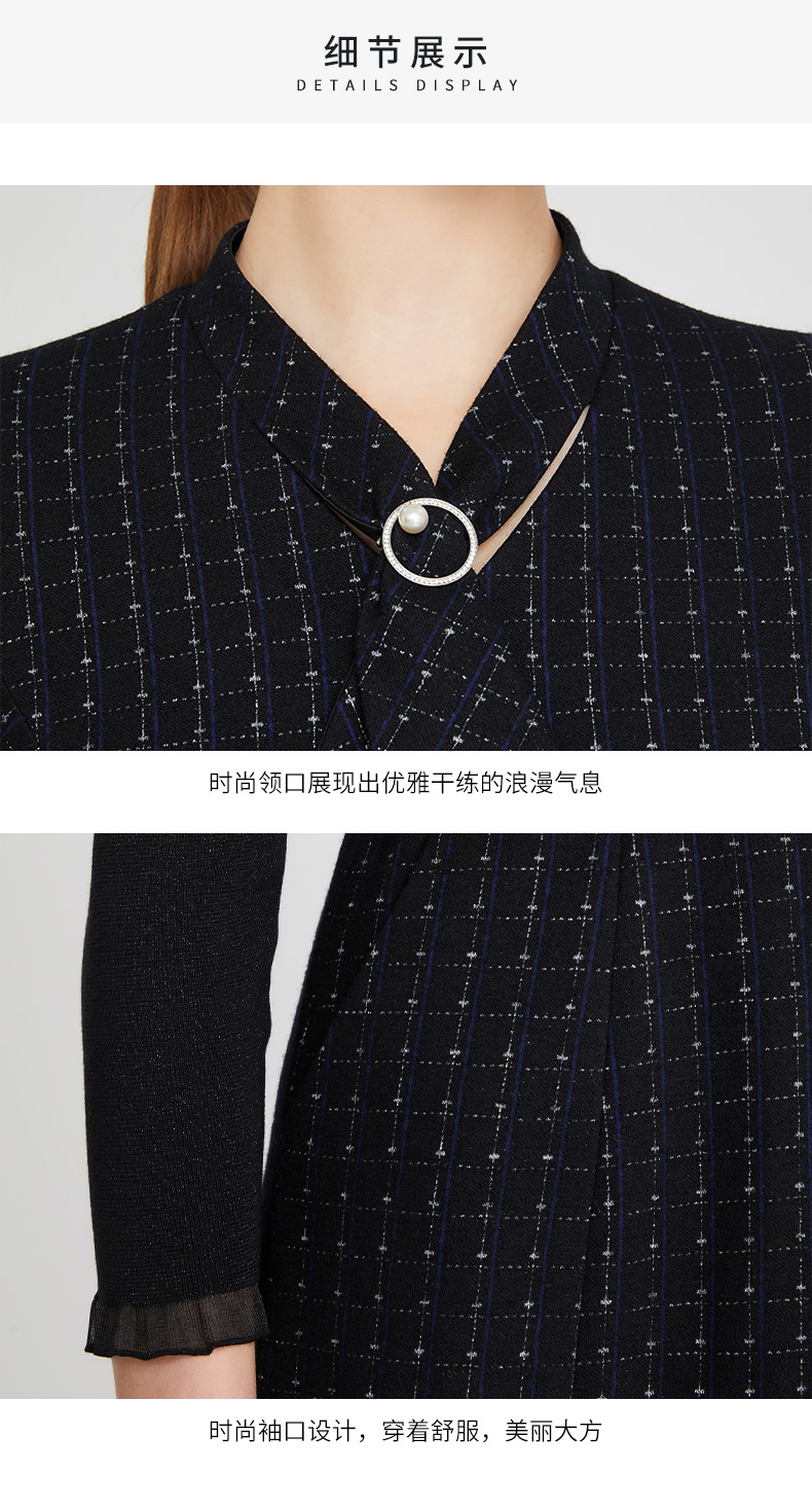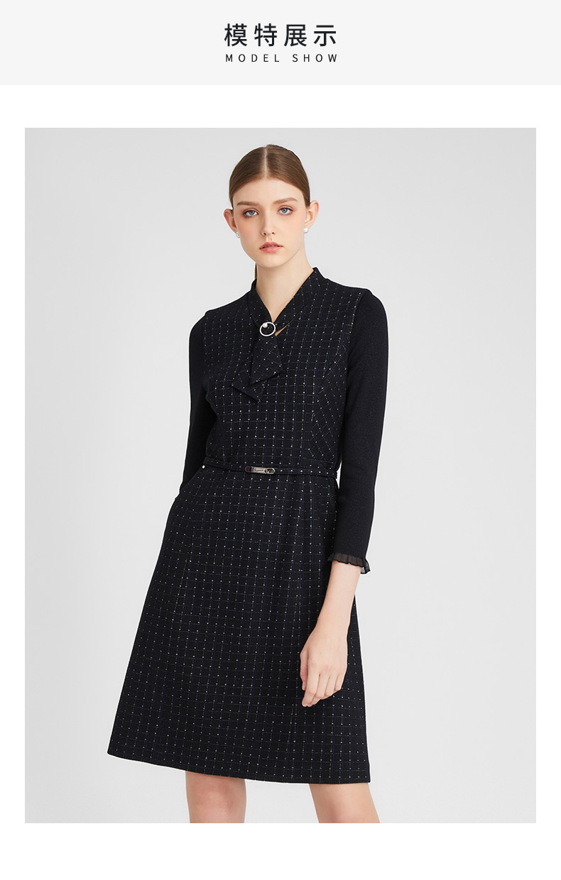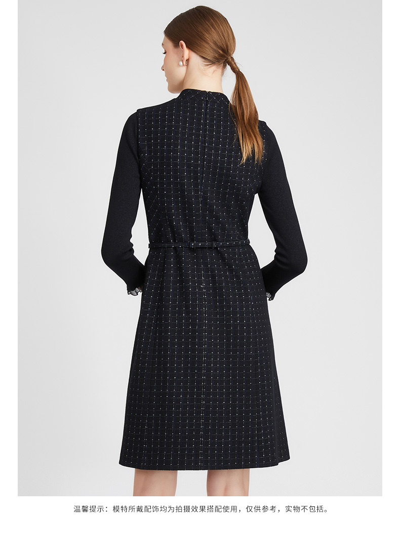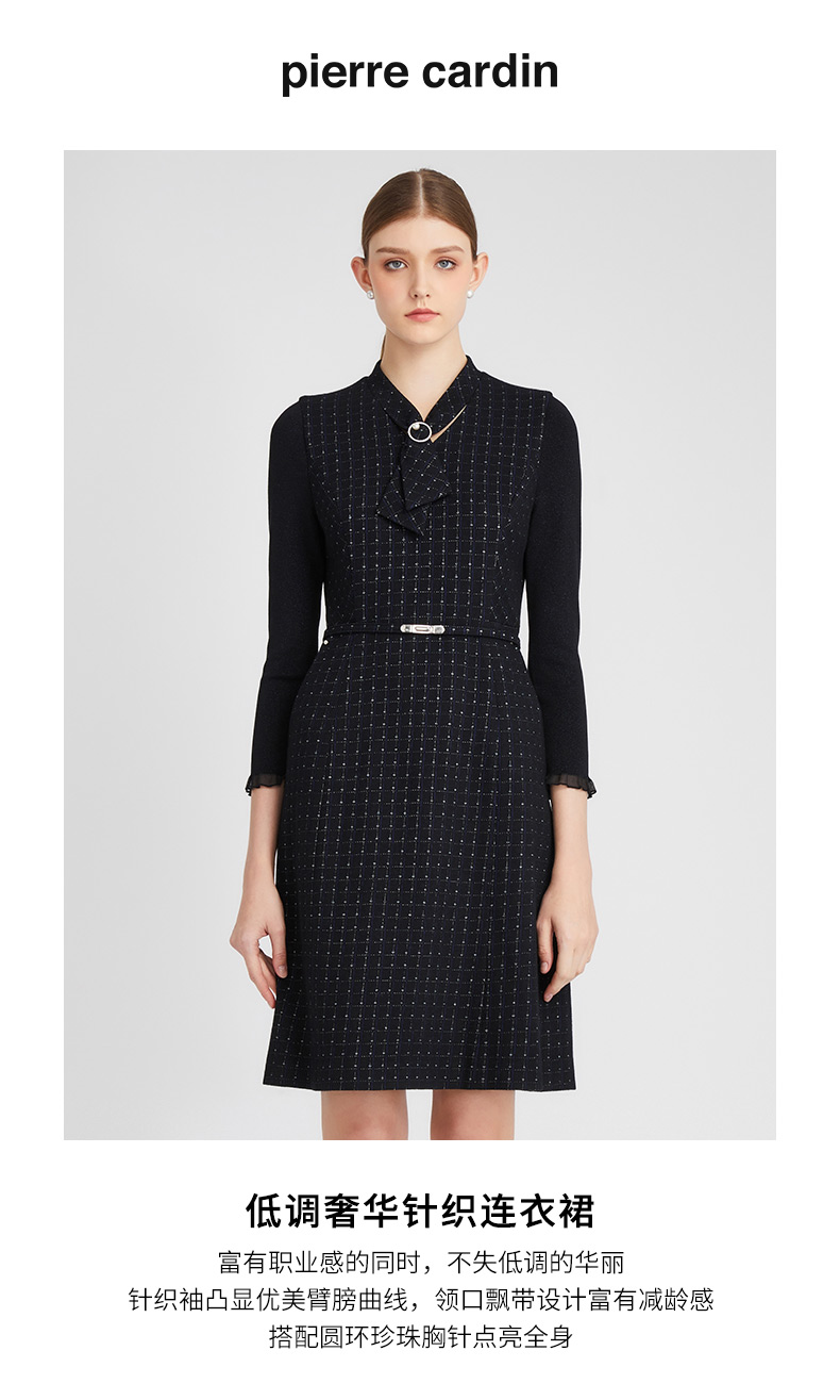 皮尔卡丹女装连衣裙蕾丝花边袖口黑色长袖淑女羊毛裙P2332E2947B3