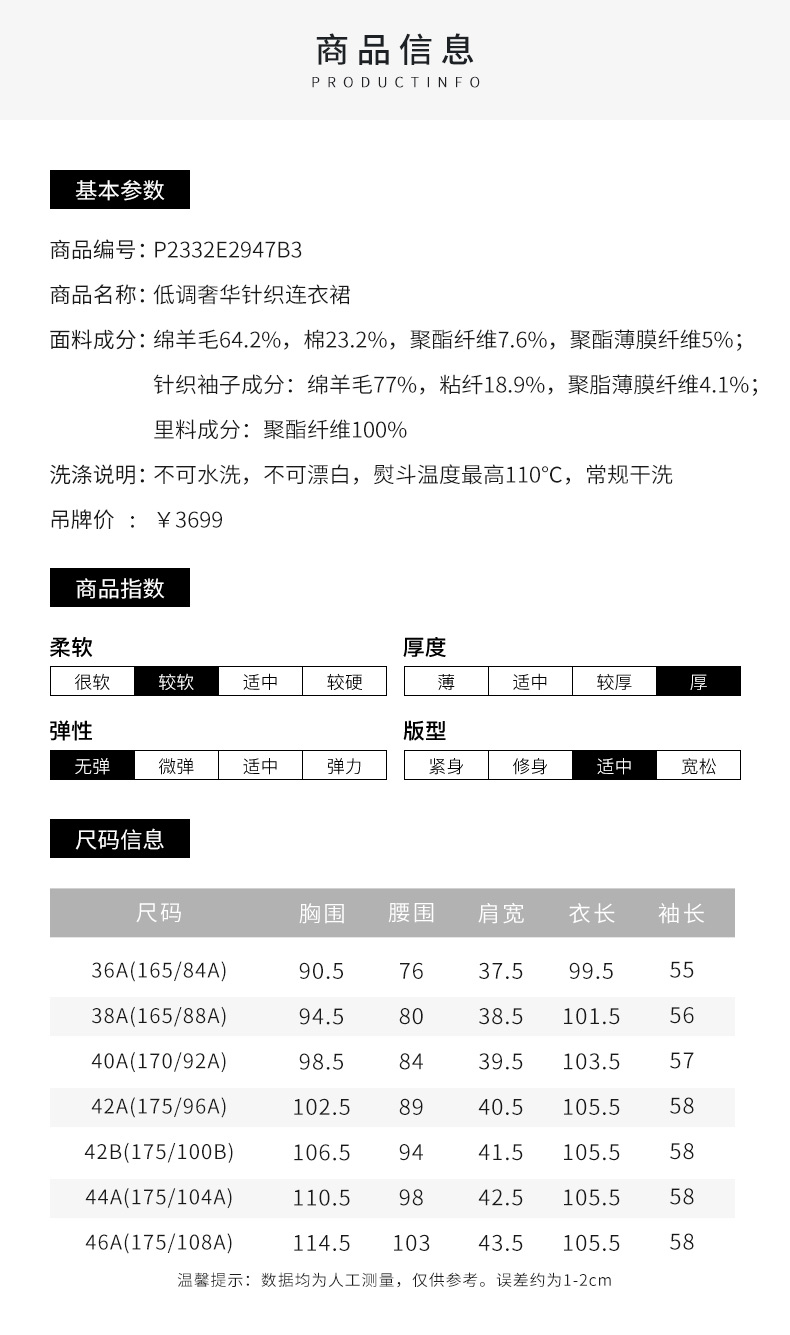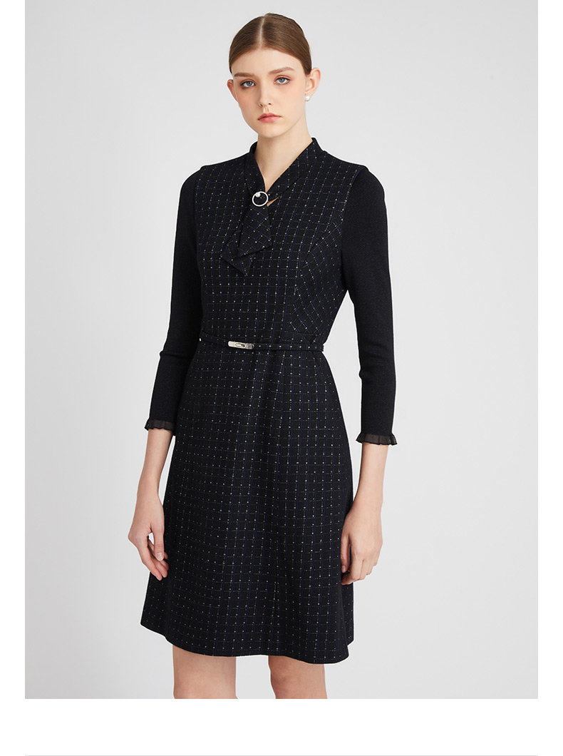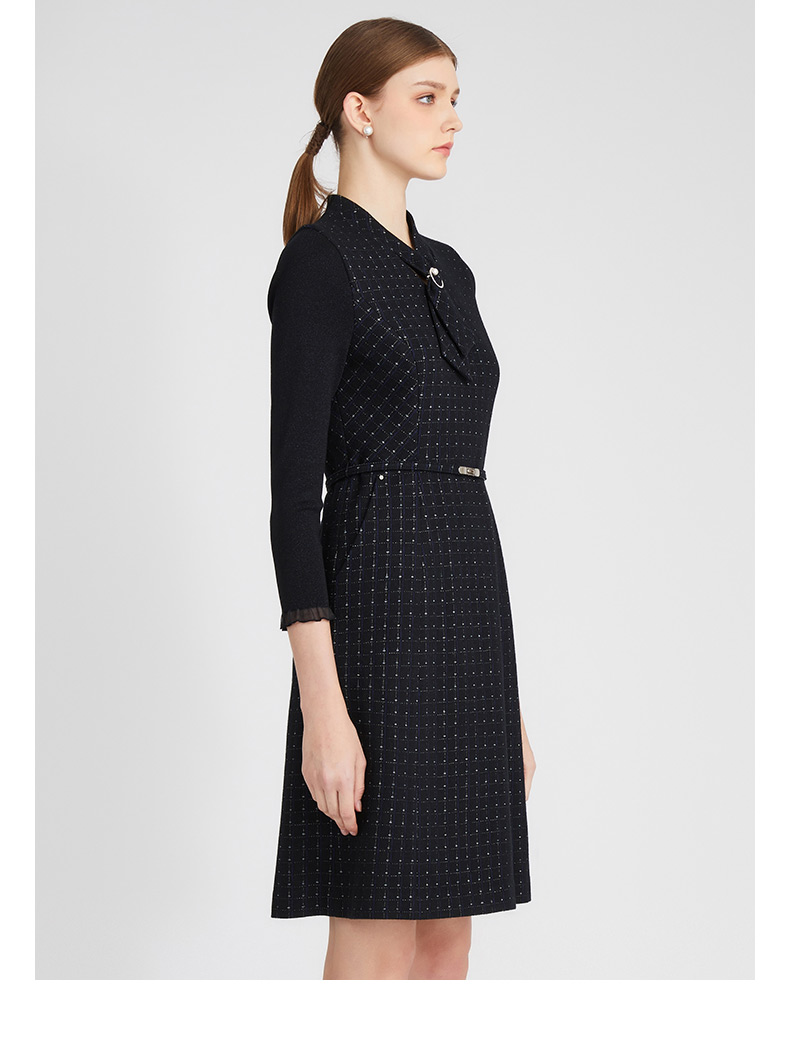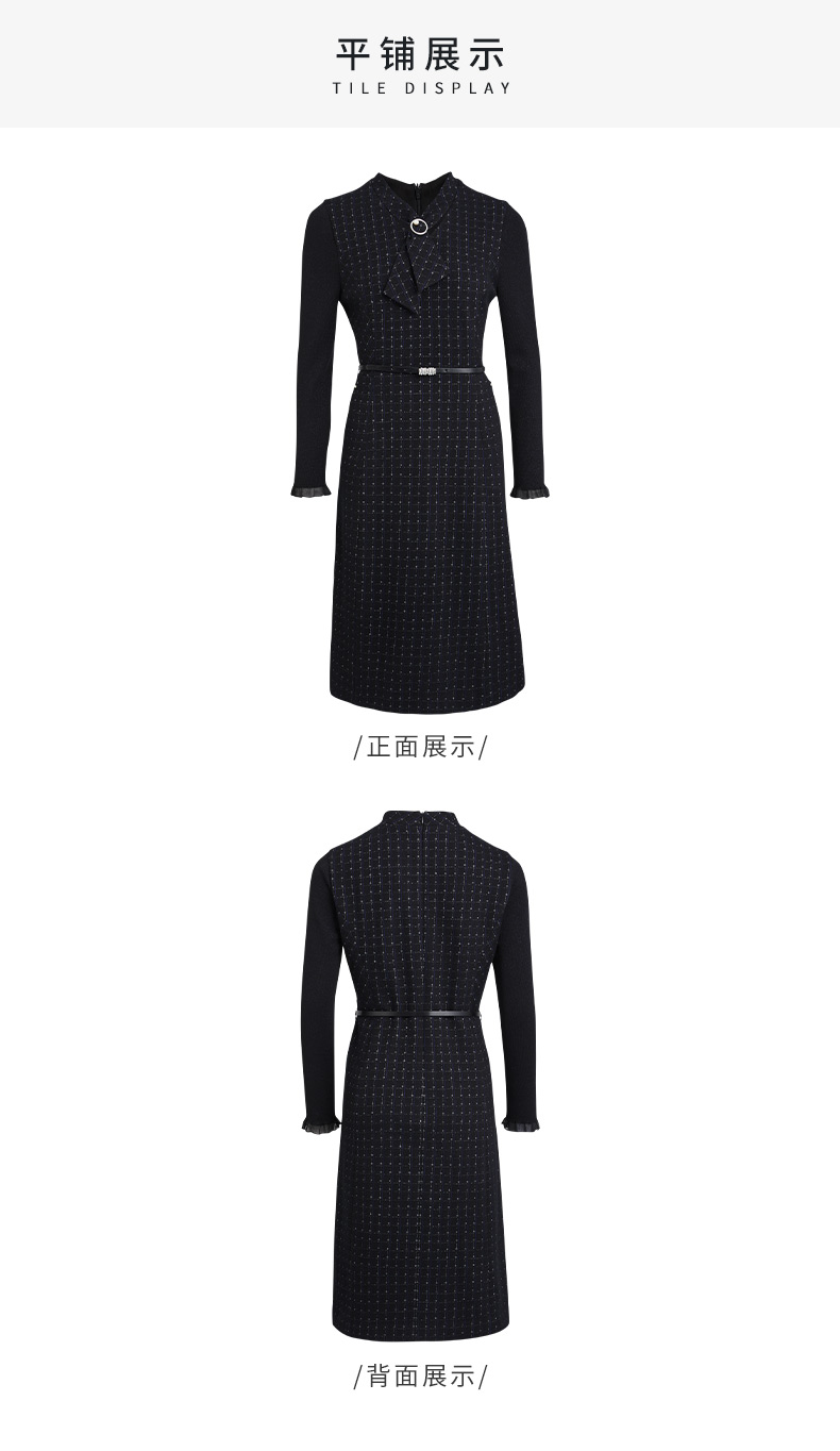 皮尔卡丹女装连衣裙蕾丝花边袖口黑色长袖淑女羊毛裙P2332E2947B3
