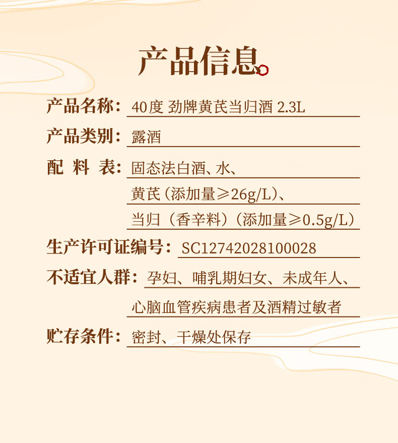 【新品】40°劲牌黄芪当归酒 2.3L