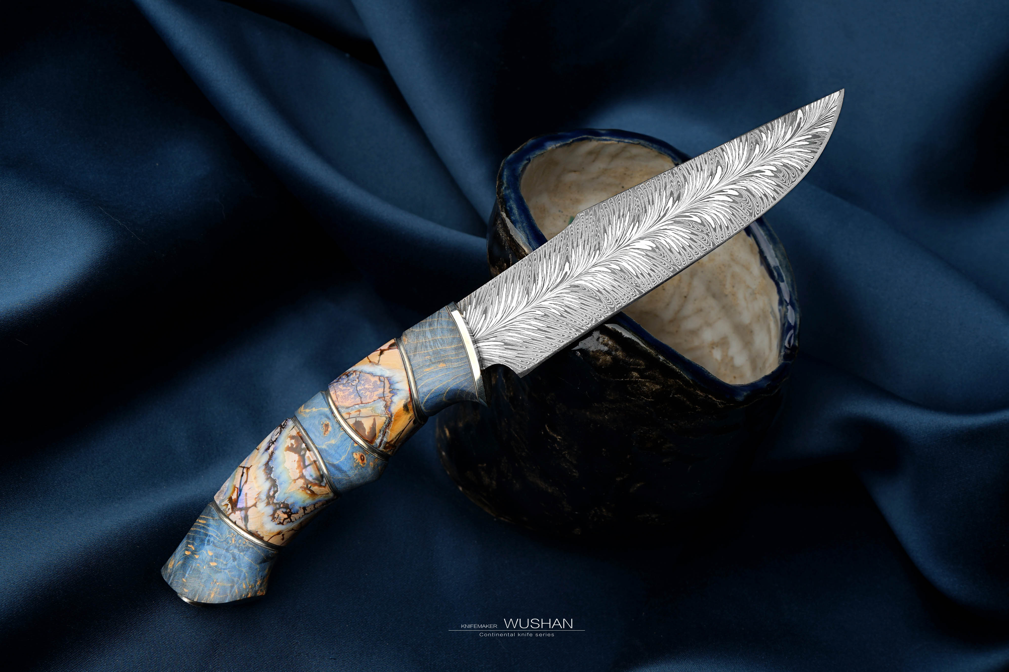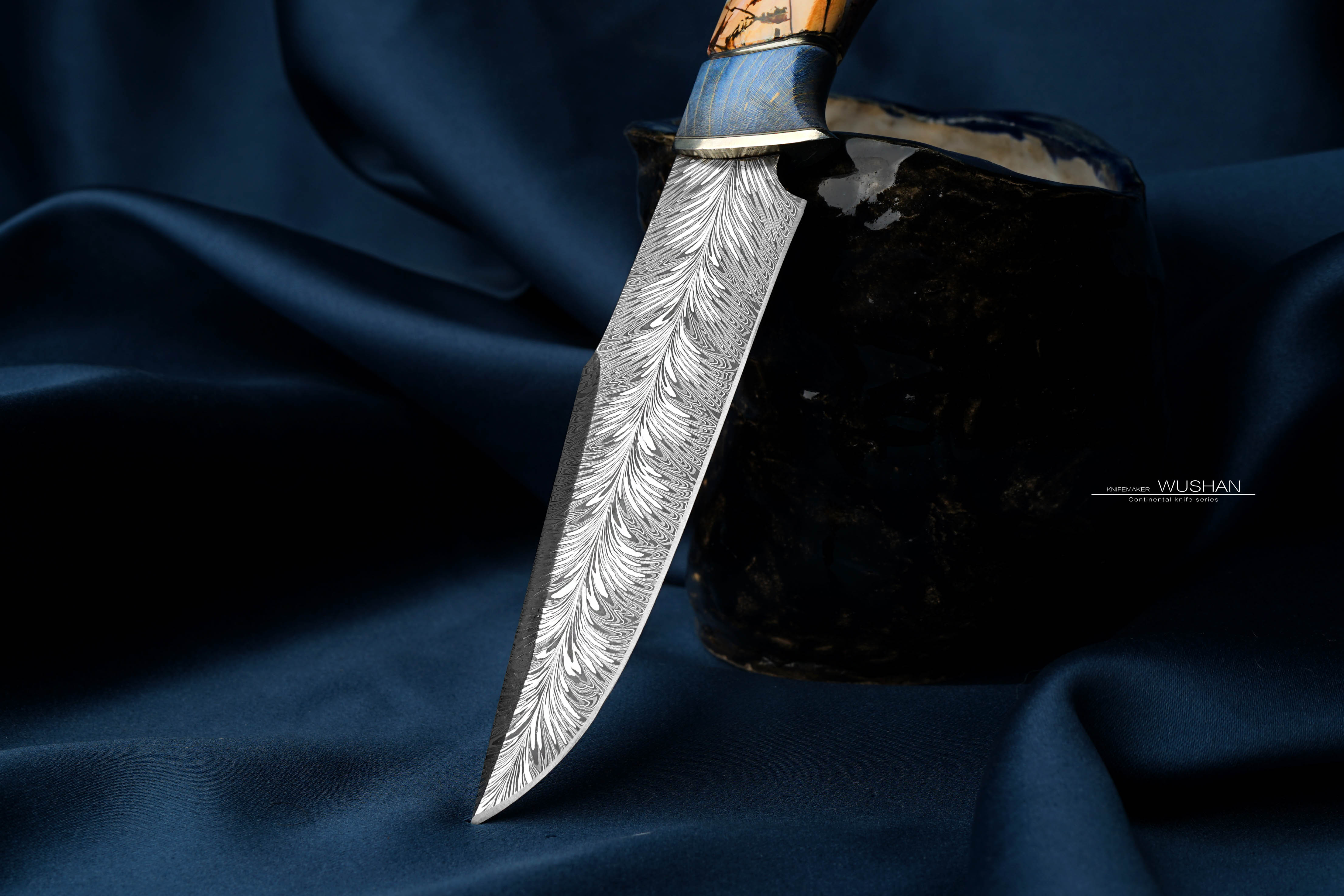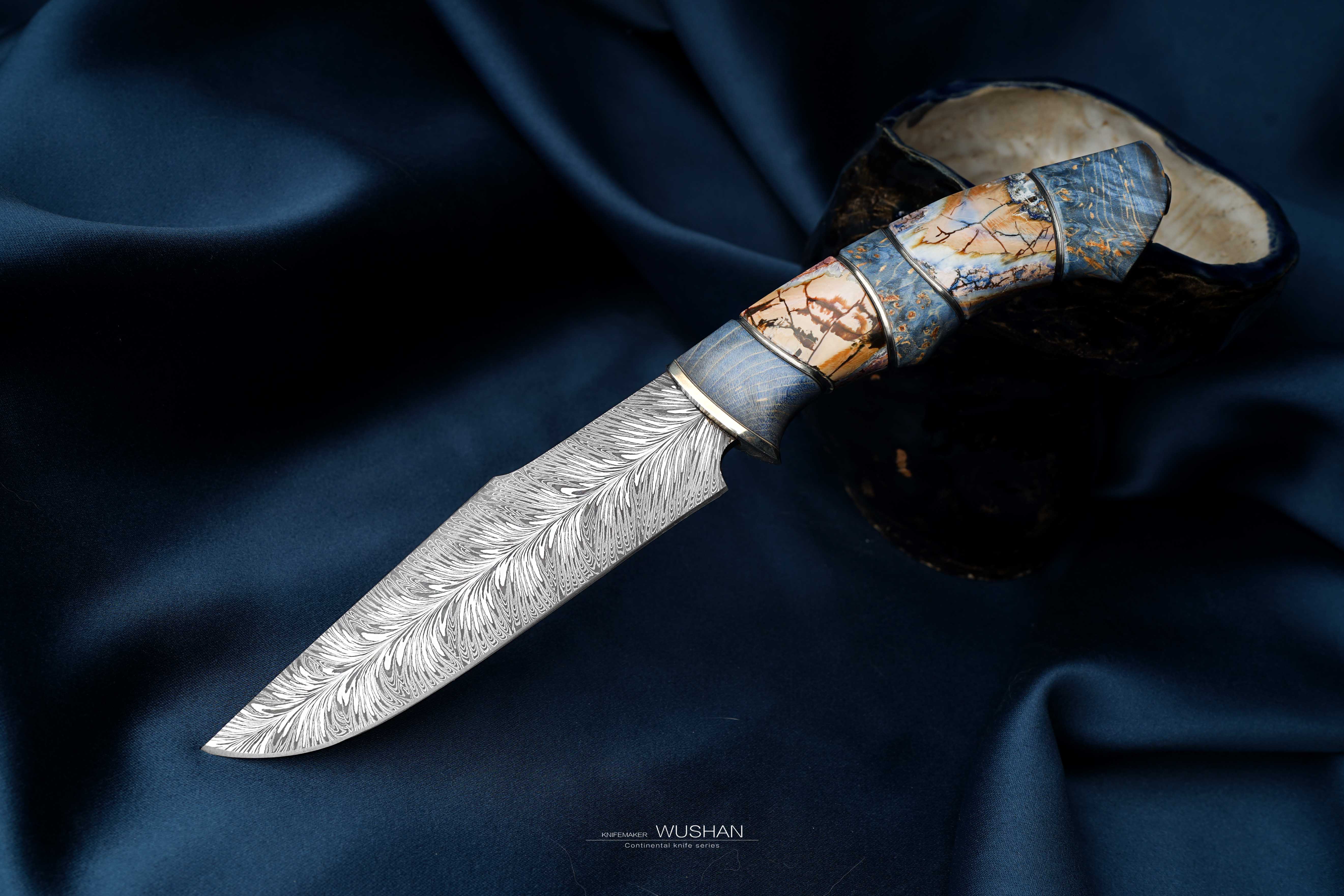 这只是特殊钢材版本的,我们自己锻打的大马士革钢,灰白灰白非常柔顺,西伯利亚进口优质猛犸+实木柄,蓝白黄配色是这个主题的经典