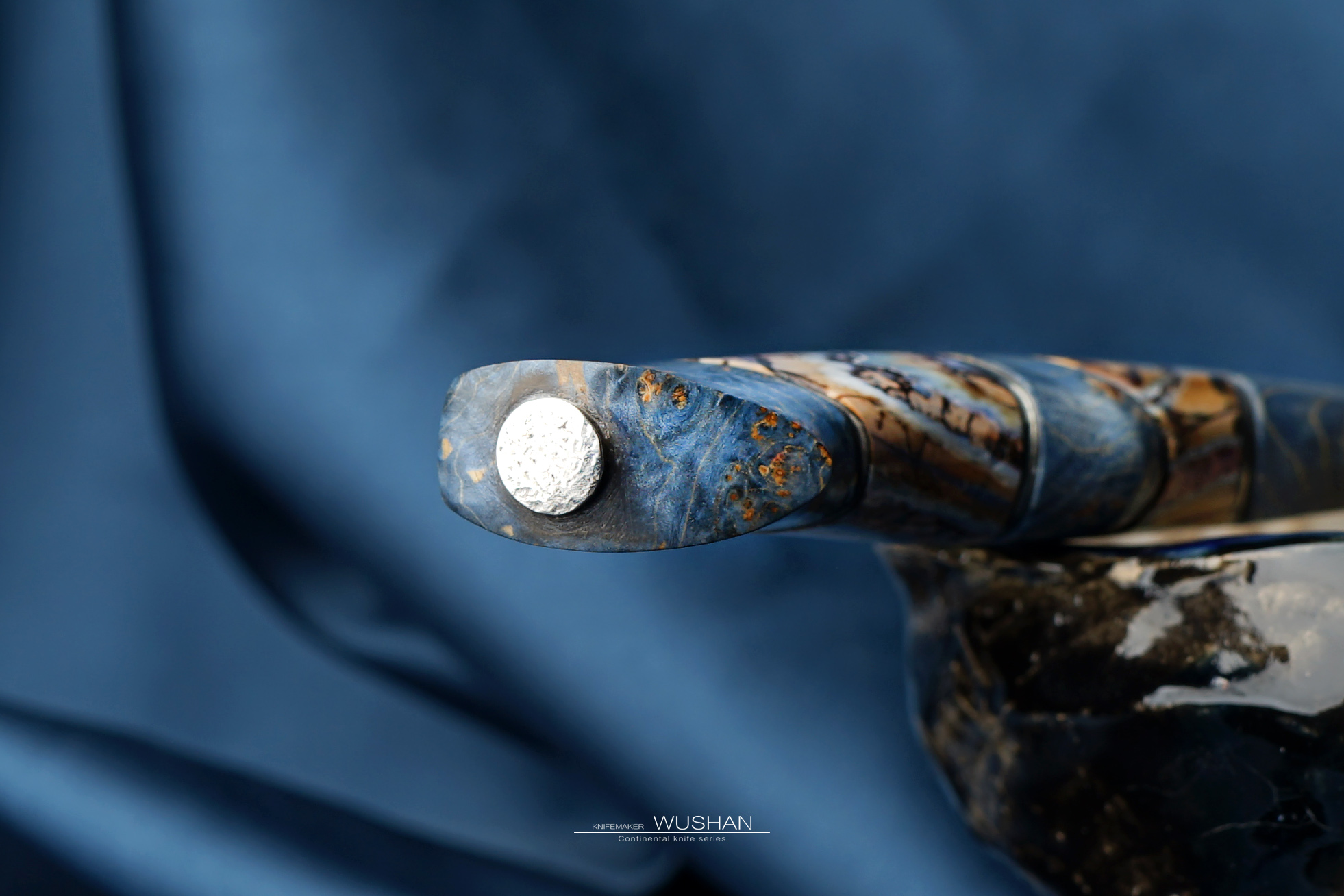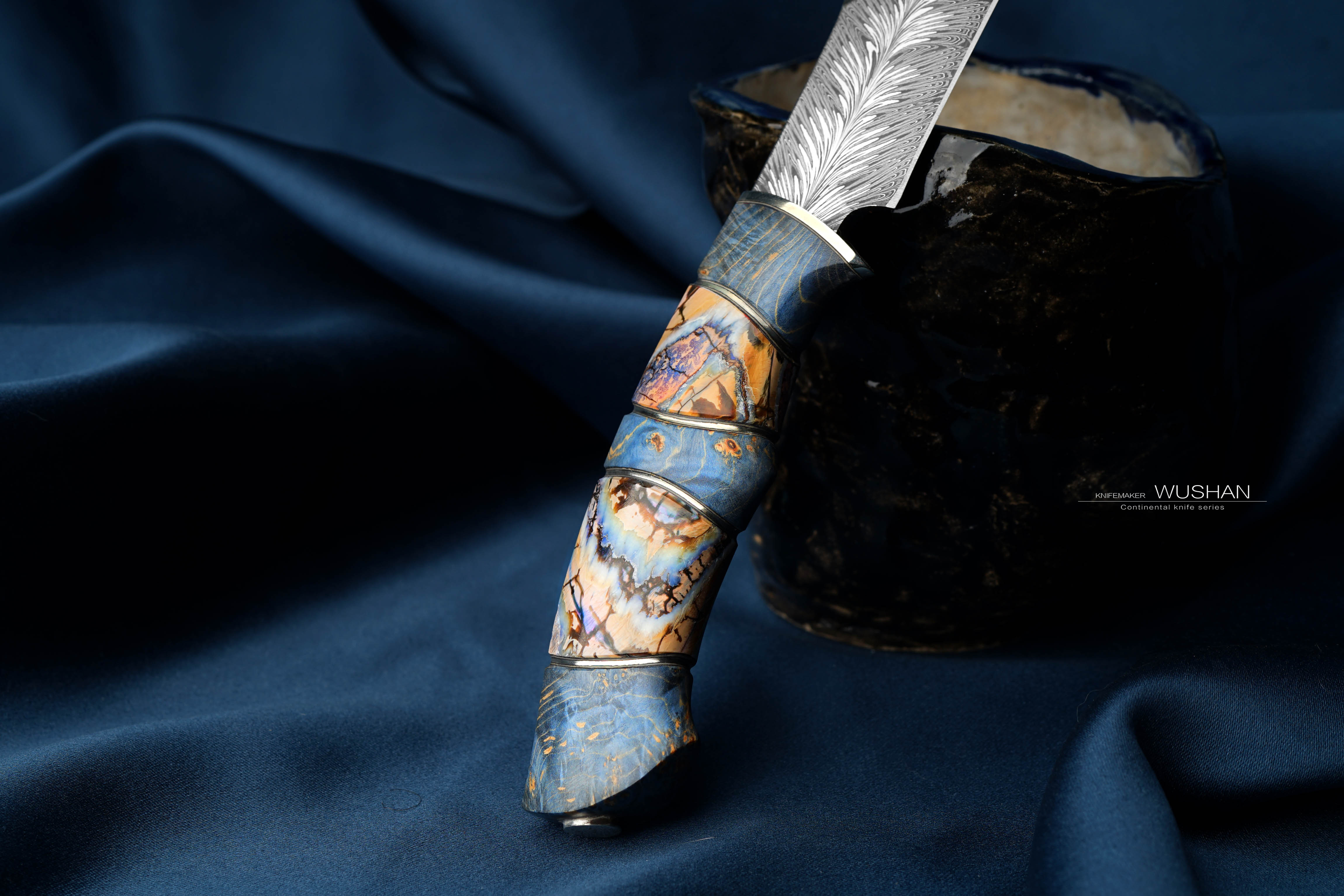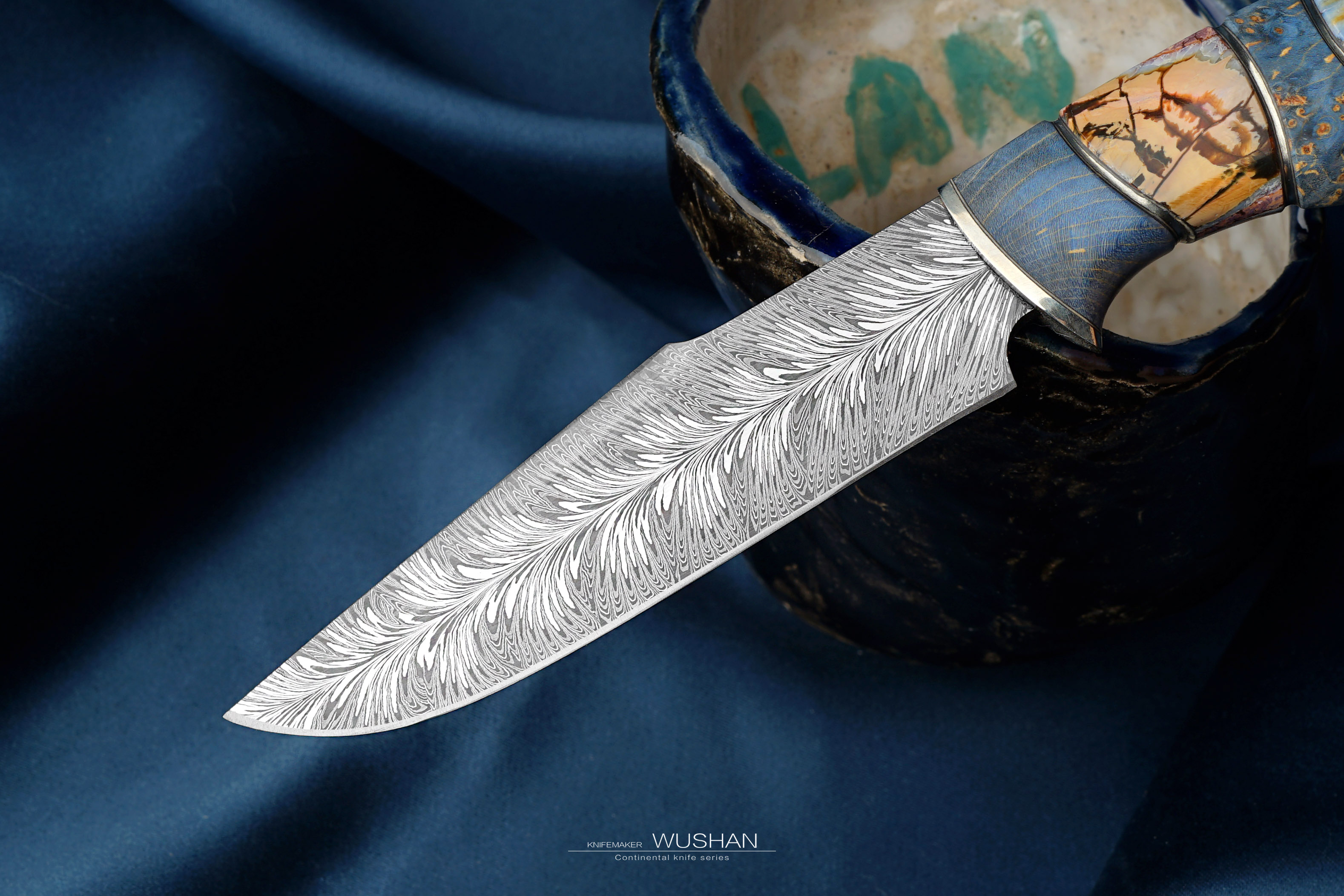 这只是特殊钢材版本的,我们自己锻打的大马士革钢,灰白灰白非常柔顺,西伯利亚进口优质猛犸+实木柄,蓝白黄配色是这个主题的经典