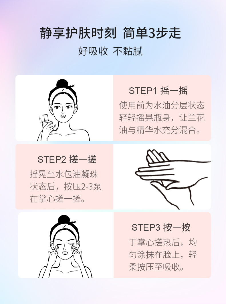 TIPS:因为兰花油静止时是水油分离的状态,所以用前一定要先摇匀。