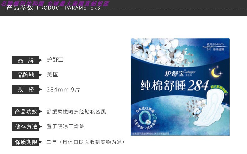 【迪丽热巴同款】WHISPER/护舒宝 纯棉舒睡夜用卫生巾284MM 9片*3JPY带授权招加盟代理
