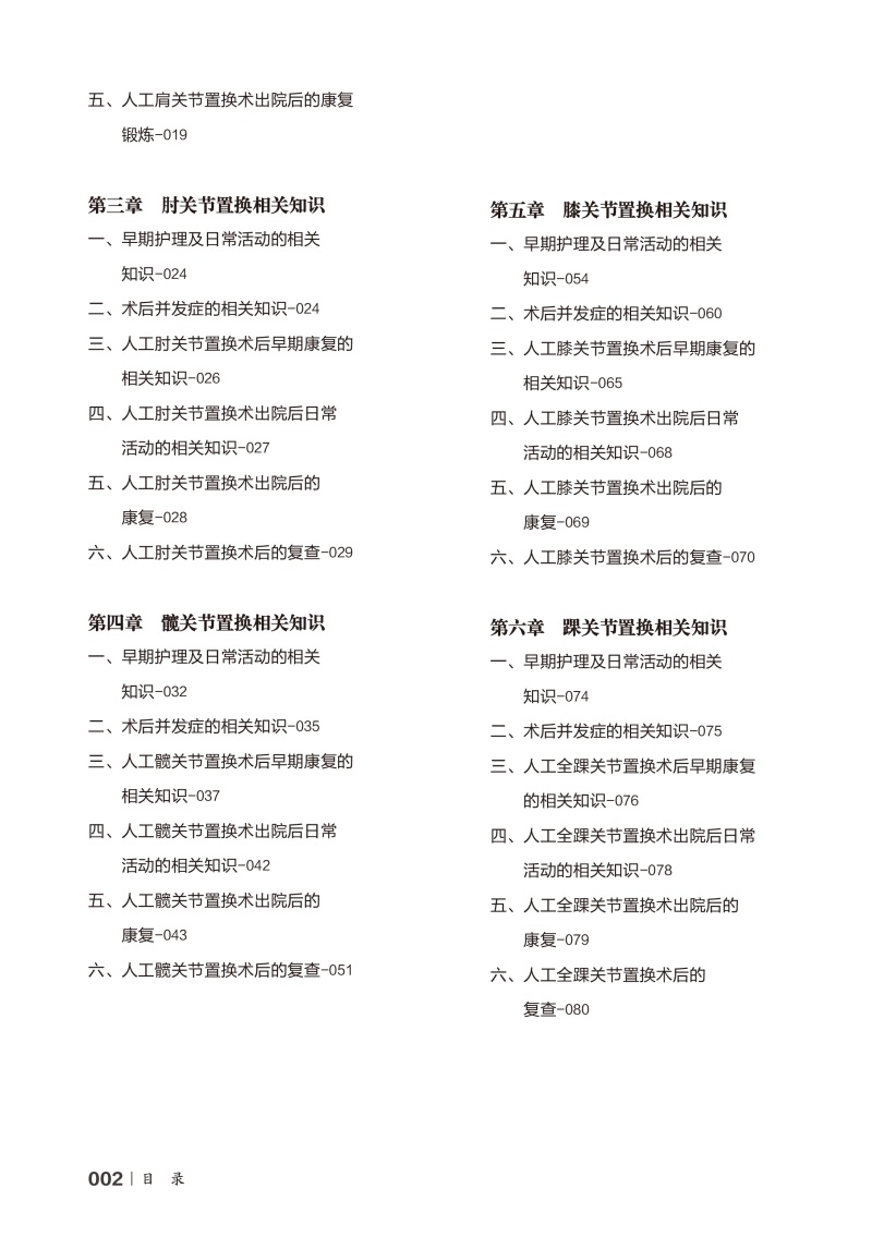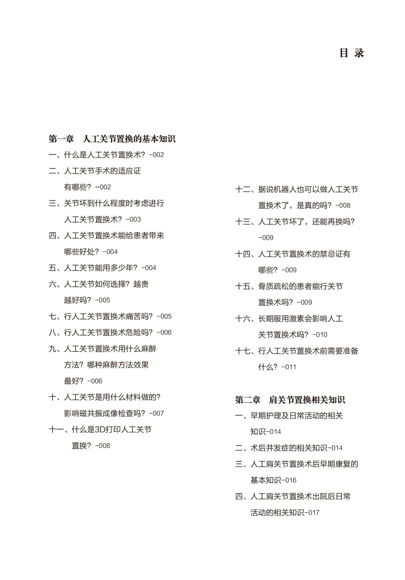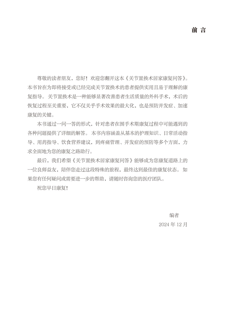 本书围绕关节置换术的居家康复问题,对髋/膝/肩关节解剖、关节置换适应证和禁忌证、手术流程及术后并发症的防治方法等进行概述,重点介绍髋、膝、肩关节置换术后院内及居家康复锻炼及护理方法,并配上精美的功能锻炼图,使读者在了解自身疾病及其治疗方法的同时,可以按图索骥寻找到合适的术后康复方案,旨在为即将接受或已经完成关节置换术的患者提供实用且易于理解的康复指导。通过一问一答的形式,针对患者在围手术期康复过程中可能遇到的各种问题提供了详细的解答。
