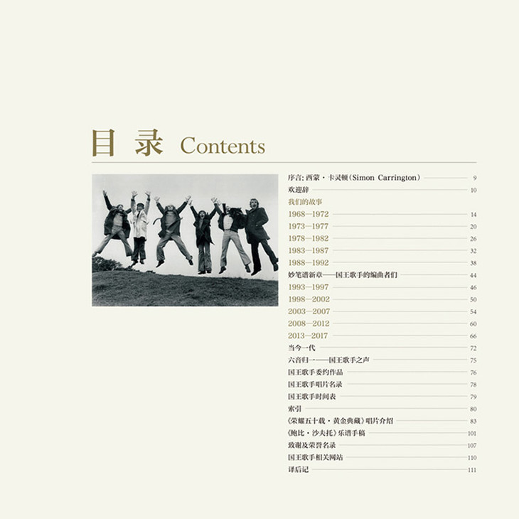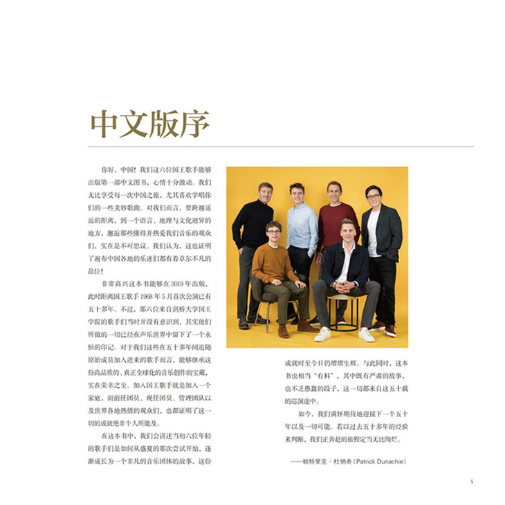 你好,中国!我们这六位国王歌手能够出版第一部中文图书,心情十分激动。我们无比享受每一次中国之旅,尤其喜欢学唱你们的一些美妙歌曲。对我们而言,要跨越遥远的距离,到一个语言、地理与文化迥异的地方,邂逅那些懂得并热爱我们音乐的观众们,实在是不可思议。我们认为,这也证明了遍布中国各地的乐迷们都有着卓尔不凡的品位!