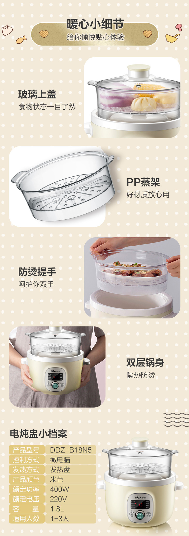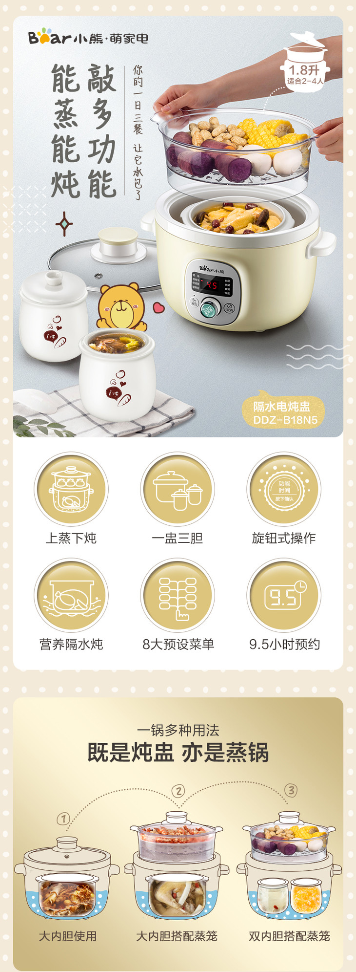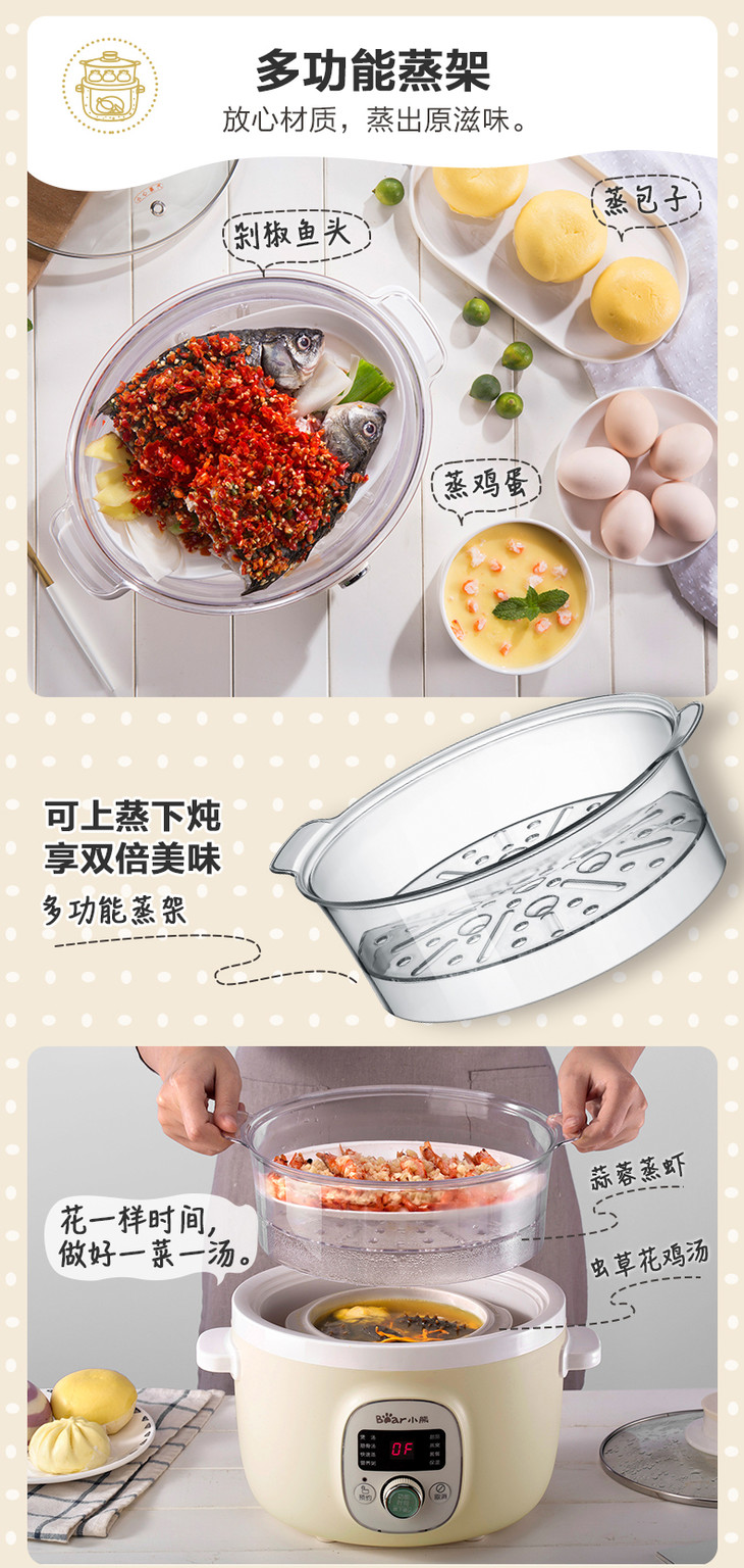 Bear/小熊 DDZ-B18N5电炖锅家用自动多能蒸锅煲汤煮粥小炖锅1-3人