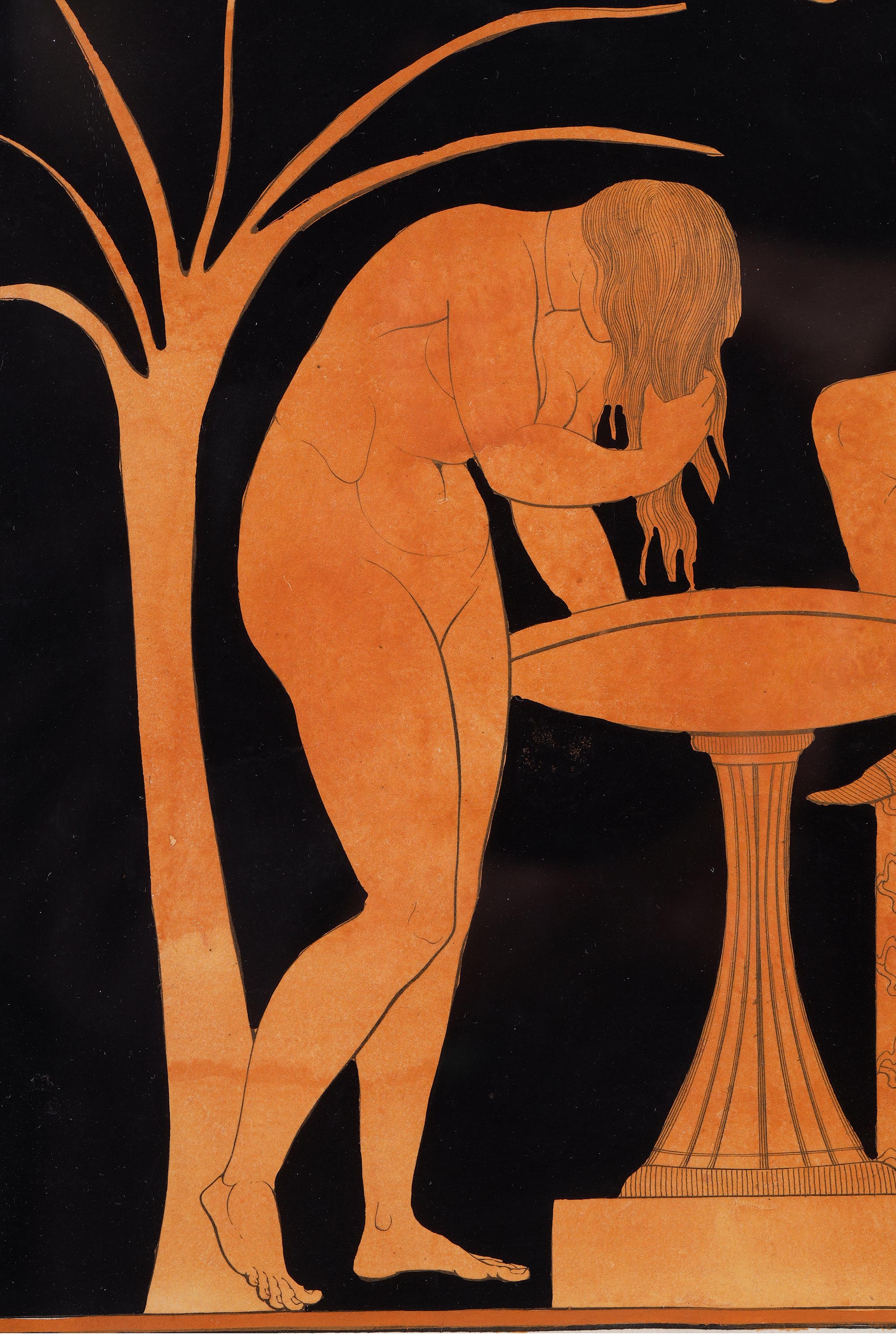 18世纪德国画家约翰·海因里希·威廉·蒂施贝创作古典神话主题水彩蚀刻版画《两位女子在萨堤尔注视下沐浴》