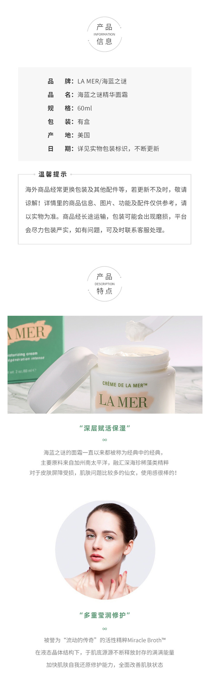 (LA MER)海蓝之谜修复精华面霜 60ml 补水保湿滋润 有效期 26年尾
