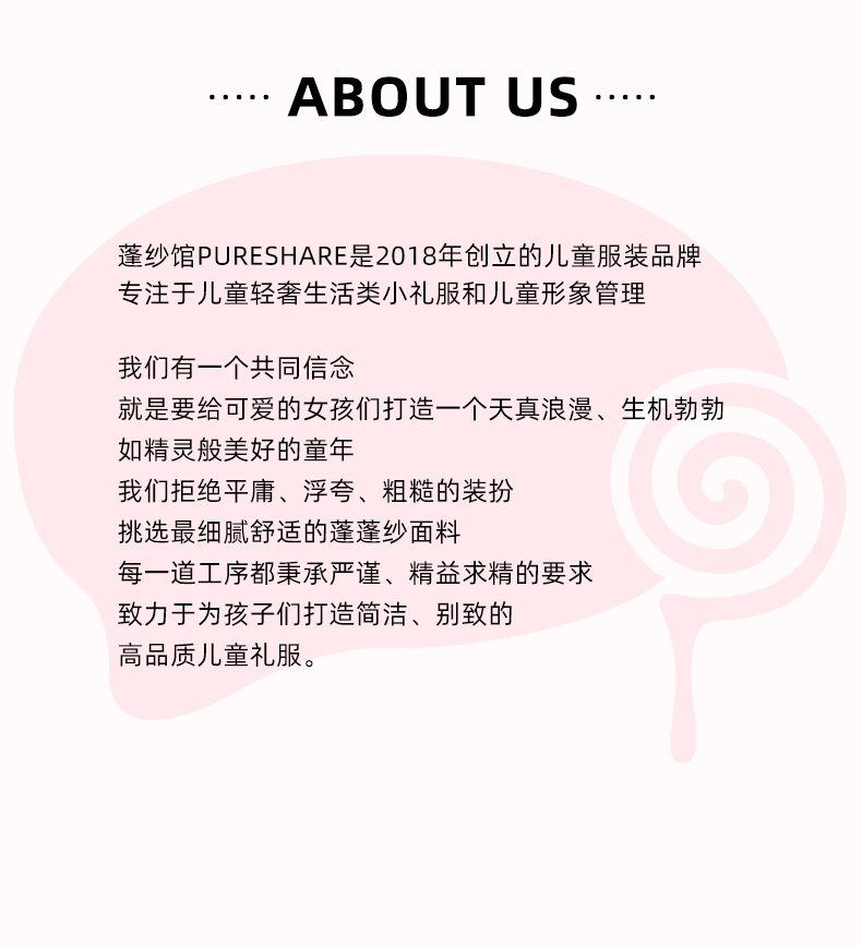 PureShare蓬纱馆,2018年创立的儿童服装品牌,专注于儿童轻奢生活类小礼服,主张“让孩子做最独特的自己”的品牌理念,为孩子们提供时尚简洁、优雅而又不失童真的生活类礼服。