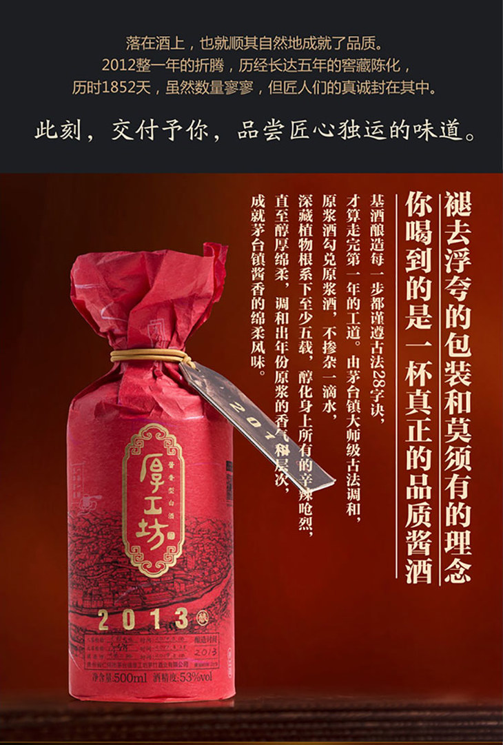 厚工坊2013工道原浆酱香白酒53度500ml/1瓶/2瓶/6瓶整箱