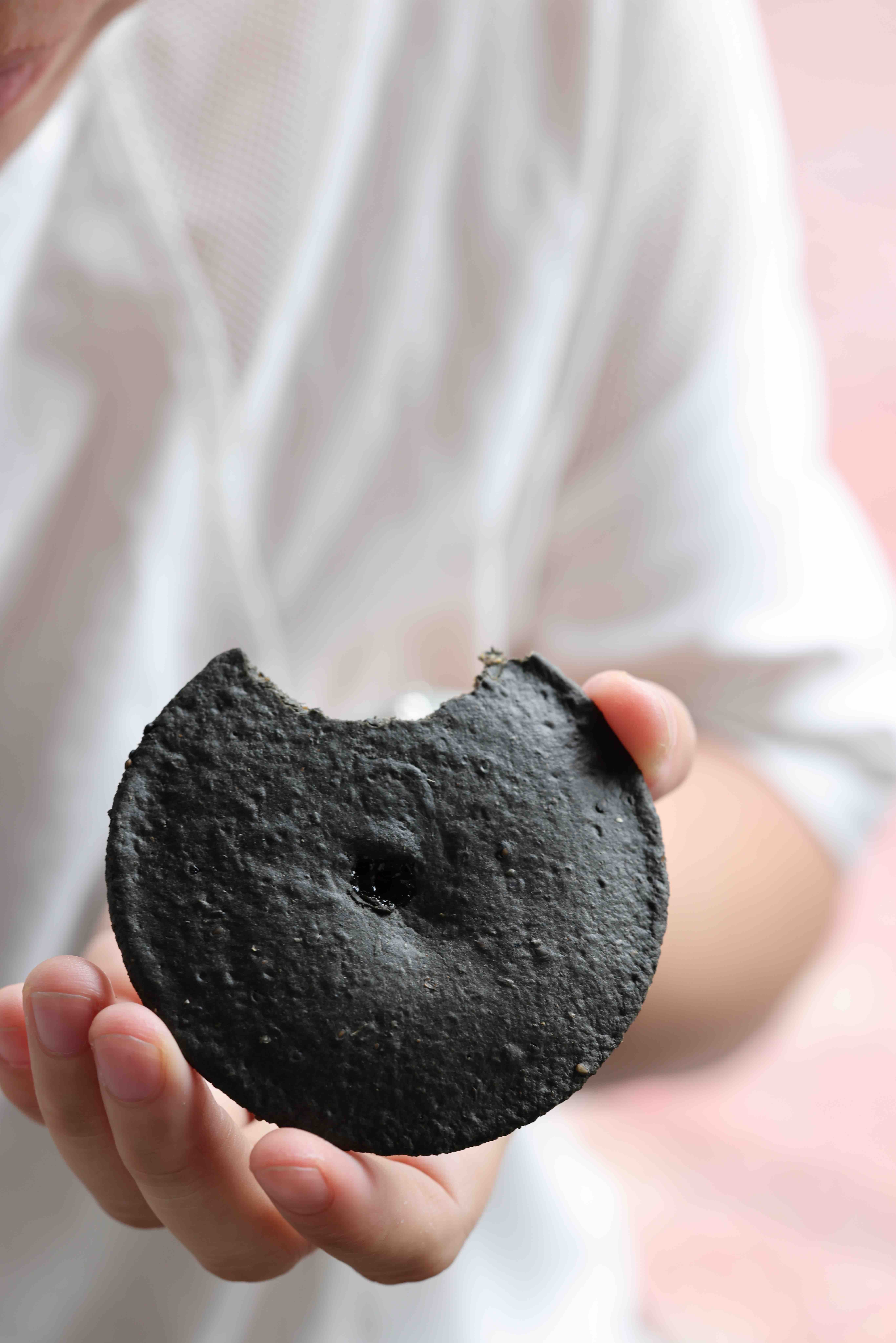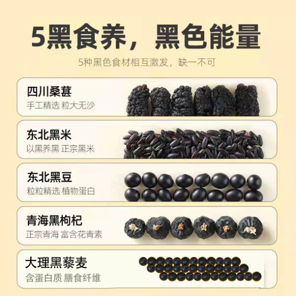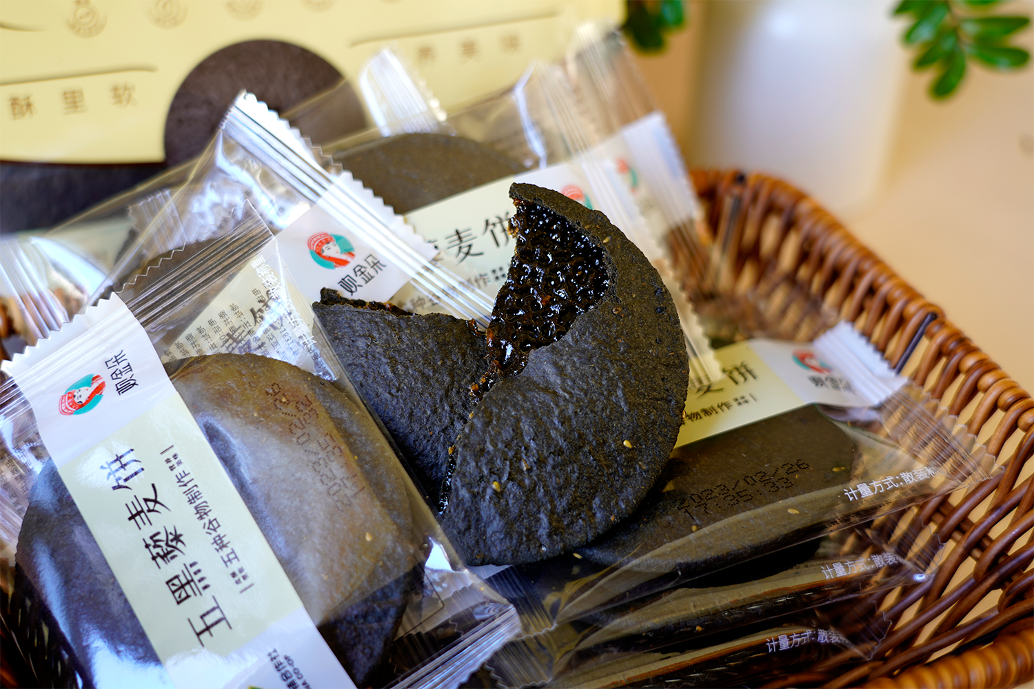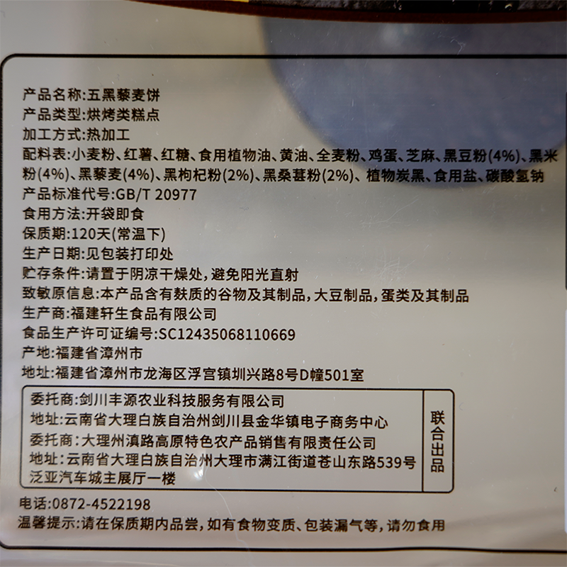 【配料表】:小麦粉、红薯、红糖、食用植物油、黄油、全麦粉、鸡蛋、芝麻、黑豆粉(4%)、黑米粉(4%)、黑藜麦(4%)、黑枸杞粉(2%)、黑桑葚粉(2%)、植物炭黑、食用盐、碳酸氢钠