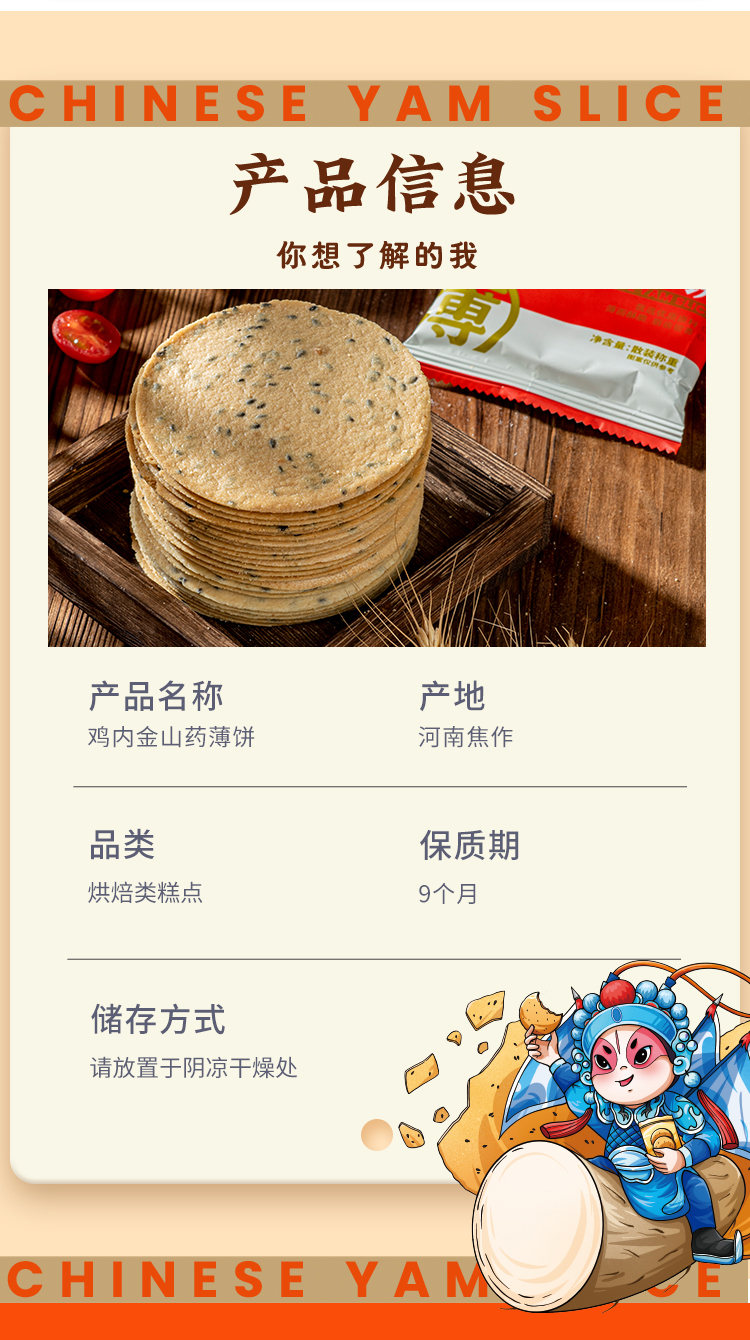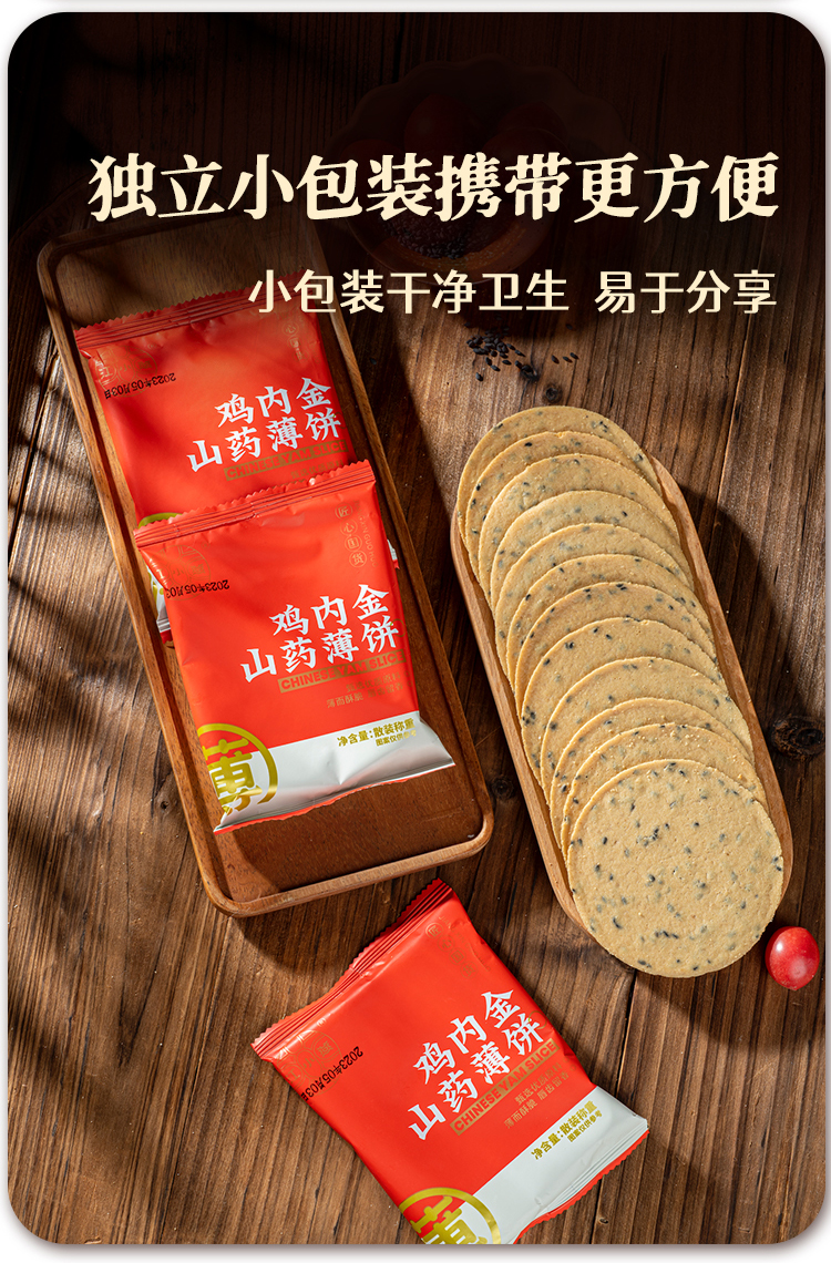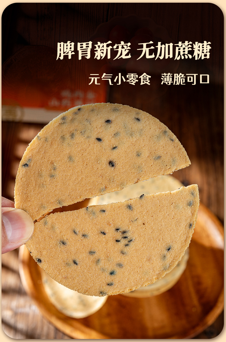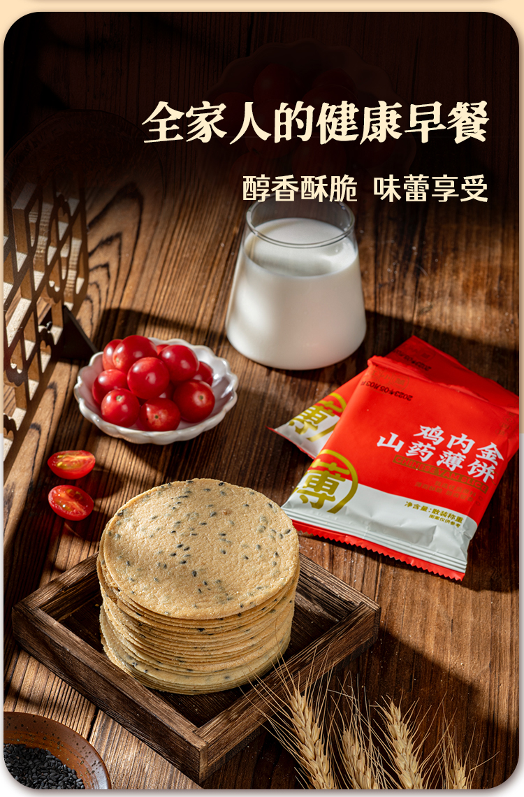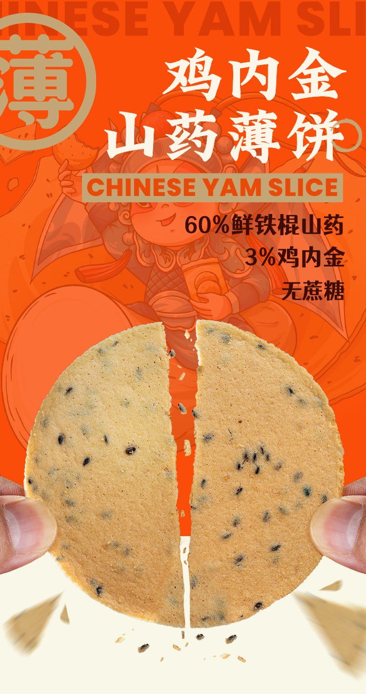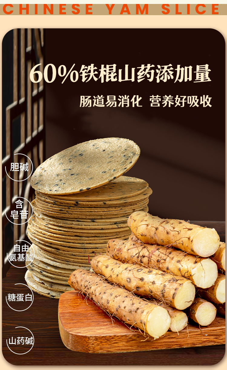 【配料表】鲜铁棍山药(含量≥60%)全麦粉,鸡内金3%,黑芝麻,大豆油,食用盐。