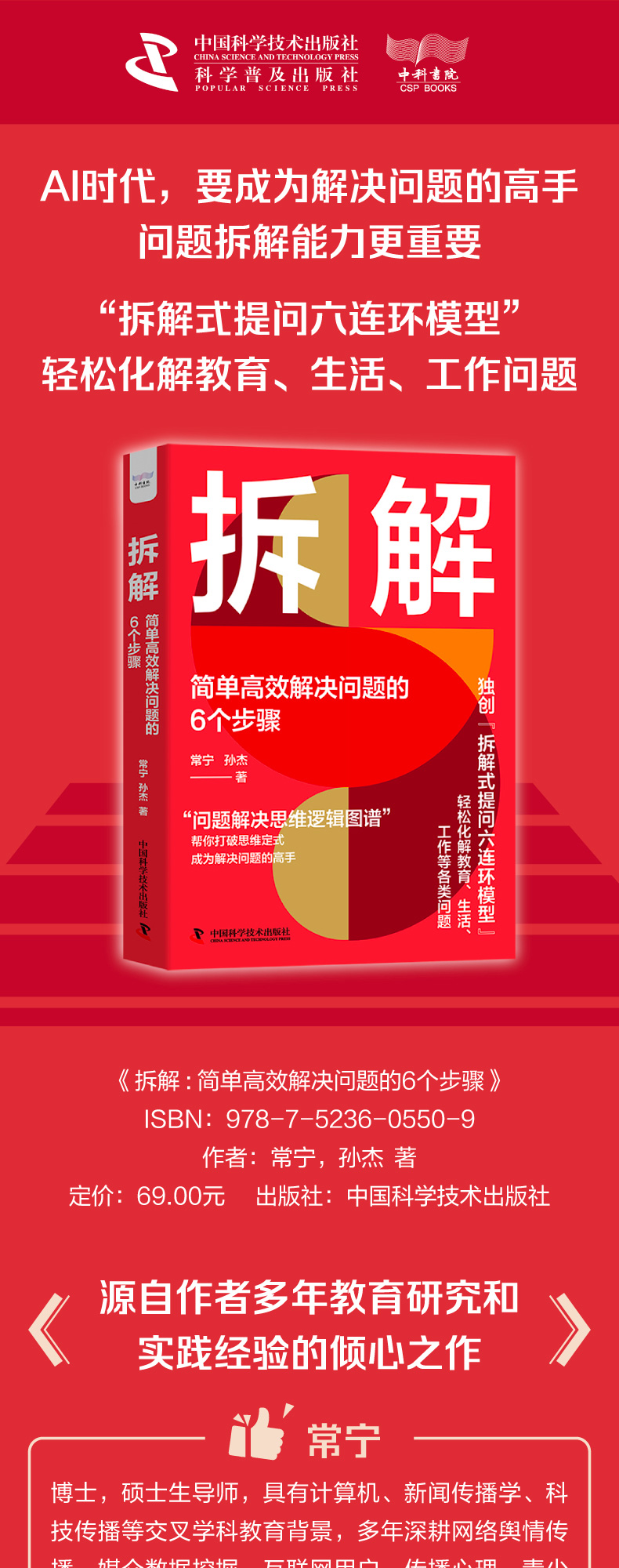 发现问题比解决问题更为重要!更确切地说,发现真正的问题并条理清晰地将其提出,才能开启解决问题的道路。然而,我们在成长过程中接受的教育大多崇尚“答案”,我们缺少的正是“探寻答案”的思维过程。我们总是渴望一步到位获得“解决问题的方案”(答案),却往往陷入“不知道解决什么问题”的迷雾之中。为了解决问题和实现创新,我们需要从发现问题开始,逐步走向解决问题的路径,并在寻找解决方案的过程中实现小步迭代式创新和最终的大创新。然而,这条寻求解决问题(创新)的道路充满了挑战,因为我们常常被表象问题、错综复杂的关系和琐碎的细节所困扰,无法准确地找到切入点。那么如何快速发现最核心的本质问题,开启解决问题的道路呢?这就是《拆解》作者要给大家的答案。