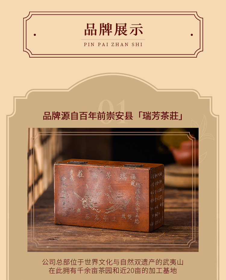 武夷瑞芳茶號,創建於一八九九年,由江氏制茶泰斗,江泰源先生於武夷山原崇安縣碼頭創辦,爲清末著名茶坊,在当地地方志中會記載,飮武夷山茶,瑞芳上品也。