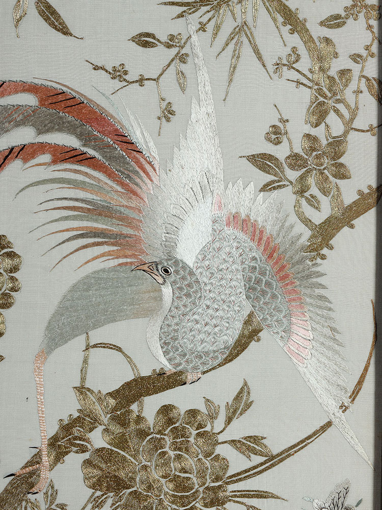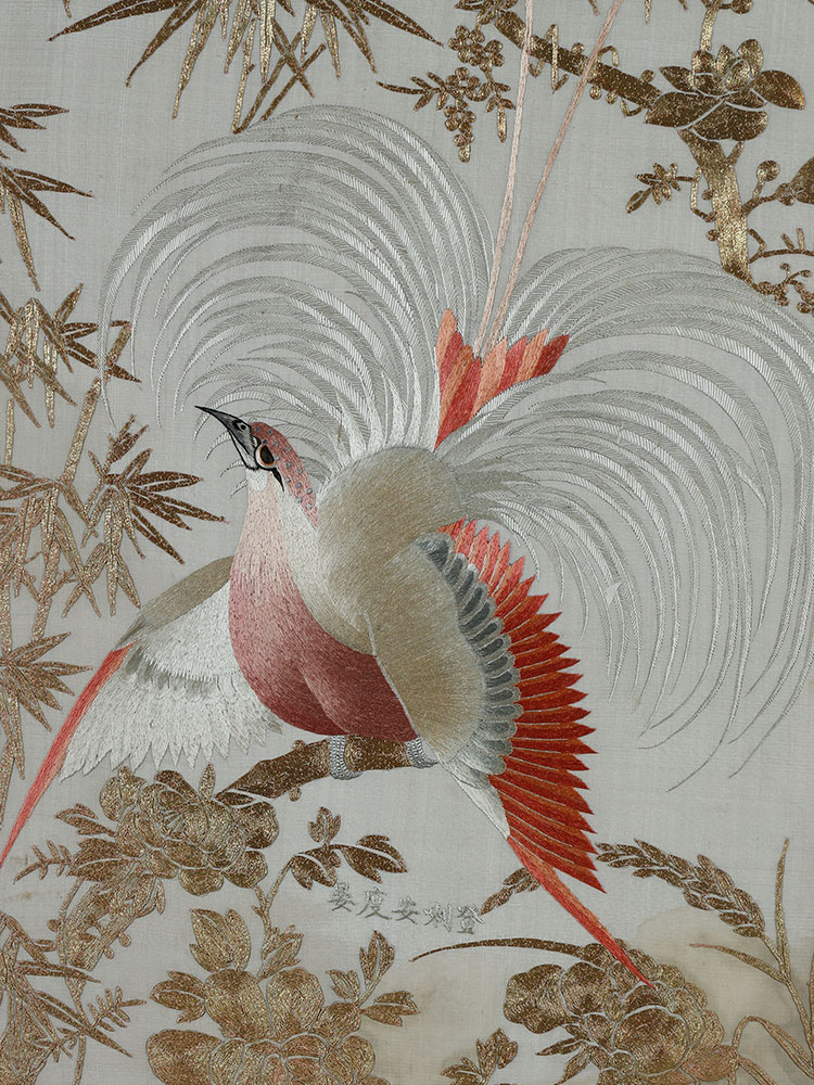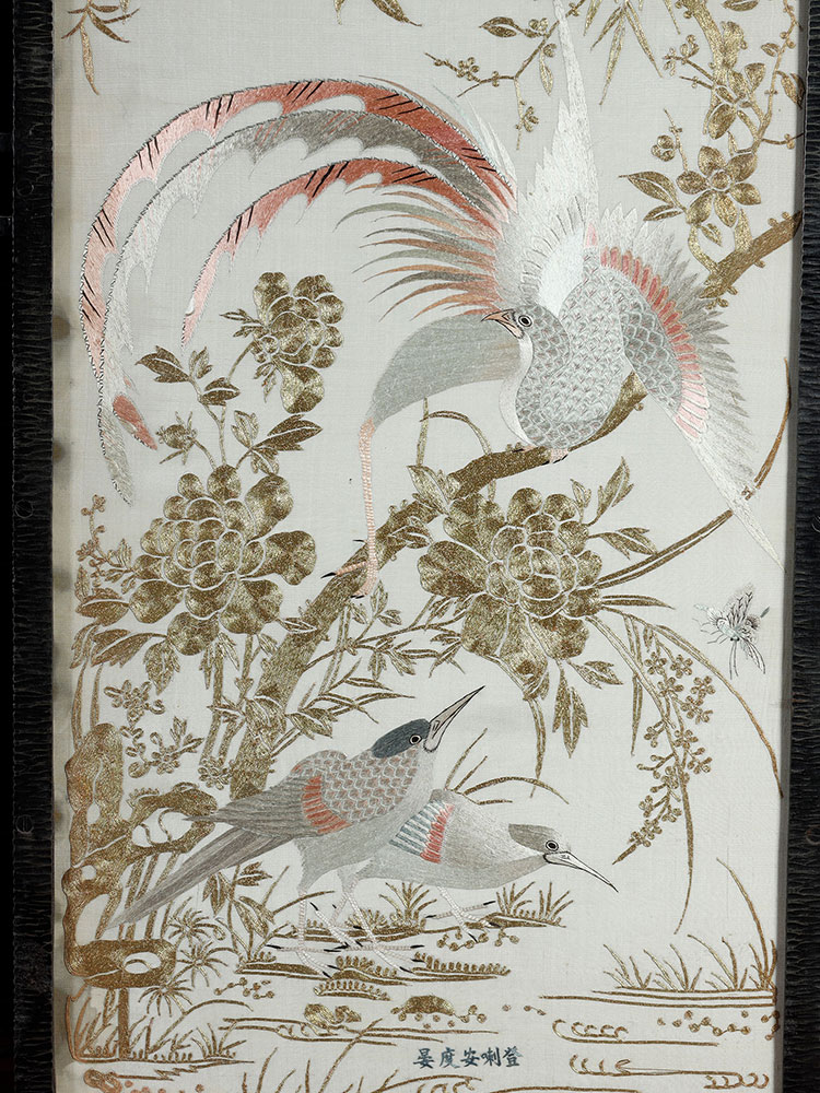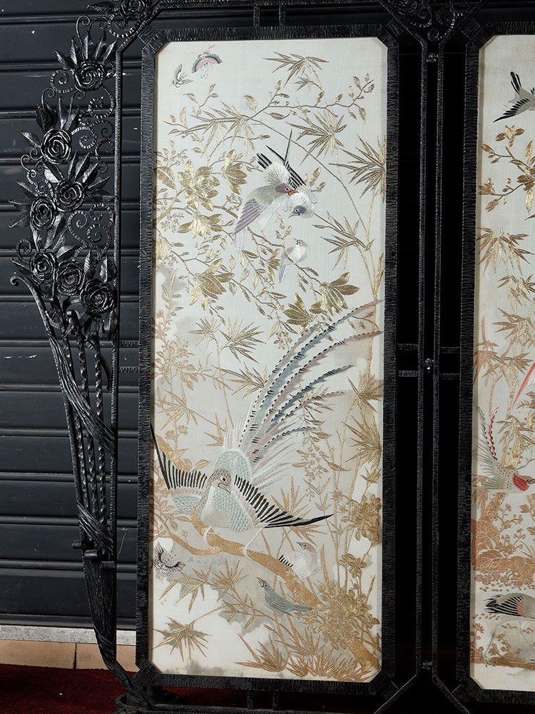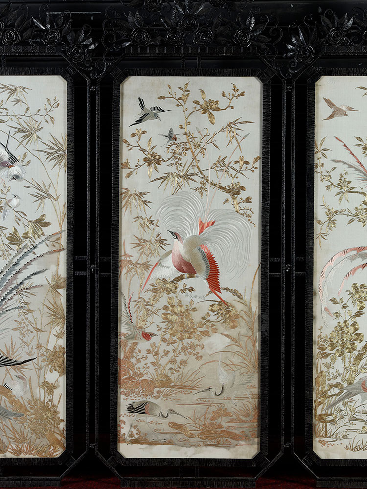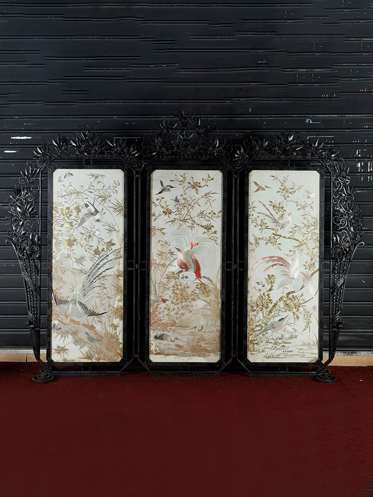 19世纪中国出品传统「五伦图」主题白缎地粤绣屏风