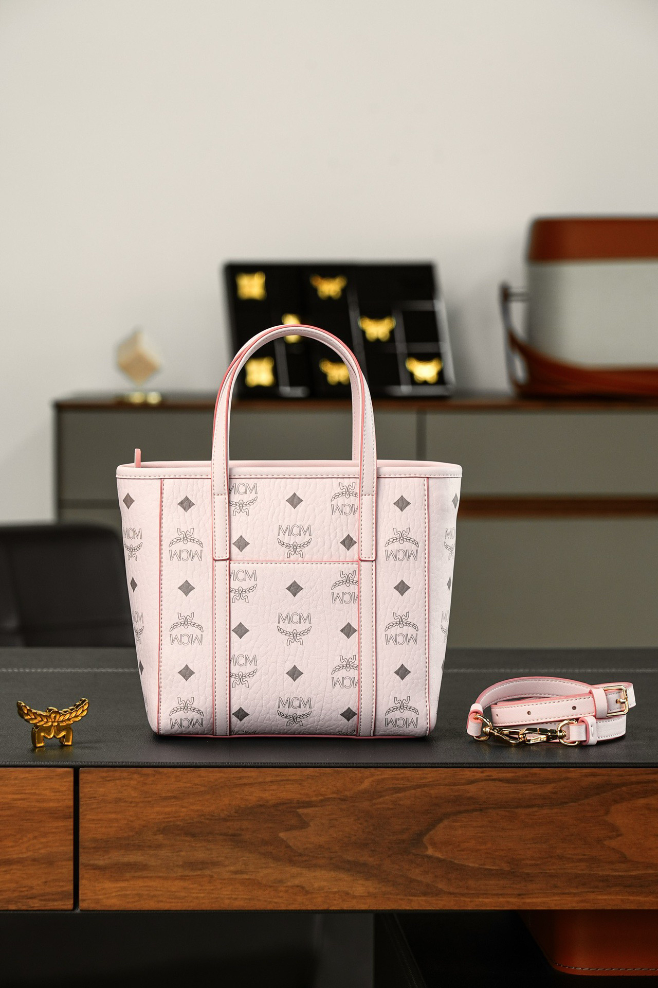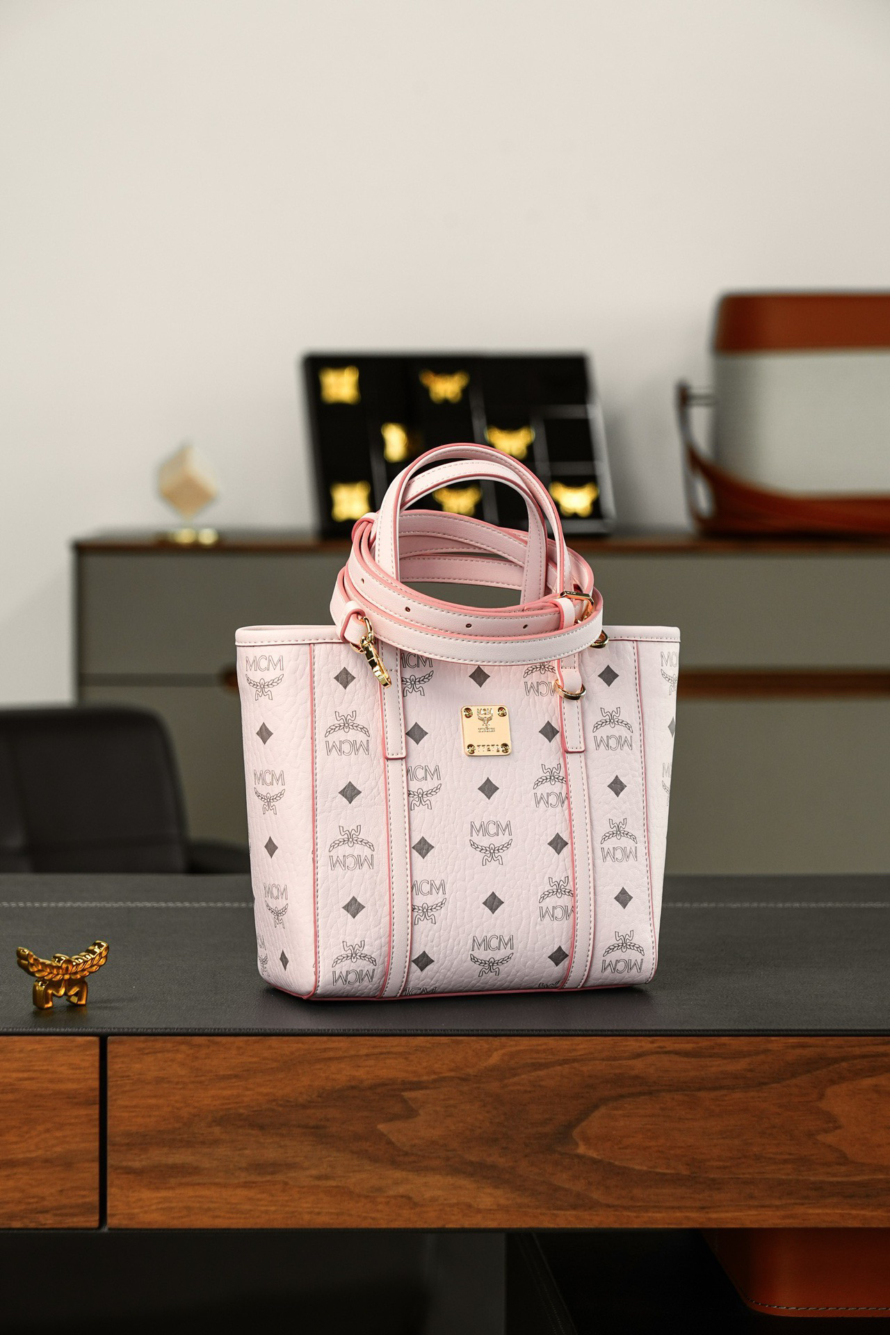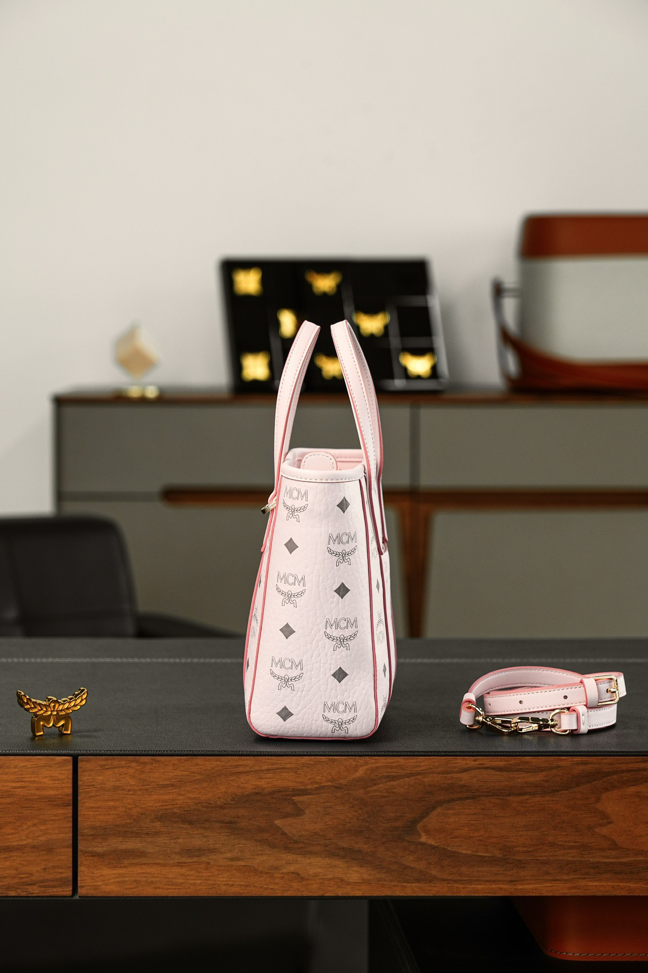 秋冬特惠💰760 原单MCM 原厂皮 经典菜篮子购物袋MWPAATN04QH001 轻雾粉色