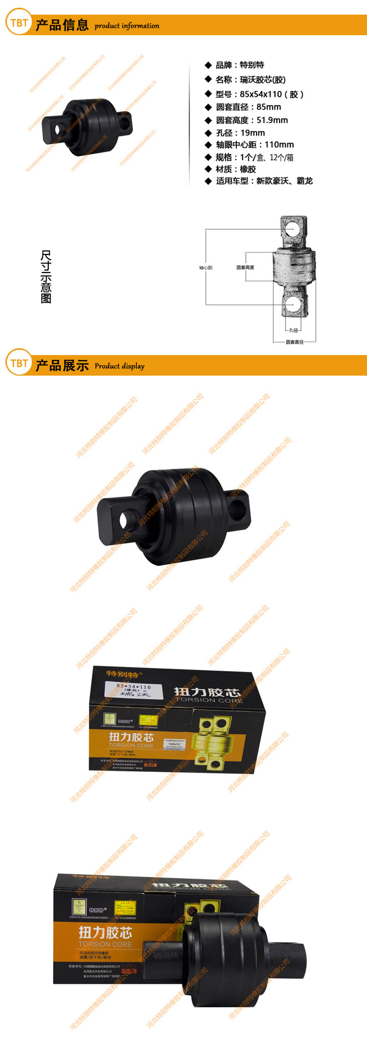 | 瑞沃扭力胶芯、霸龙扭力胶芯85*54*110(胶)(孔19)(高51.9)(单价=1个,12个=1箱)/瑞沃拉臂套、霸龙拉臂套/瑞沃拉力套、霸龙拉力套85x54x110(8554110) |