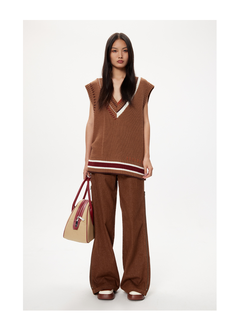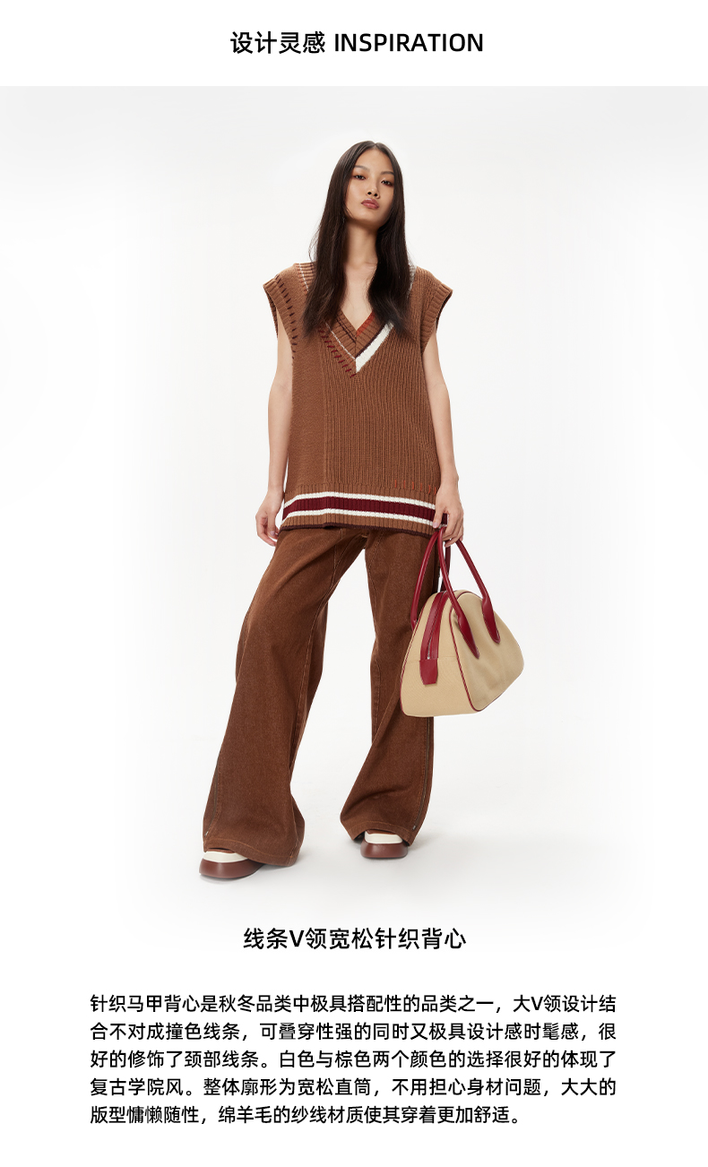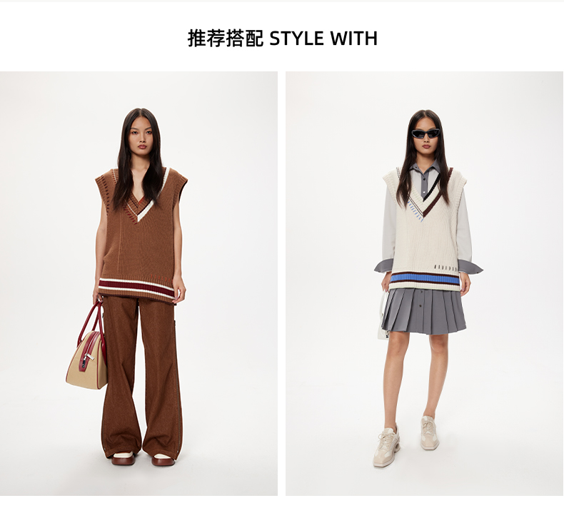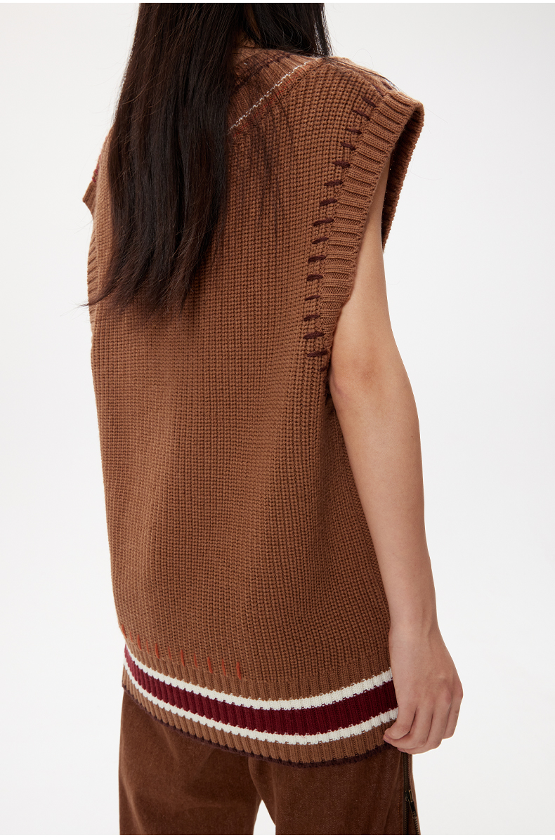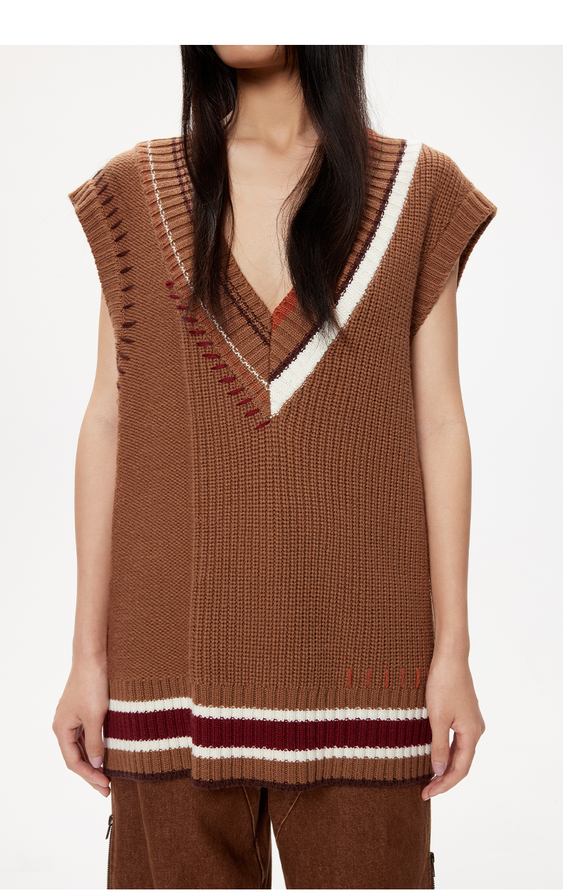 [福利价]lost in echo秋冬季美拉德复古撞色线条V领宽松针织背心毛衫马甲
