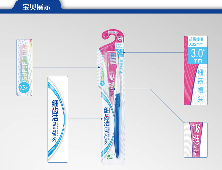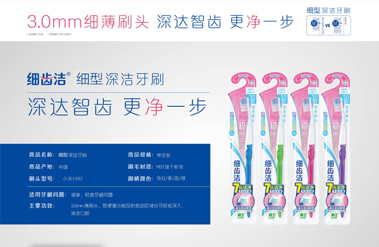 狮王 ( Lion )细齿洁深洁牙刷XS型 品牌:狮王<br> 产地:中国山东<br> 品名:狮王 ( Lion )细齿洁极细深洁牙刷XS型<br> 特点:3.0mm薄刷头,清洁口轻。<br> 保质期:无<br> |