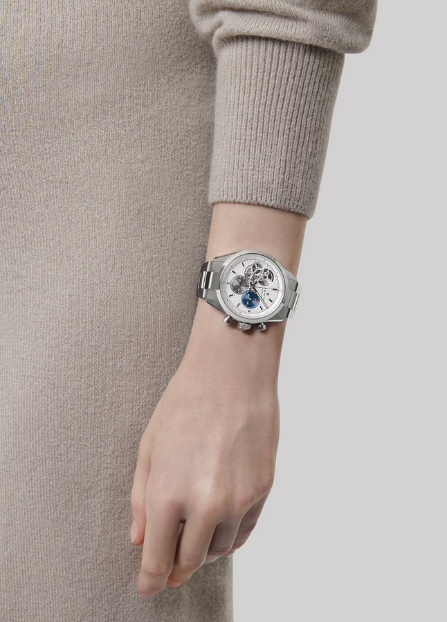 镜面 材质 | 蓝宝石水晶玻璃 | 表盘 | 精钢表壳 哑光银色表盘,搭配两个不同颜色的计时盘和一个合成水晶计时盘,时标和指针镀铑刻面,涂覆SuperLuminova SLN C1超级夜光物料 计时 背透 |