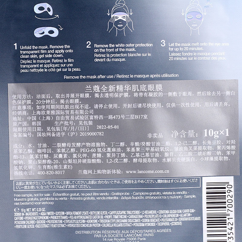 【爆款超低价预售 急单慎拍】兰蔻全新精华肌底眼膜10g 小黑瓶大眼眼膜贴 去黑眼圈1对装 舒缓