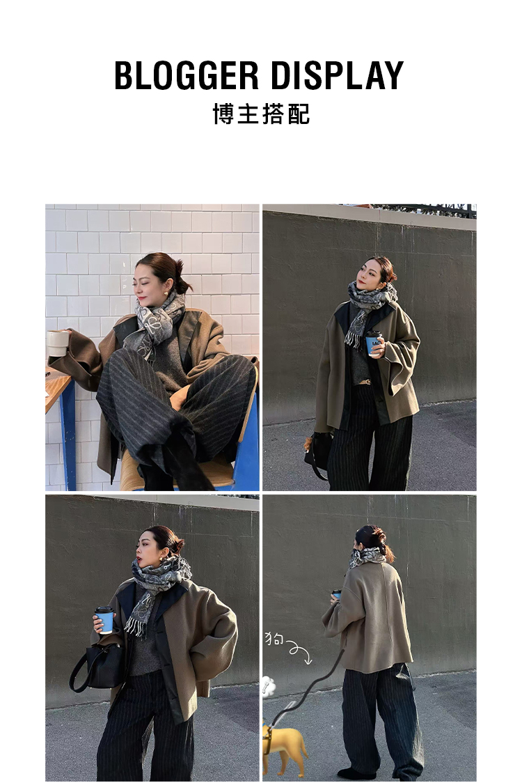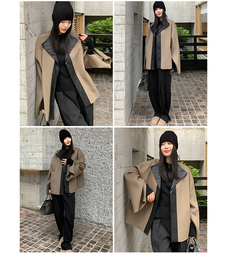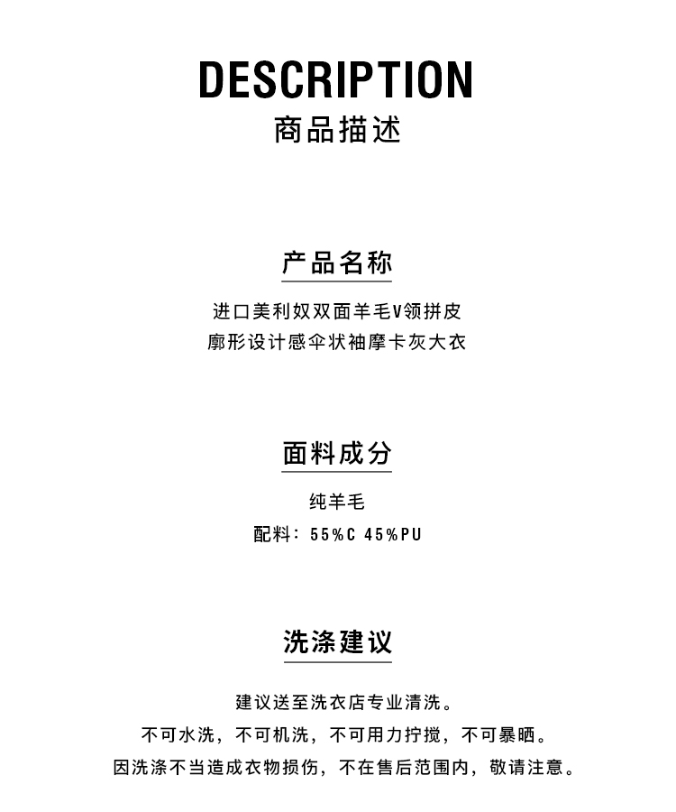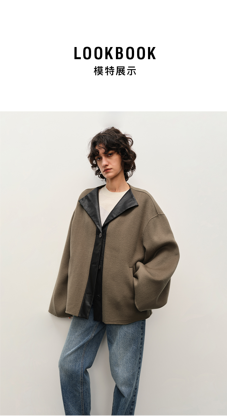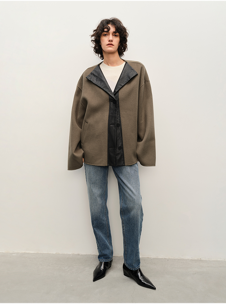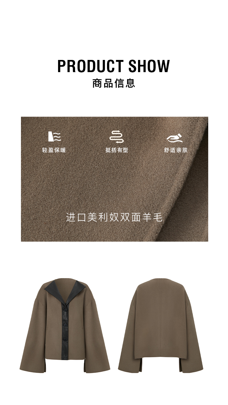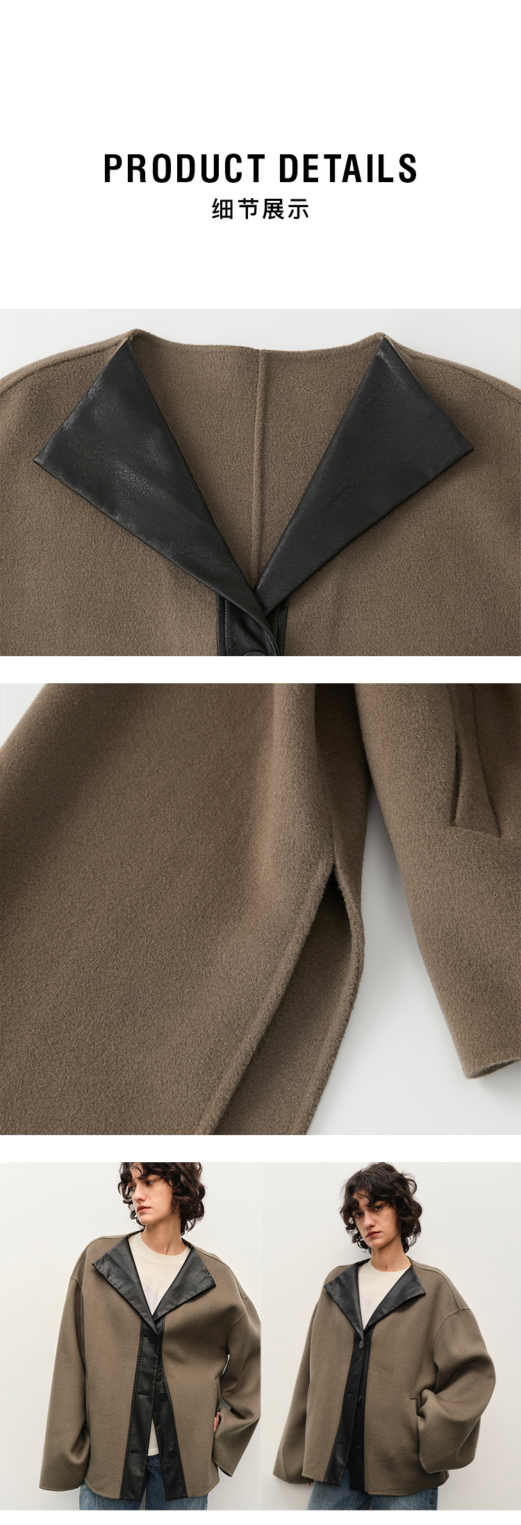 HIDEMI 进口美利奴双面羊毛V领拼皮廓形设计感伞状袖摩卡灰大衣