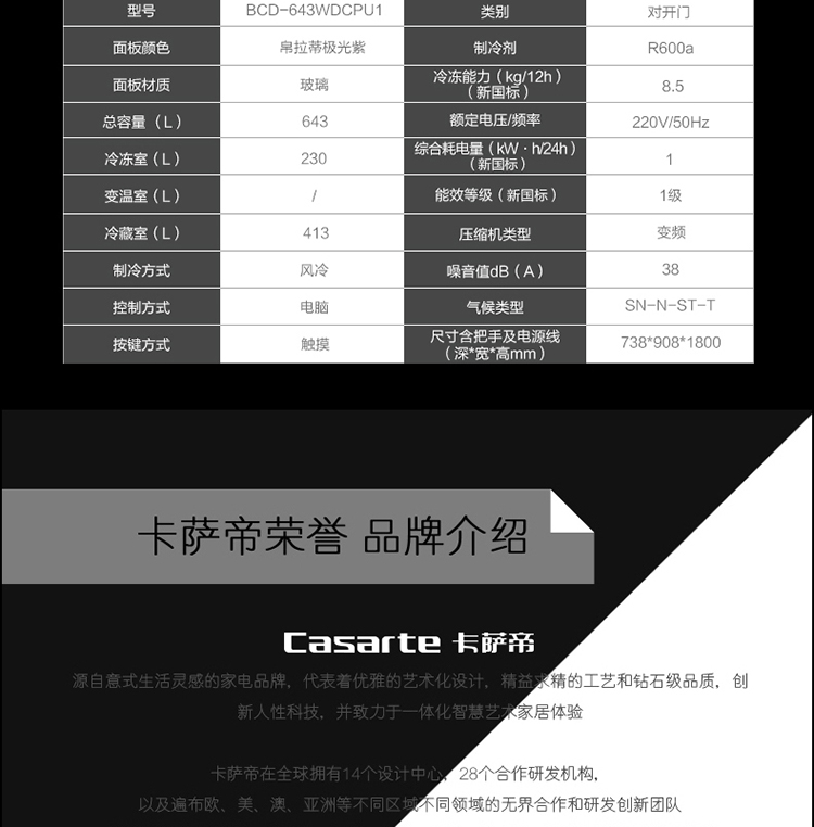 海尔(202443)Casarte卡萨帝冰箱 对开门冰箱 双变频风冷无霜 家用嵌入式双开门冰箱 智能WIFI电冰箱BCD-643WDCPU1