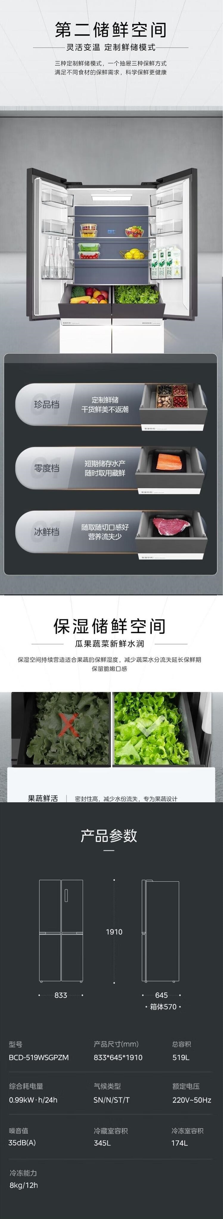 美的(Midea)(202684)十字对开门四门风冷无霜冰箱一级能效双变频智能净味零嵌底部散热 BCD-519WSGPZM 极地白