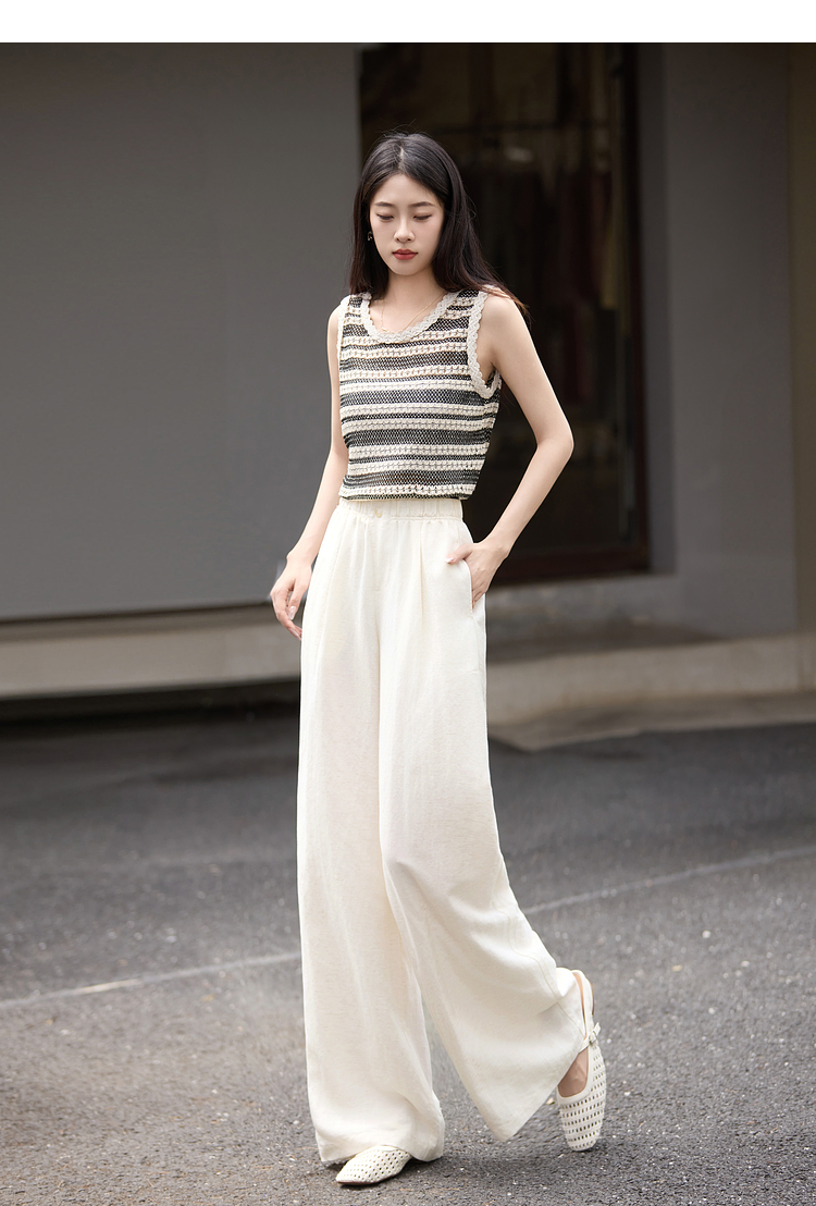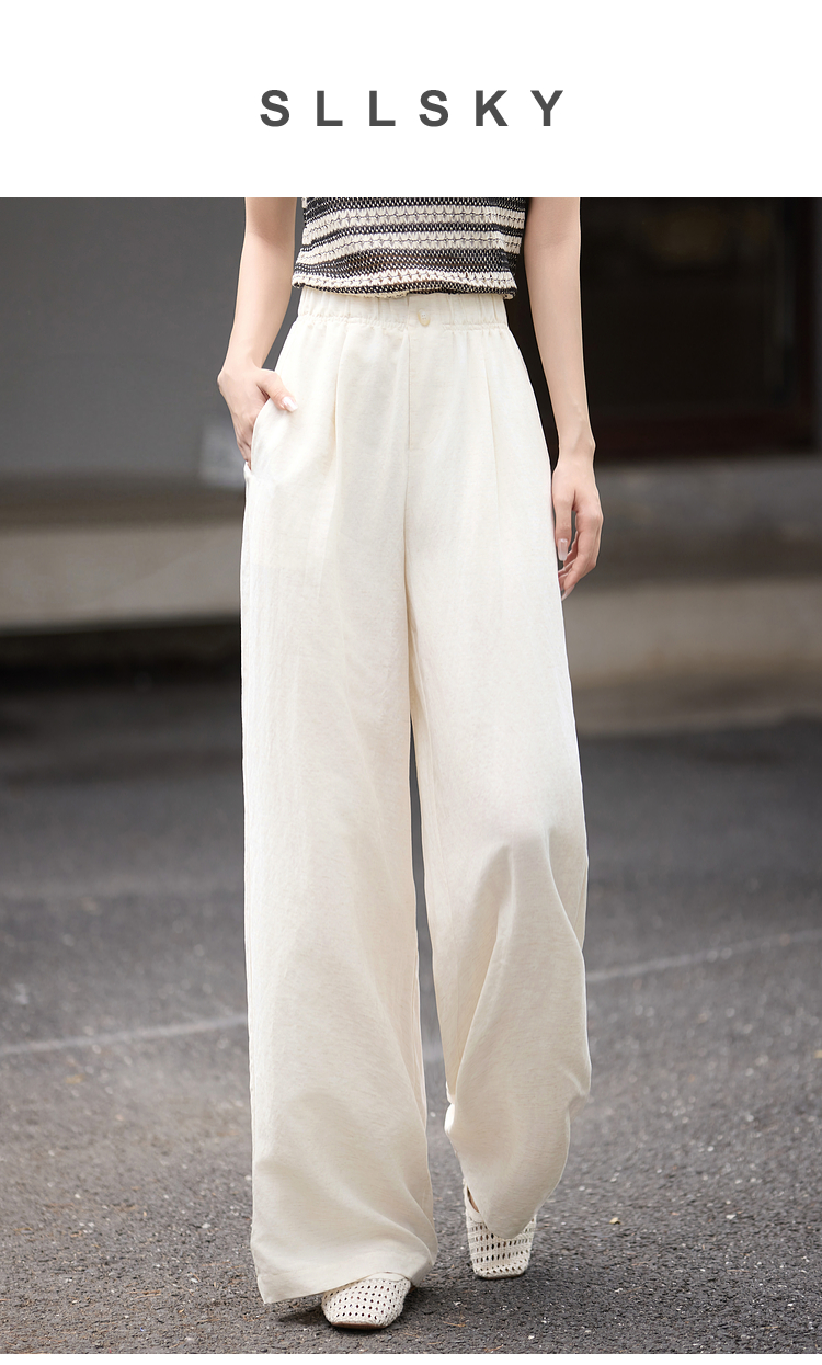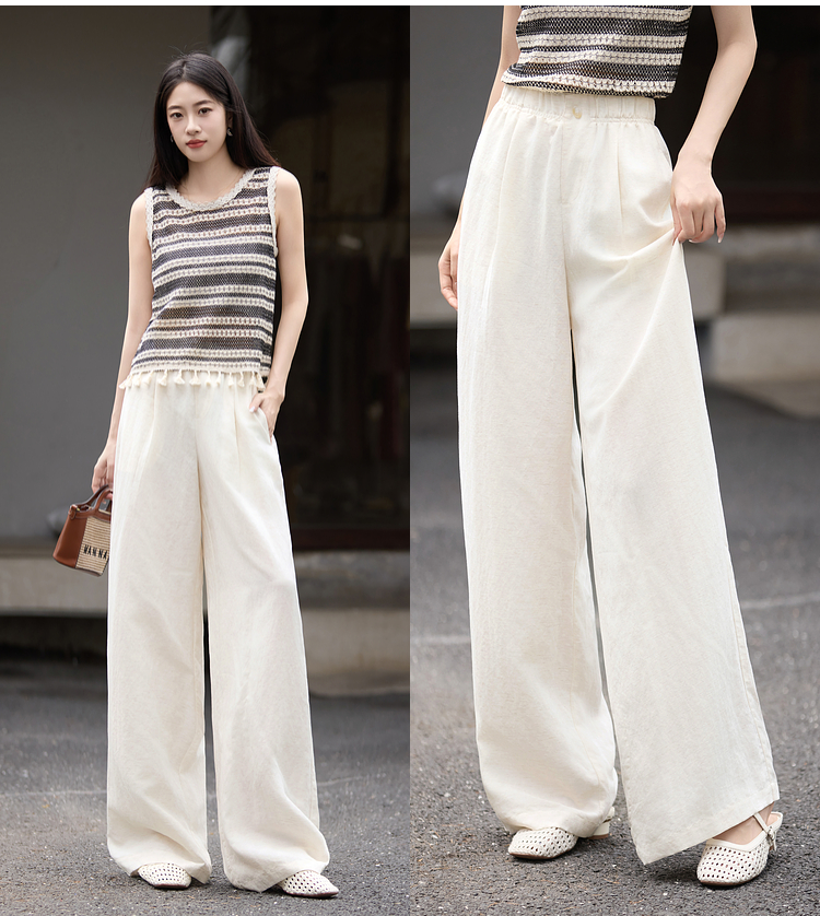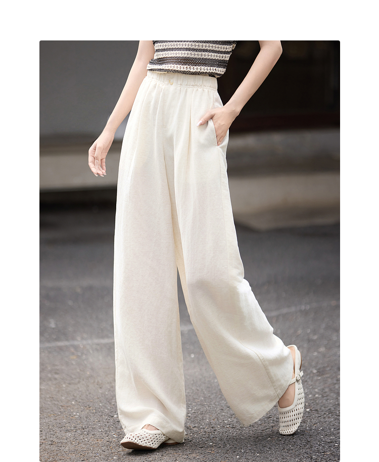 【07/30新品6.5折】熙世界通勤天丝亚麻阔腿裤女夏季薄款高腰宽松休闲直筒白色长裤子