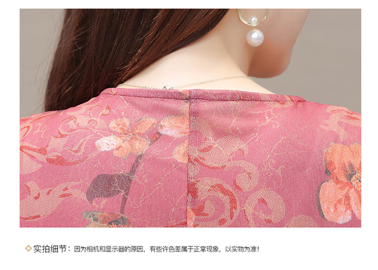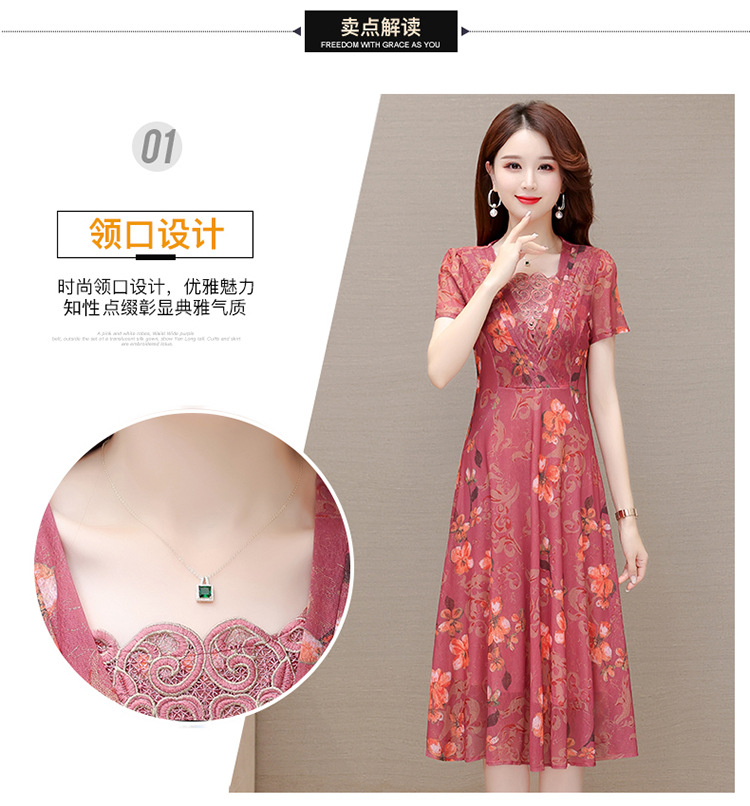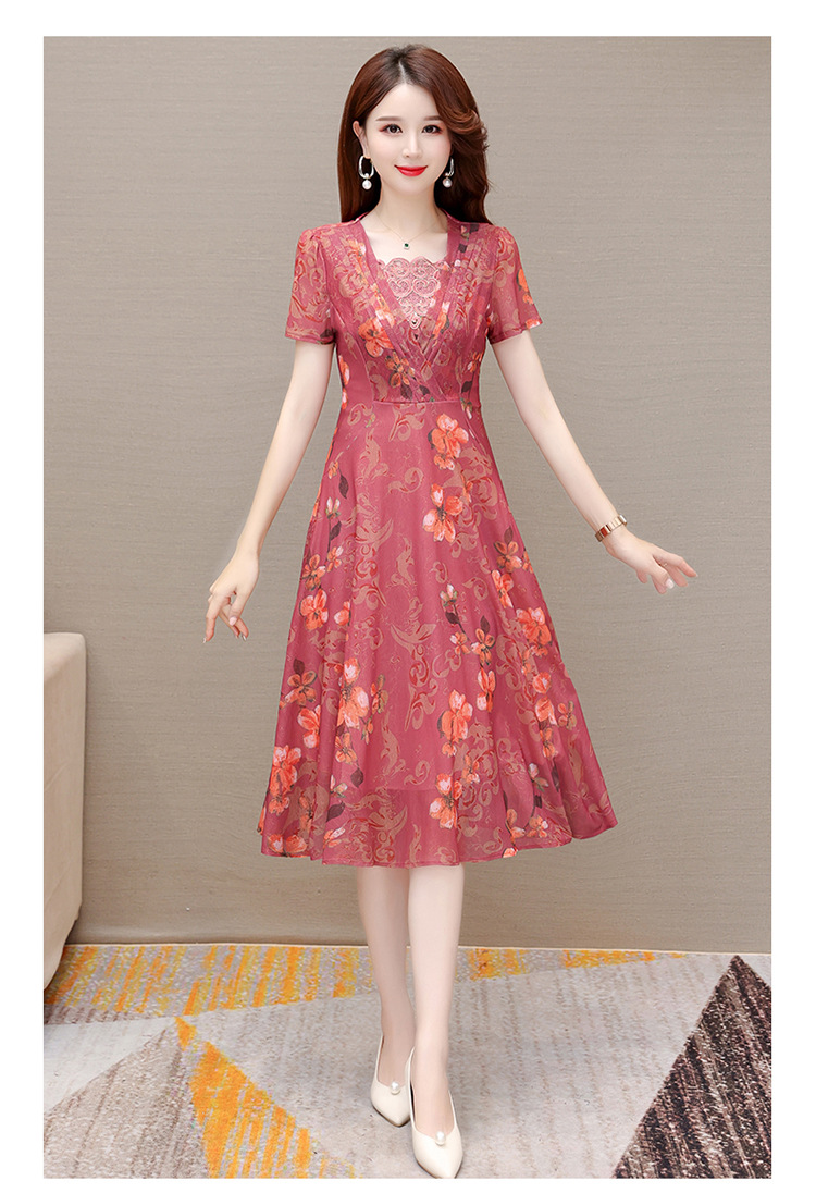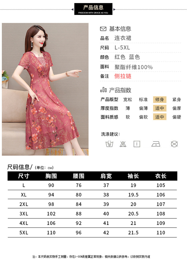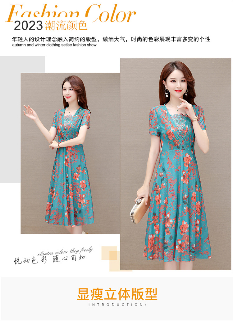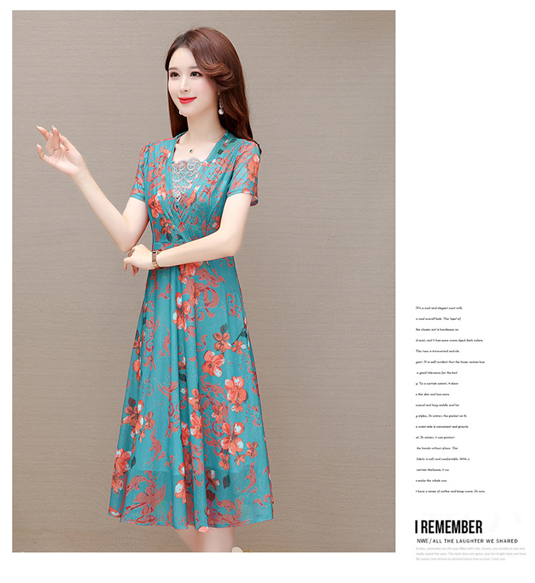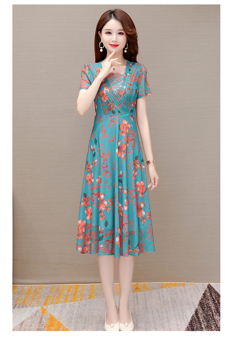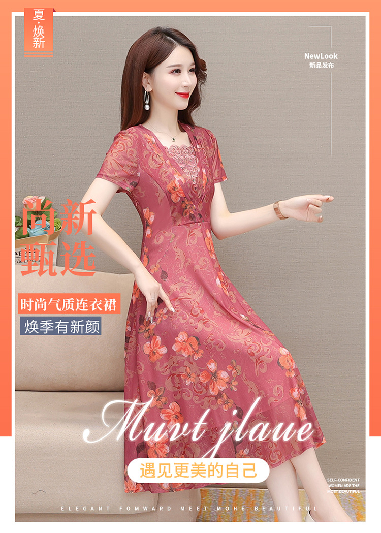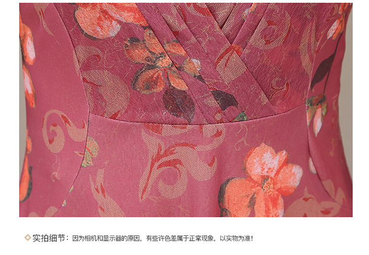 夏款印花,时尚皱褶拼接雪纺A字裙方领短袖气质修身连衣裙QYM-FL-X8829-L