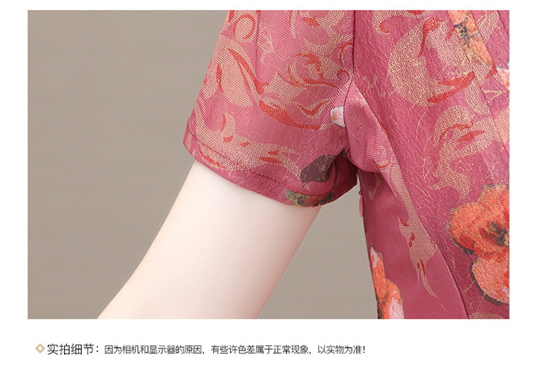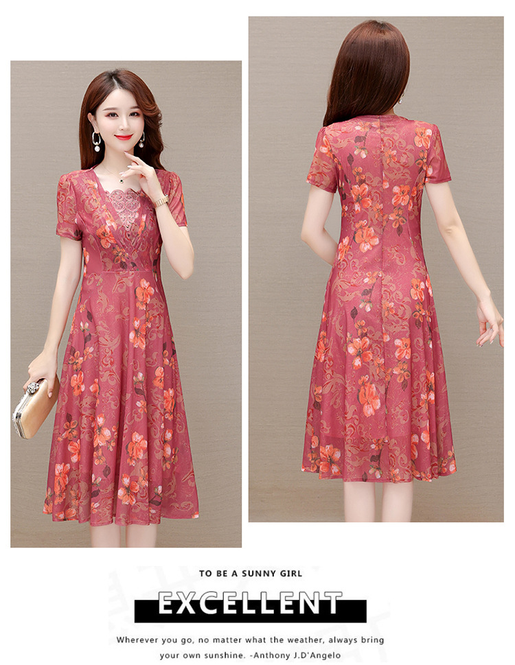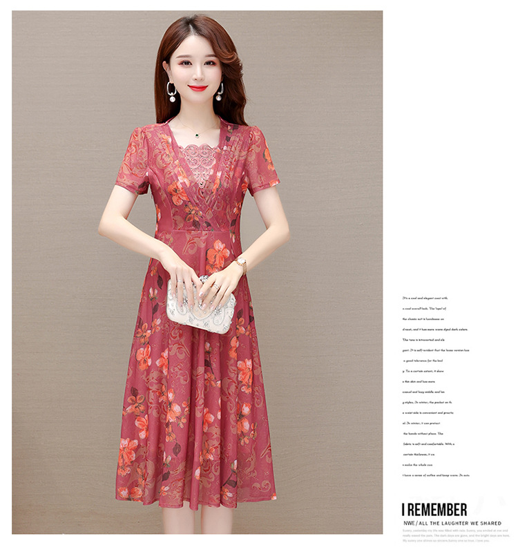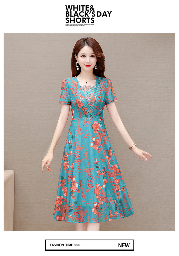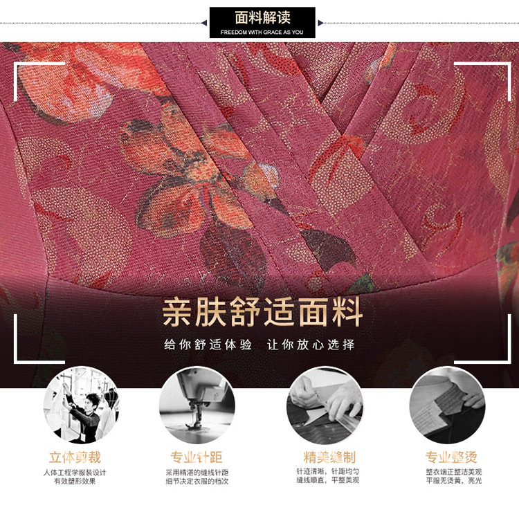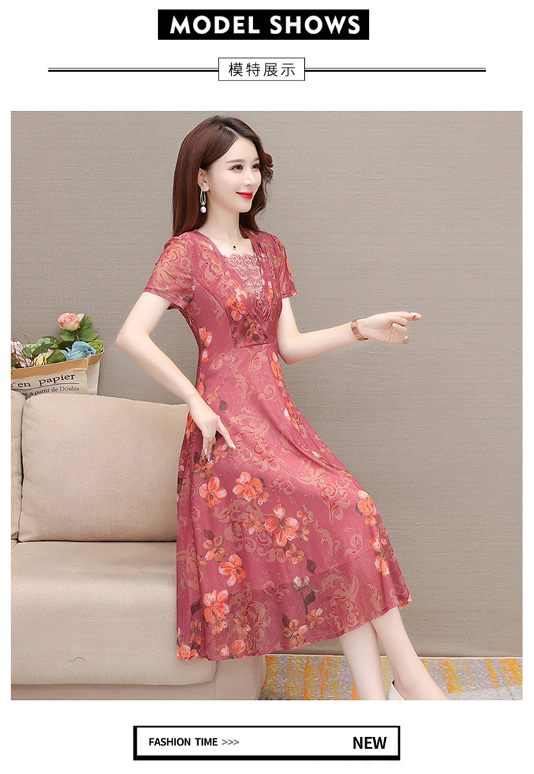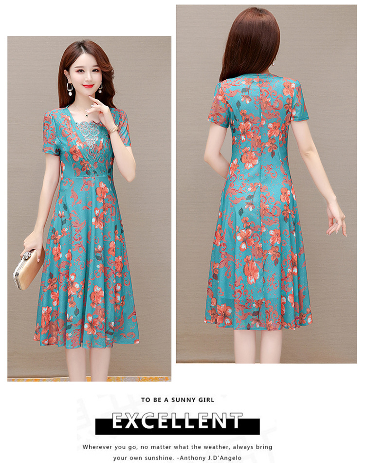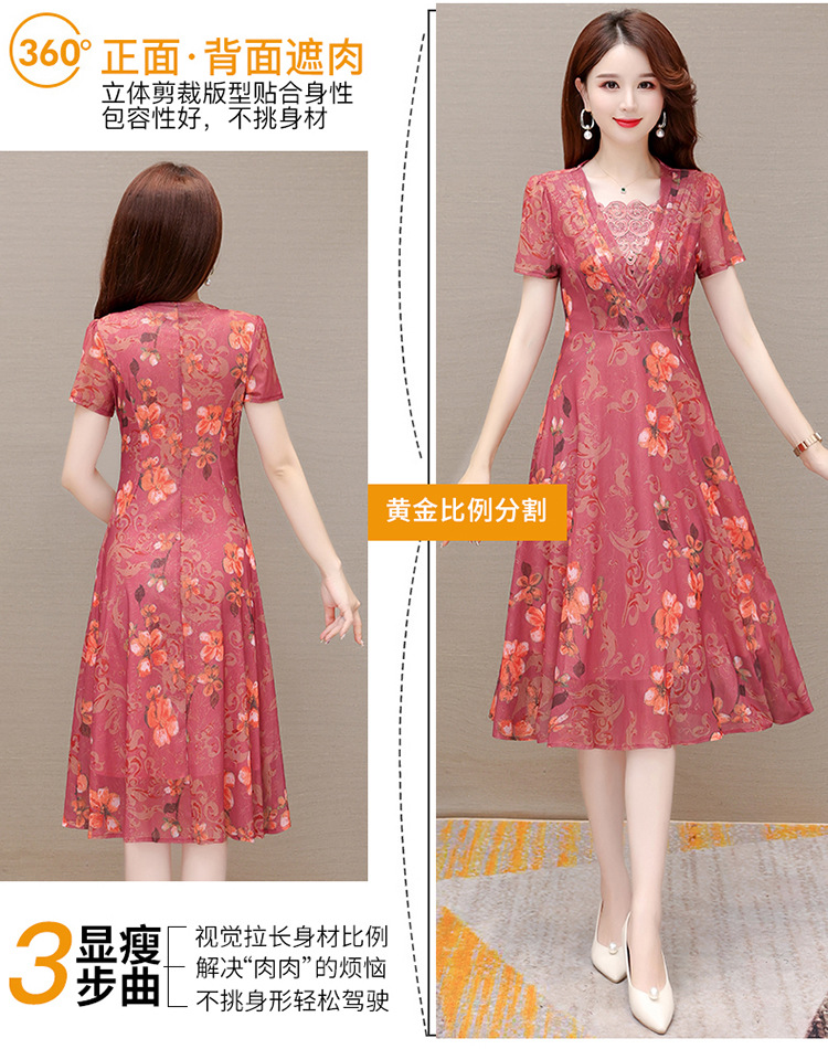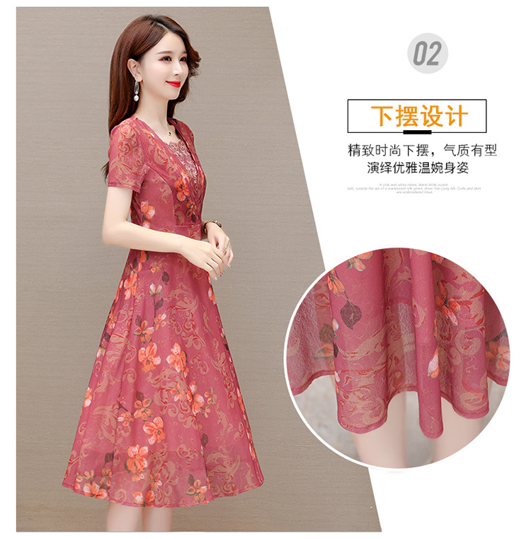 夏款印花,时尚皱褶拼接雪纺A字裙方领短袖气质修身连衣裙QYM-FL-X8829-L