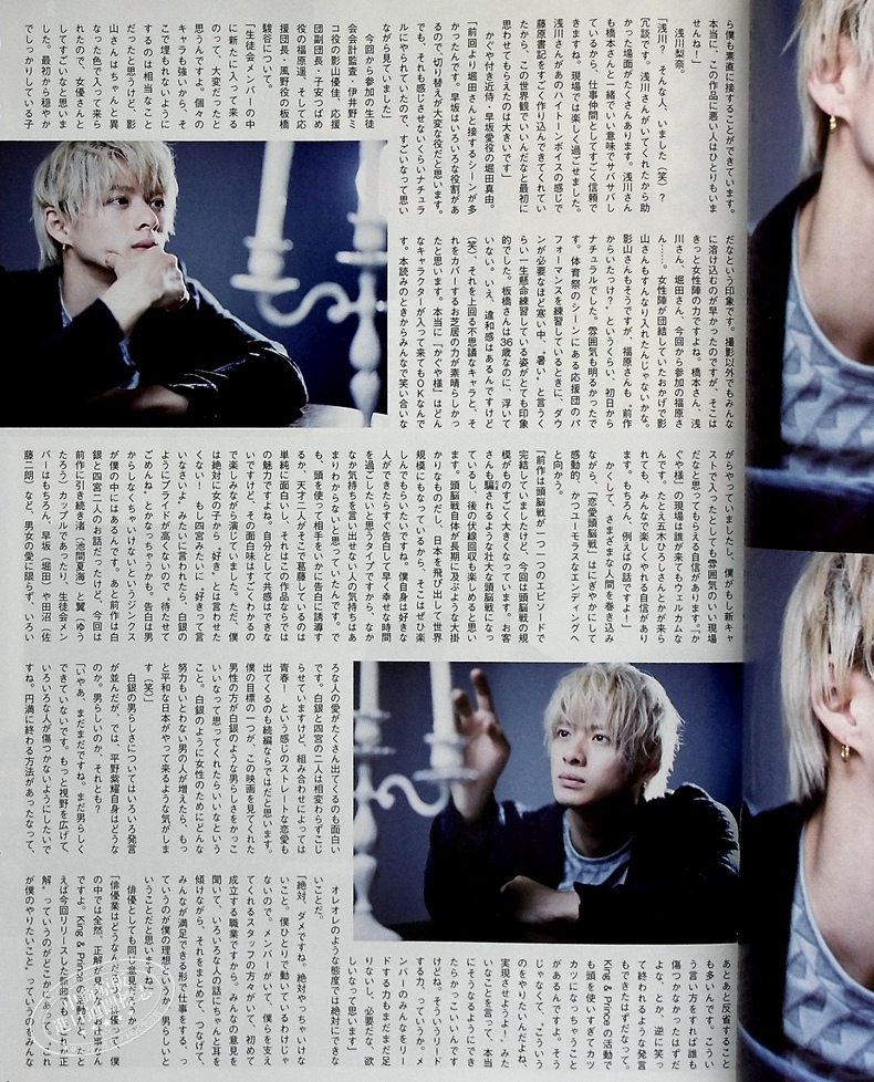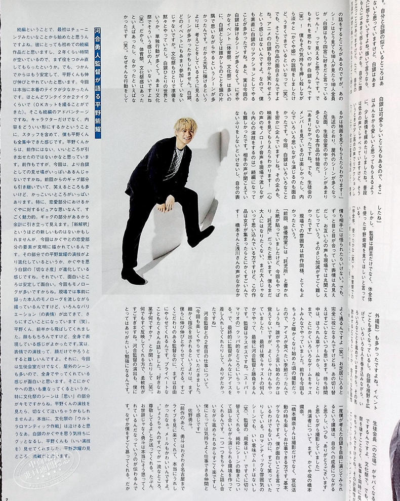 本期由平野紫耀担任卷头专访及封面人物,专访著重于平野紫耀与桥本环奈再次联手共演的《辉夜姬想让人告白~天才们的恋爱头脑战~Final》真人电影第2弹。此外本期亦带来Raul的《青春特调蜂蜜柠檬苏打》,三森铃子、佐久间大介配音的《白蛇:缘起》、林遣都的《犬部》、赤楚卫二的《妖怪大战争 Guardians》等精彩日本电影新情报专访。随刊附上平野紫耀与岸优太双面三摺全彩拉页。