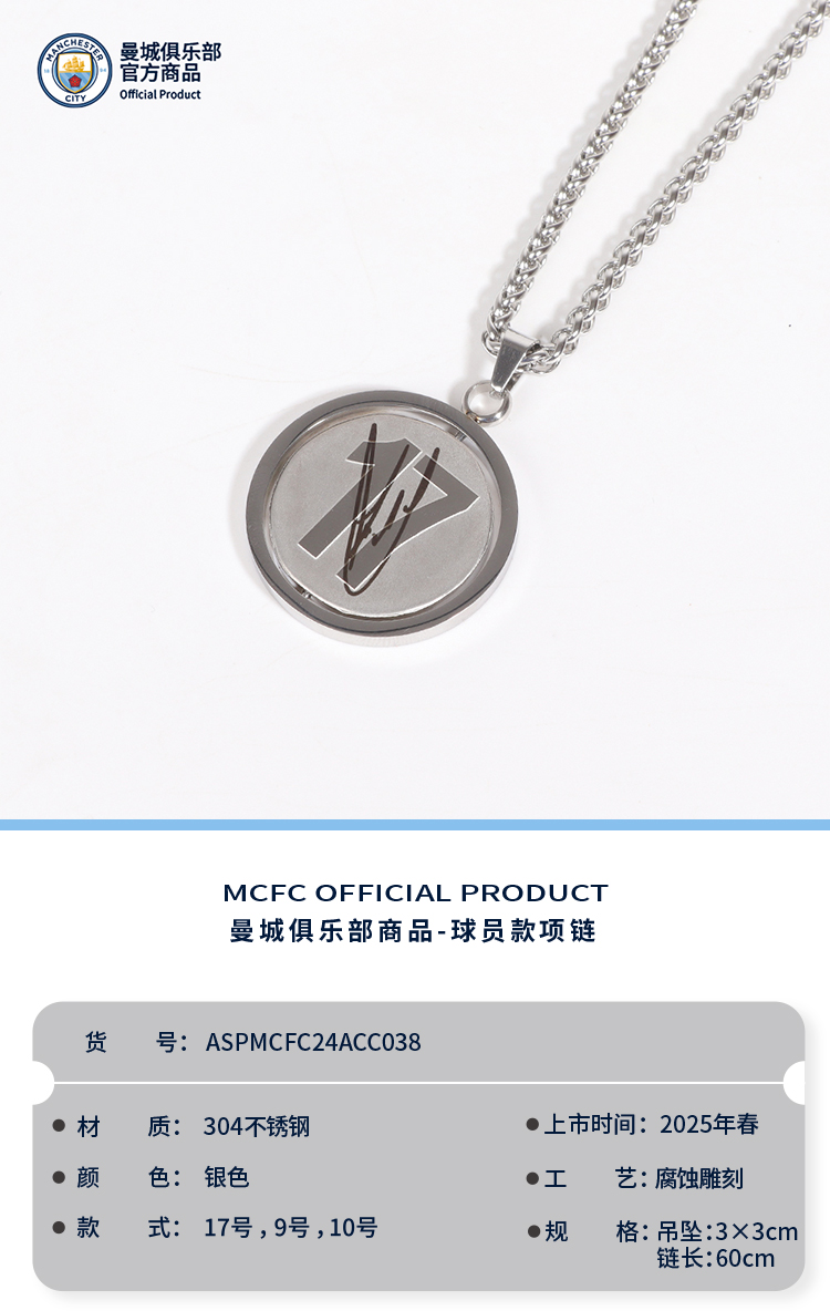 【官方正版】曼城俱乐部 | 旋转项链球员印签吊坠足球迷礼物