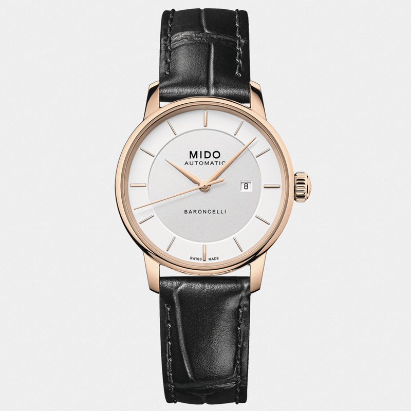 镜面 材质 | 蓝宝石水晶玻璃 | 表盘 | PVD镀玫瑰金表壳 银色表盘 棒状时标 日期显示 透底 |
