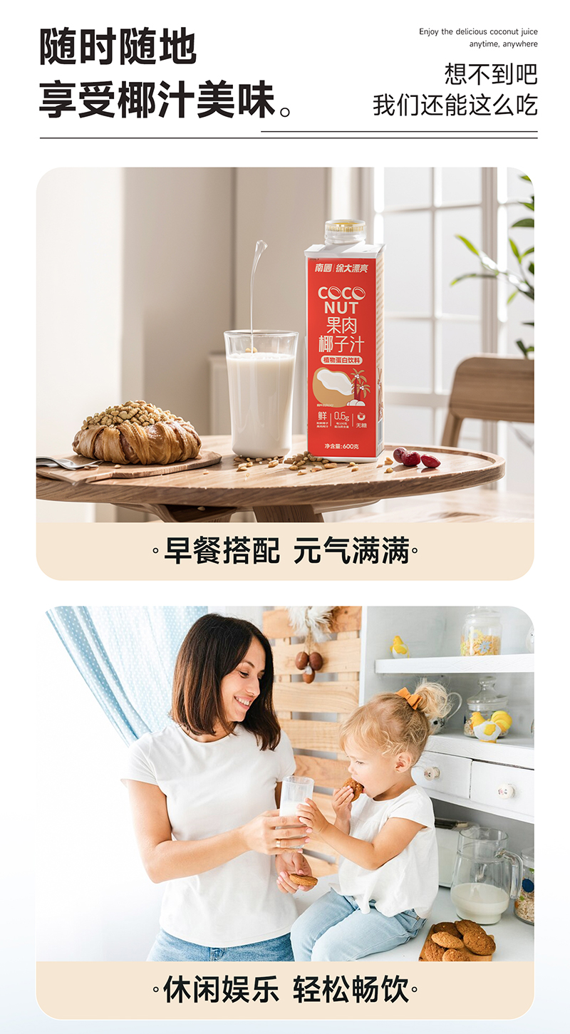 4️⃣口感独特:南国果肉椰子汁的口感醇厚,椰香浓郁,冷天热饮,热天冰冻冷饮,鲜爽宜人,满足您不同季节的饮用需求,为您的新年增添一份独特的风味。