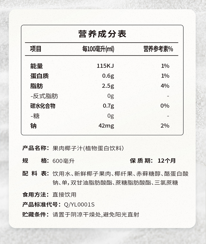 3️⃣真·配方:0蔗糖、蛋白质含量≥0.5g/100g、鲜椰肉≥10%榨汁