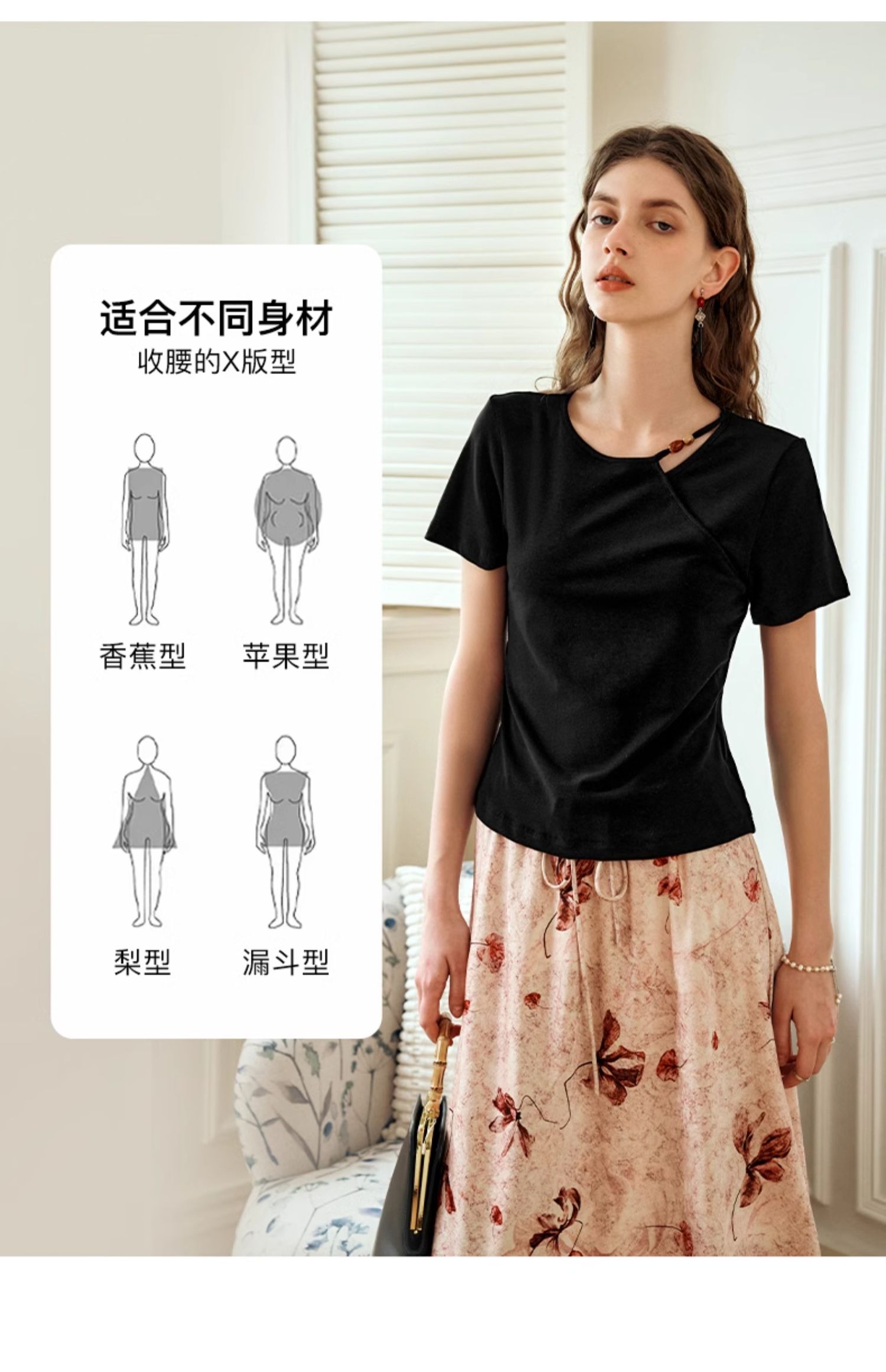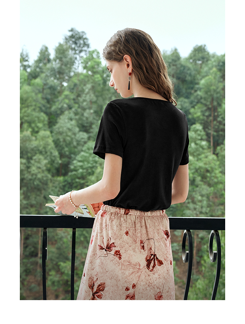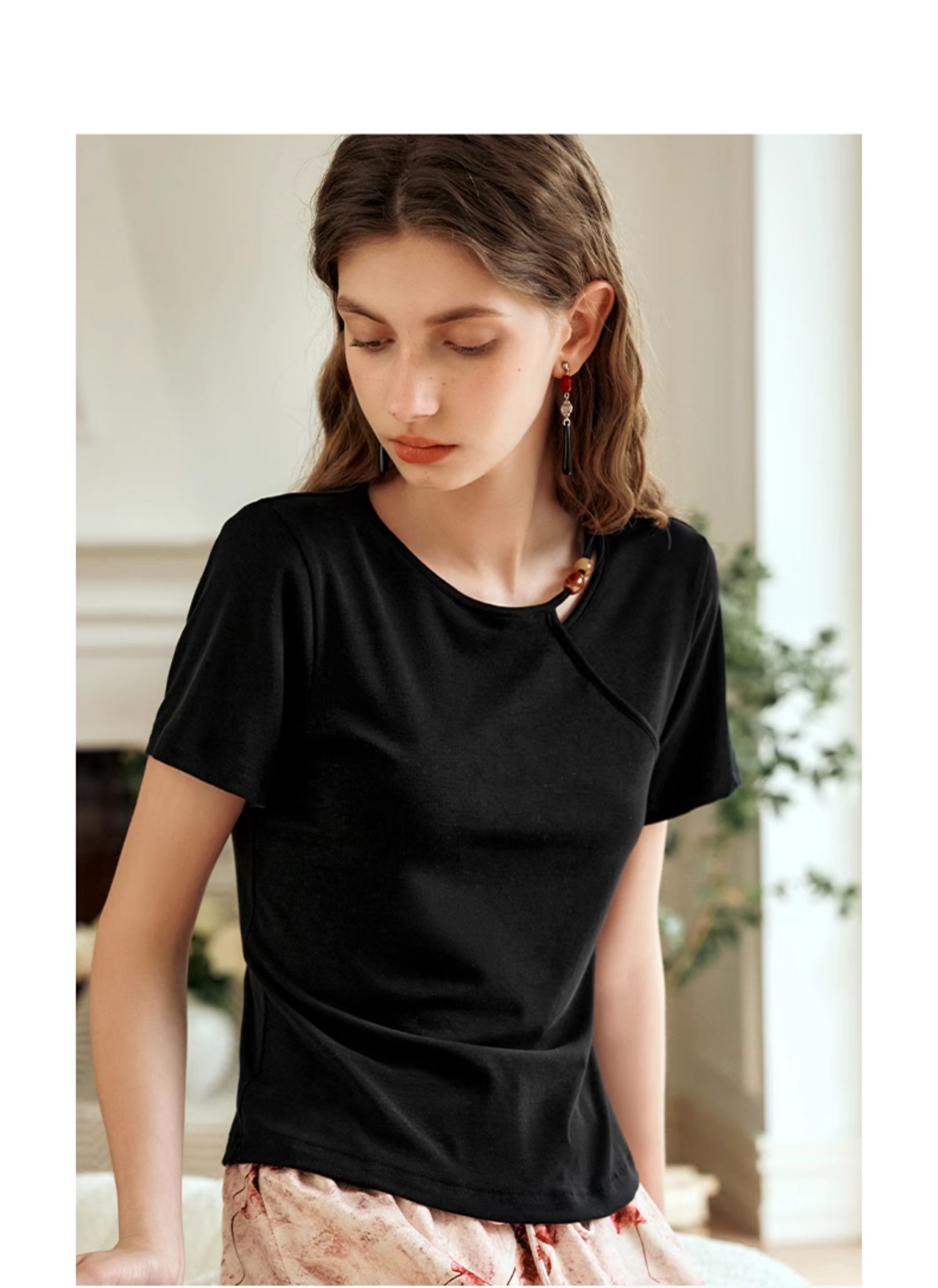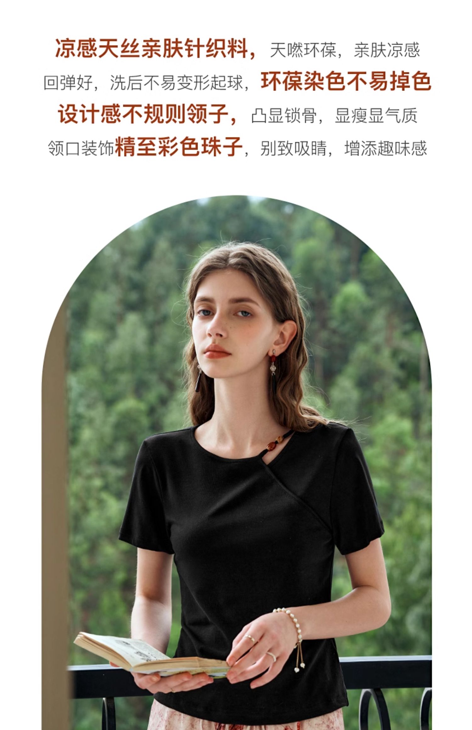 OLrain欧芮儿黑色短袖T恤女夏季2024新款简约通勤设计感针织上衣