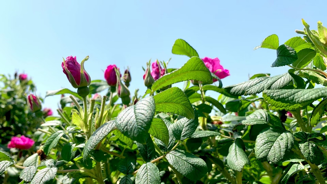 或许一阵风吹过,玫瑰花就瞬间绽放了,所以我们的采摘标准非常严苛。玫瑰花冠茶的原料,选取花开呈半开杯状、花瓣呈片状、花蕊不外露、直径3.5—4厘米的玫瑰花轻轻掐采,采摘过程中注意存放容器中的玫瑰花不能压紧、防止挤压、防止过挤过满而损坏花,避免发热影响品质,所以每次只摘半桶即可。