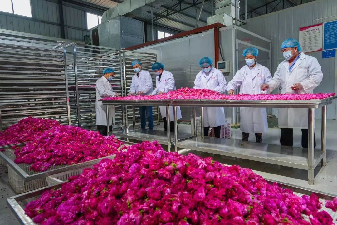 采摘下的玫瑰花冠,每一朵都需要花农小心地摆放,快摘快送运输至加工厂,减少花的存放时间和存放量,防止变质。然后放入烘干室,温度保持在35℃~45℃,低温烘焙24小时,烘干后的玫瑰花冠,经人工多次按直径大小进行严格筛选,只留10%的优级花冠,所以我们的花冠茶朵朵都是精品。