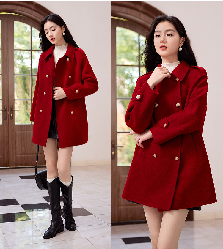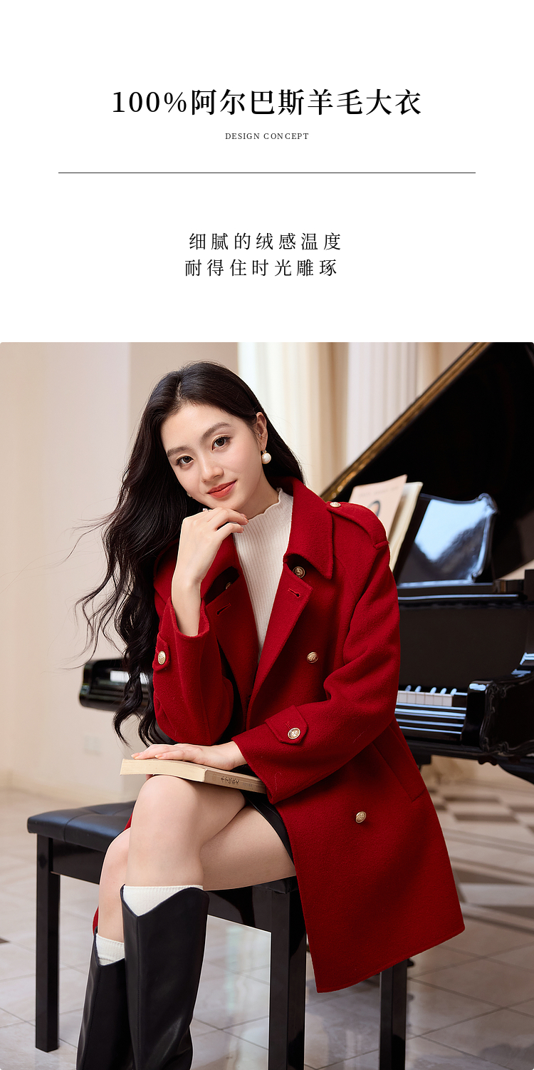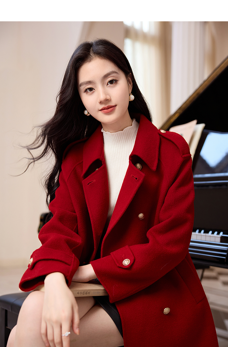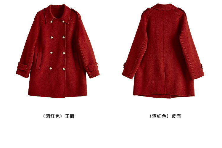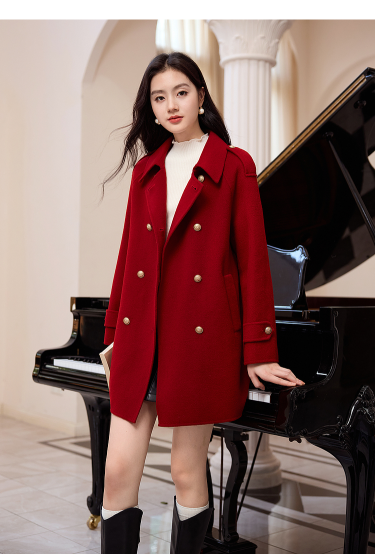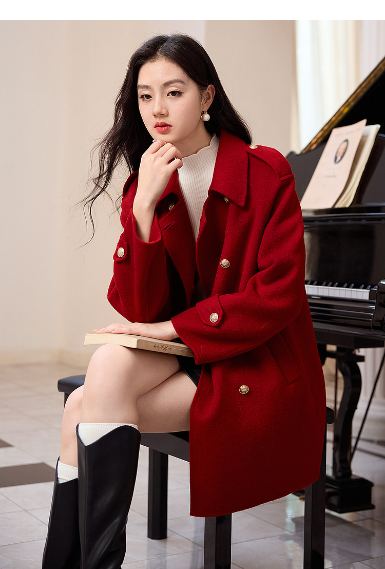 【五折购】熙世界学院风双面呢大衣中长款2025冬季新款红色全羊毛呢子外套
