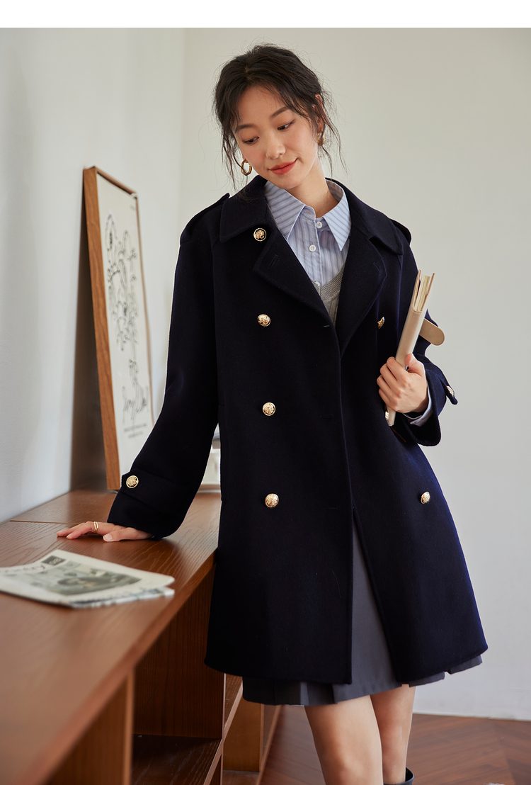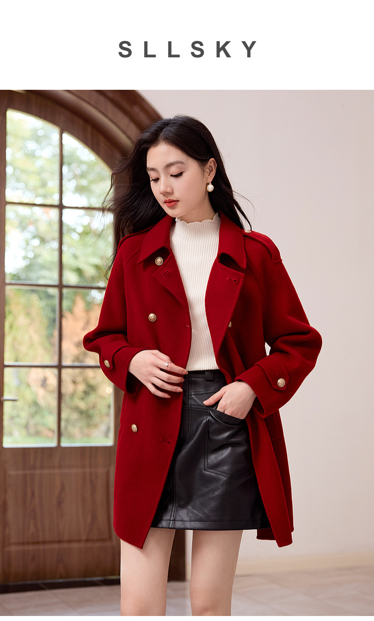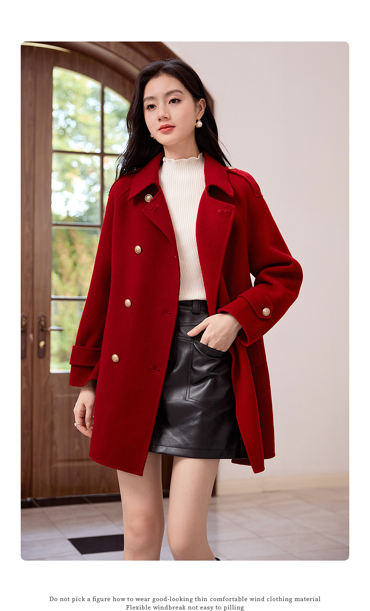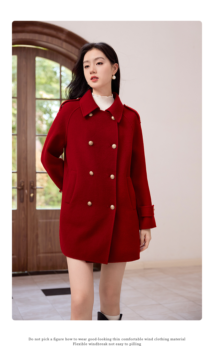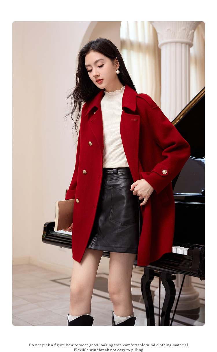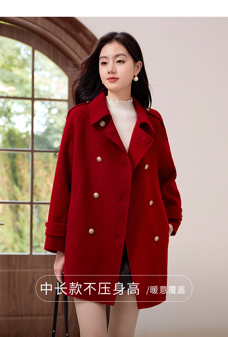 【五折购】熙世界学院风双面呢大衣中长款2025冬季新款红色全羊毛呢子外套