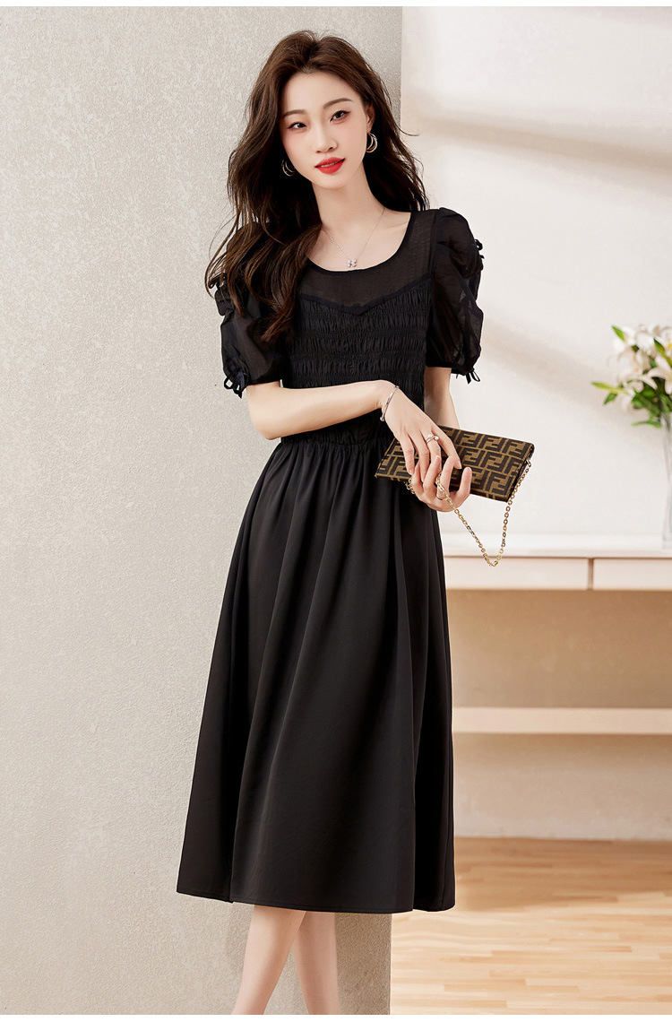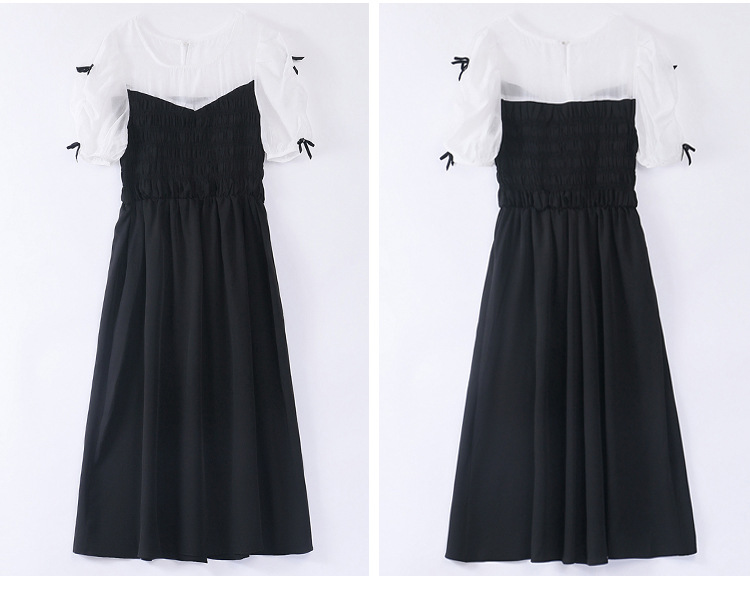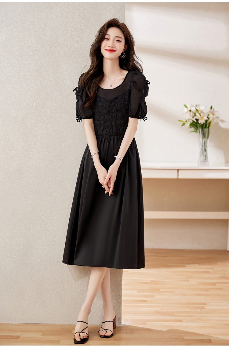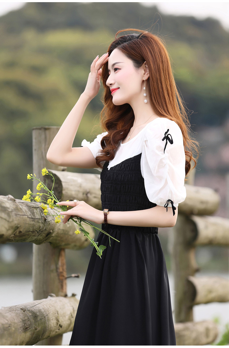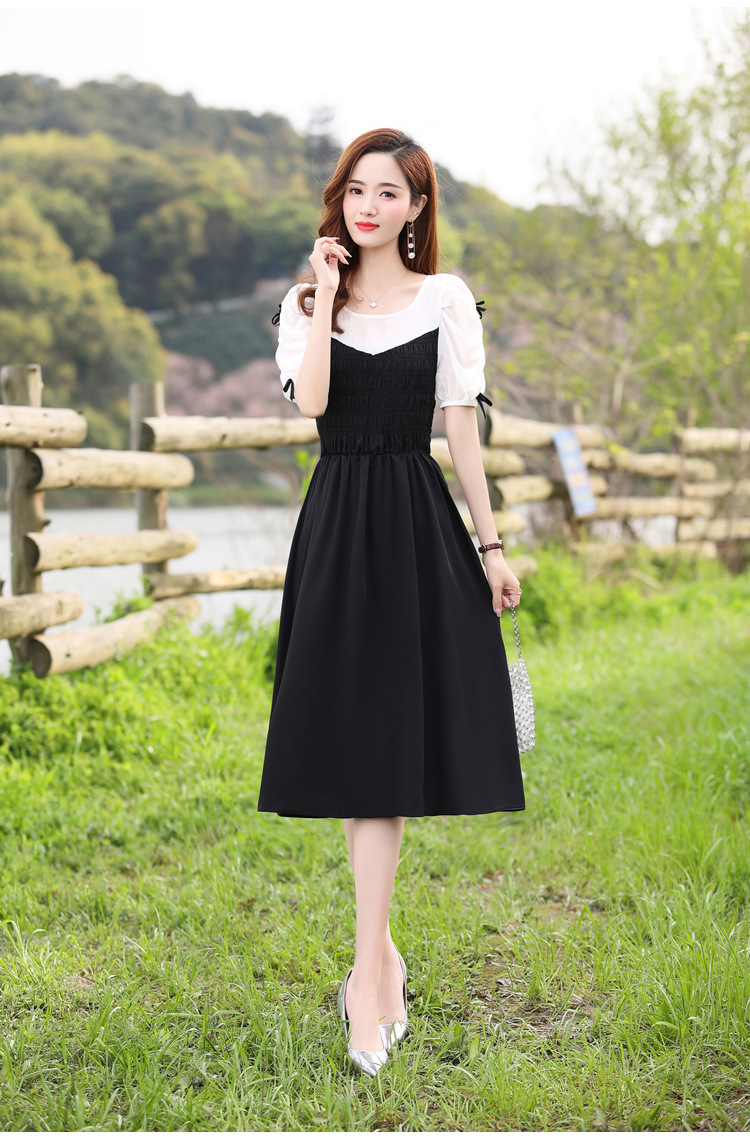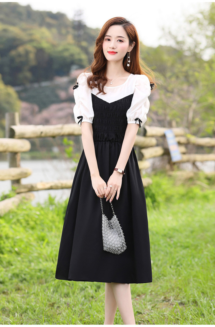 时尚潮流圆领气质通勤优雅蝴蝶结拼接连衣裙HR-WL22077-19