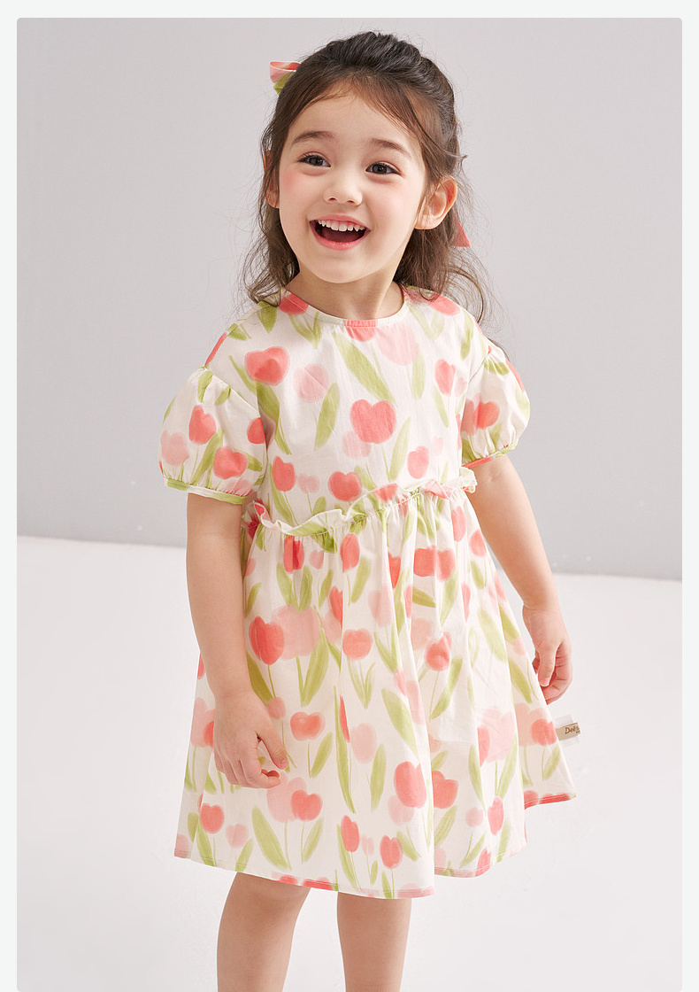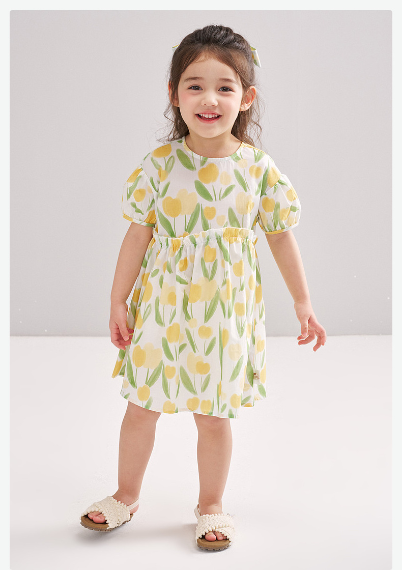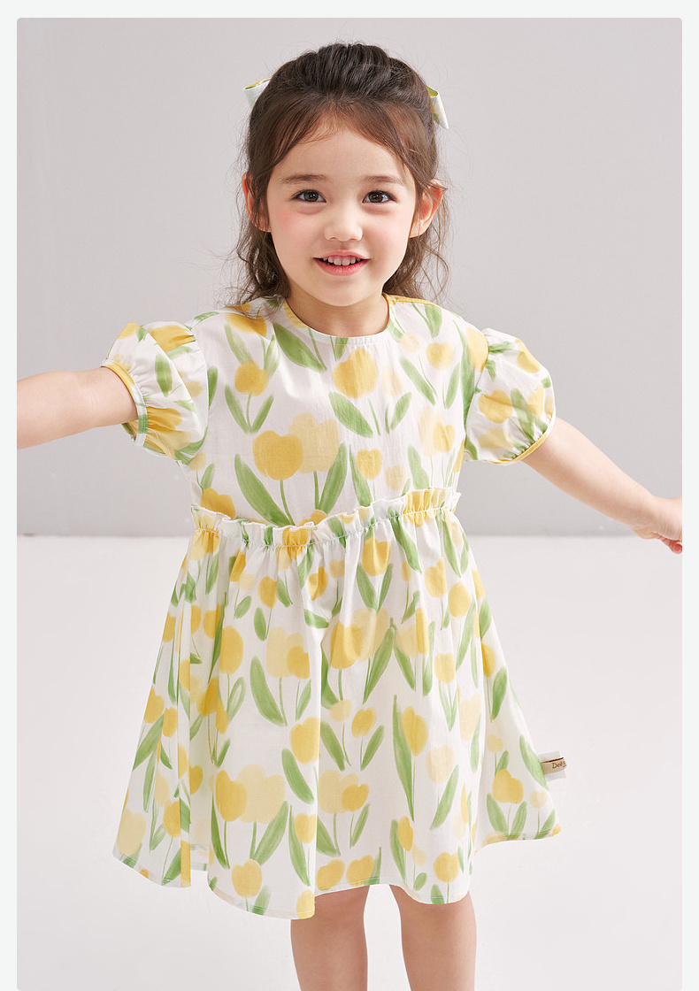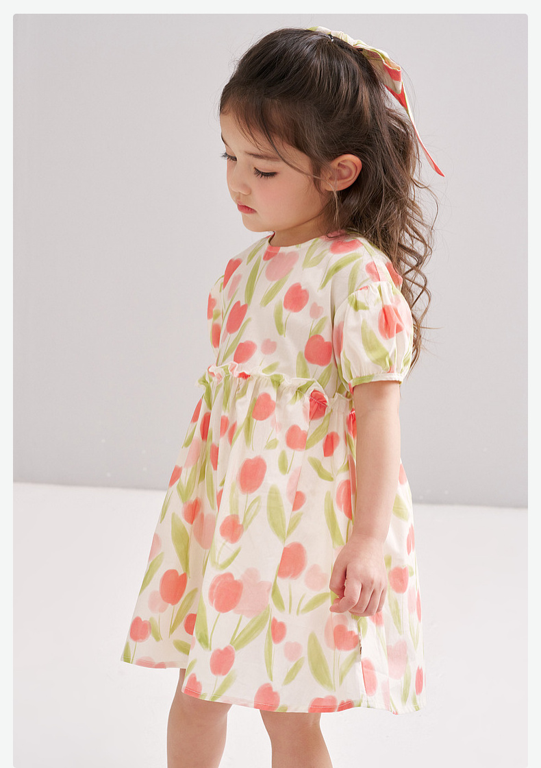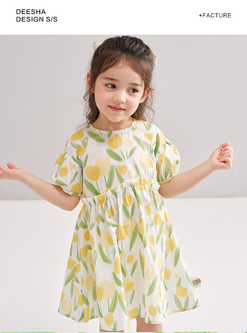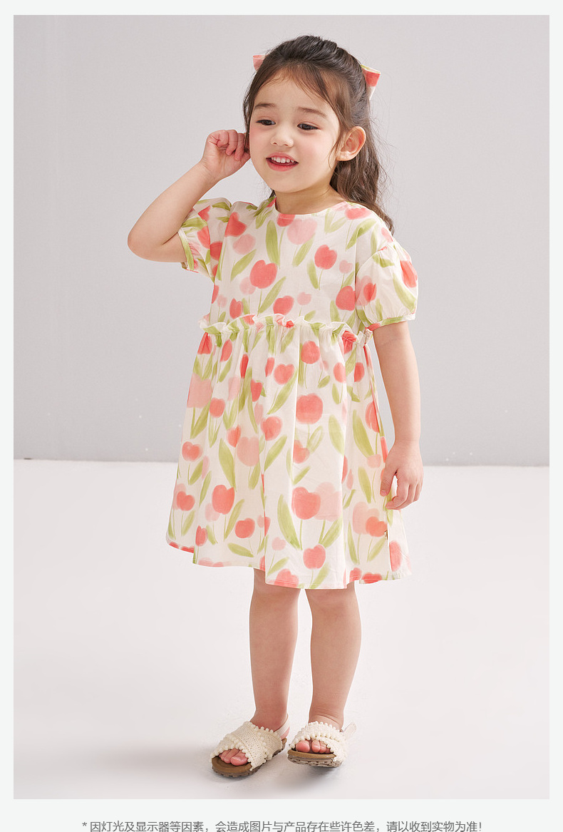笛莎/Deesha 【松饼熊】2026年夏季新款女童泡泡袖水彩风花朵印花棉布连衣裙