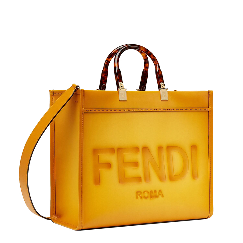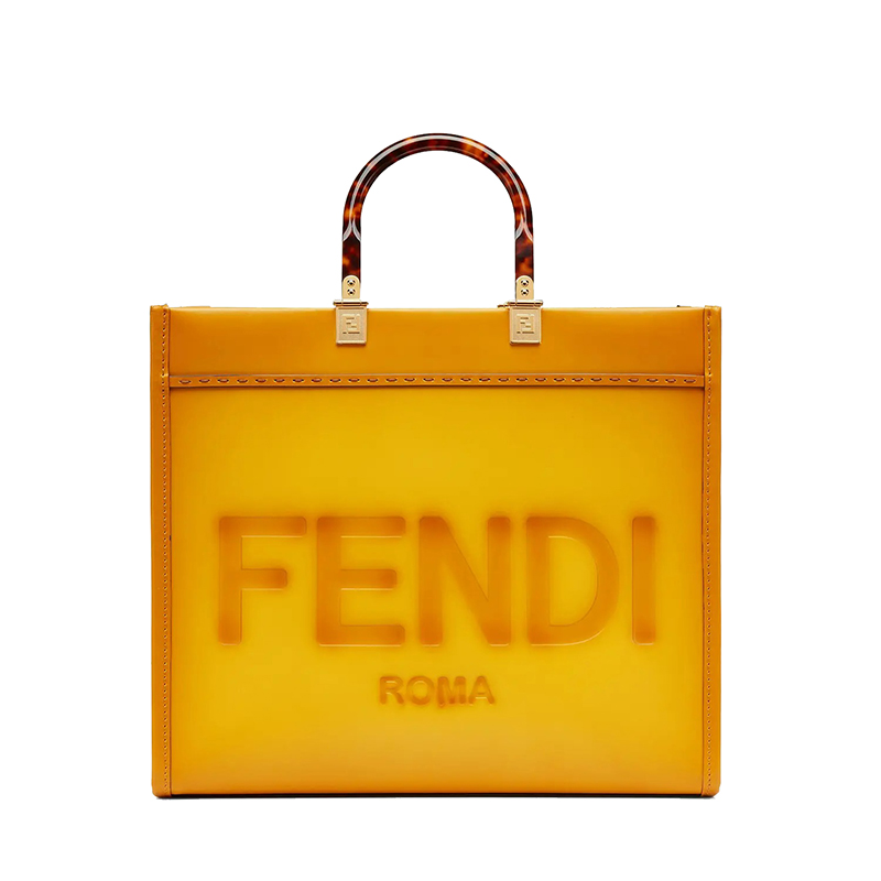 Sunshine 购物袋,中号,黄色皮革制成,带有精致的手工渐变效果,热印“FENDI ROMA”字样和白色有机玻璃硬质手柄。