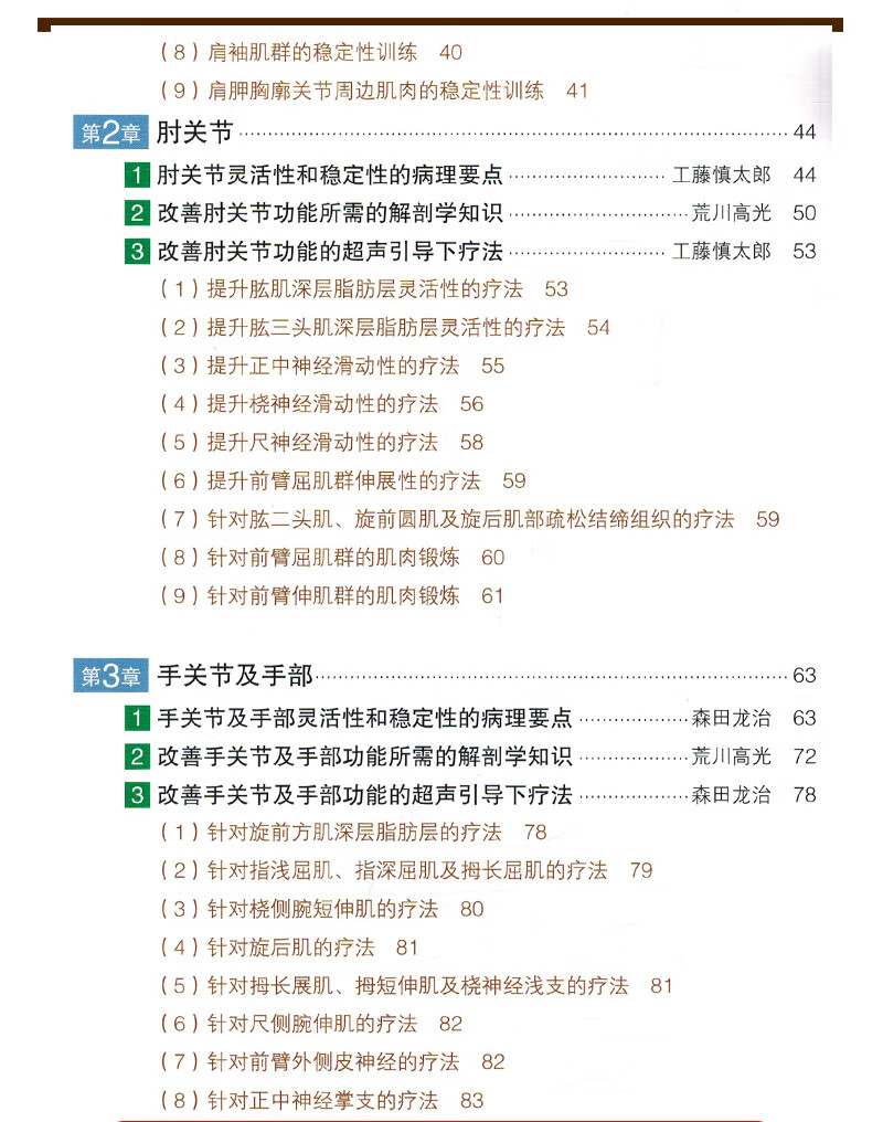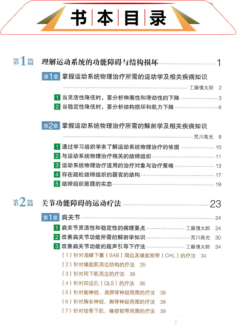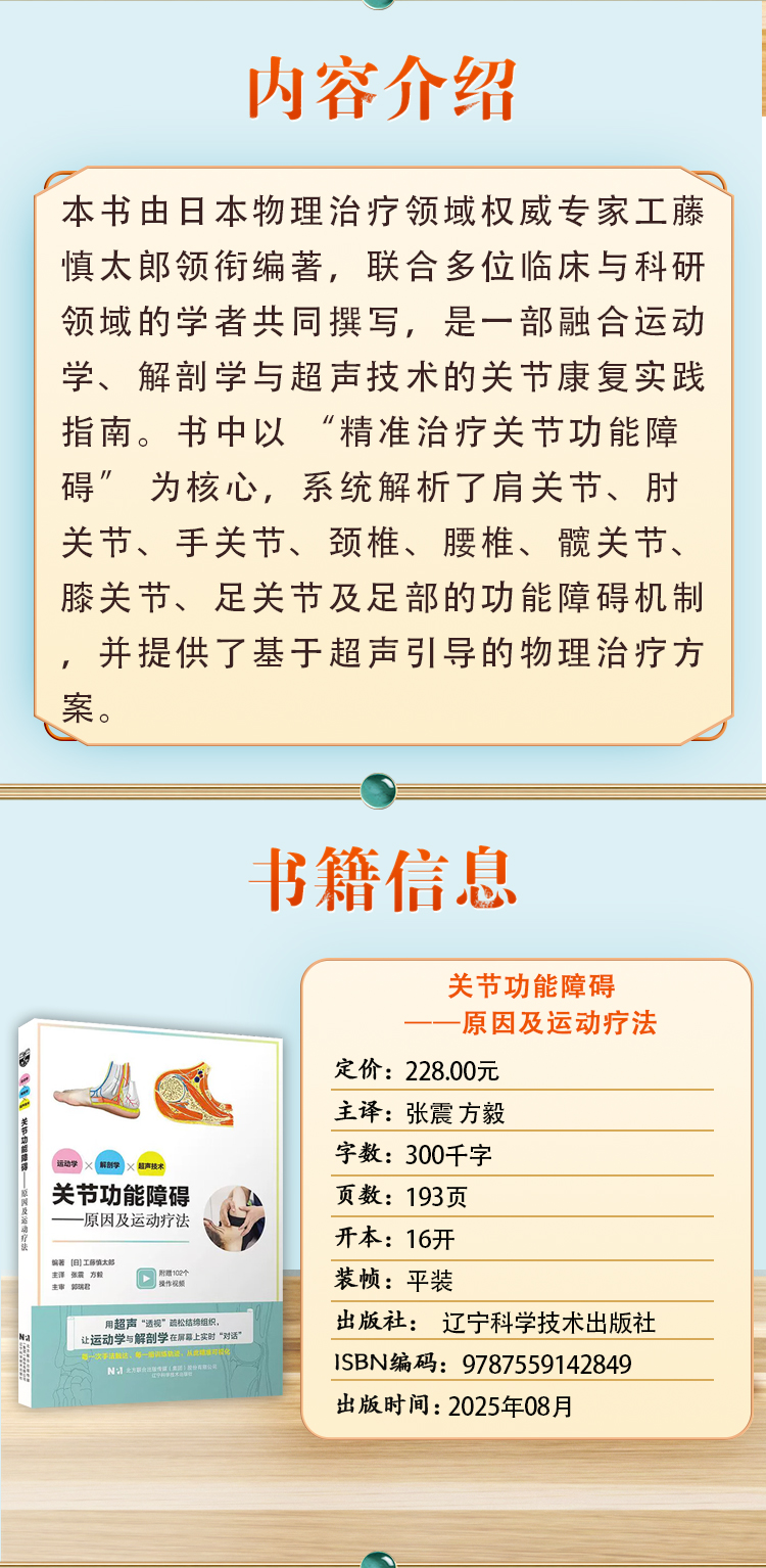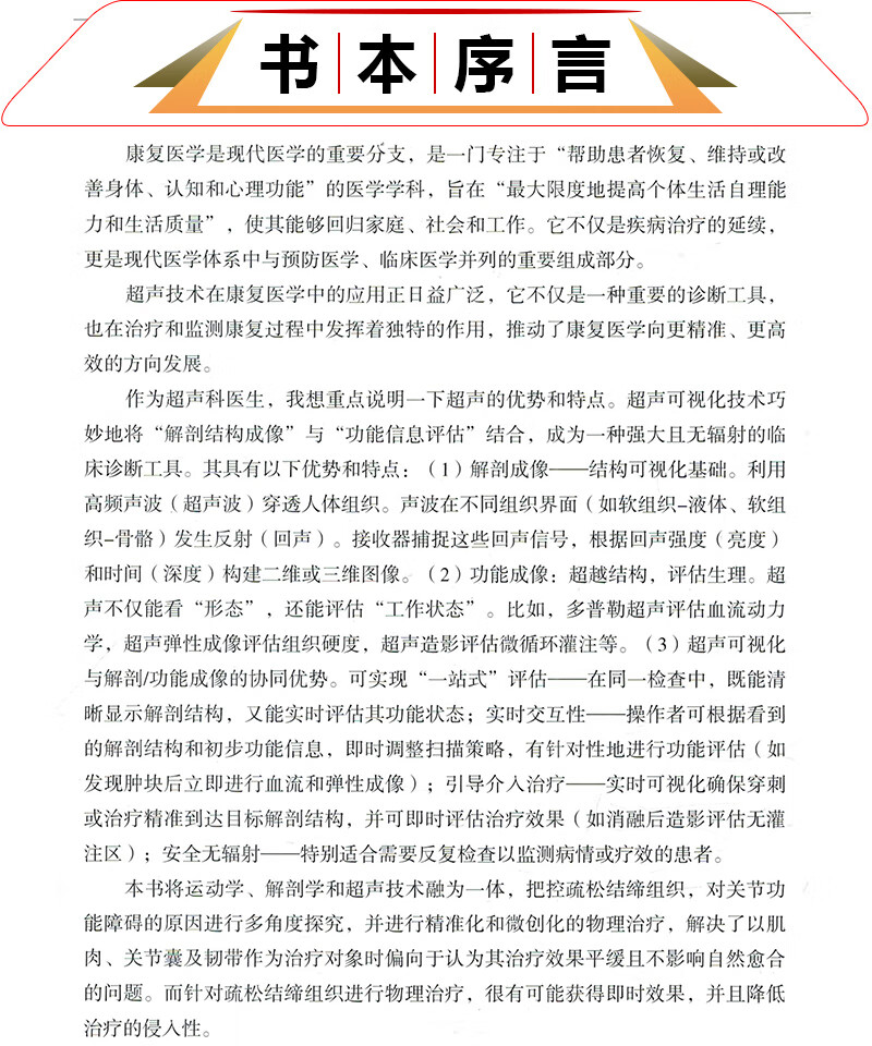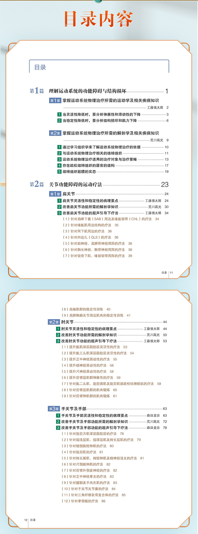 本书由日本物理治疗领域权威专家工藤慎太郎领衔编著,联合多位临床与科研领域的学者共同撰写,是一部融合运动学、解剖学与超声技术的关节康复实践指南。书中以 “精准治疗关节功能障碍” 为核心,系统解析了肩关节、肘关节、手关节、颈椎、腰椎、髋关节、膝关节、足关节及足部的功能障碍机制,并提供了基于超声引导的物理治疗方案。