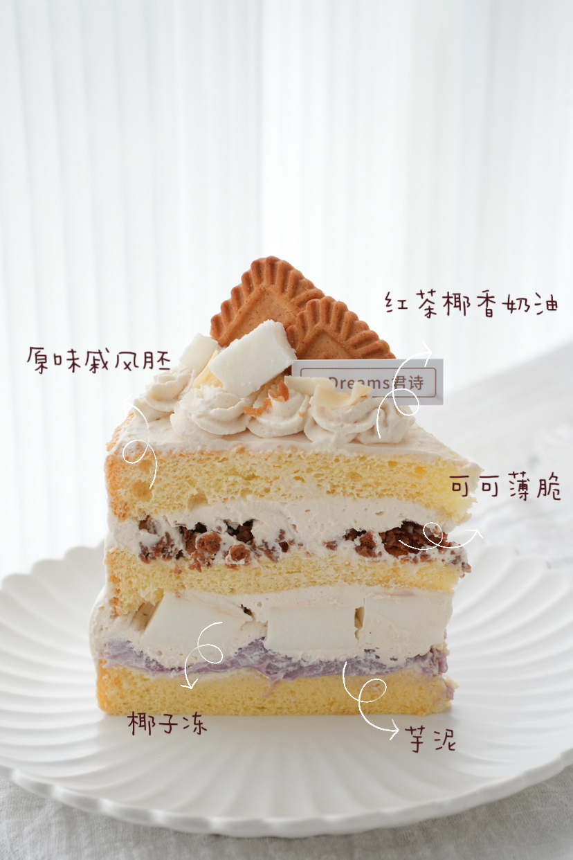 『椰香芋泥蛋糕』三层厚切原味蛋糕胚,中间两层夹馅,第一层是芋泥+椰子冻,第二层是奶油+巧克力薄脆,最外层是特调的红茶椰香奶油。君诗一直坚持手工制作,以保证新鲜美味、健康放心,所以椰子冻、芋泥都是自己动手做的。有喜欢芋泥的盆友问芋泥怎么不放两层呀,大家对芋泥炙热的爱我们非常理解,但是考虑到芋泥本身吃起来就比较绵密,蛋糕胚也是绵软的,如果真放两层芋泥只是胜在单一成分量多,但整体口味就会腻,食用感受并不出彩。加入椰子冻和巧克力薄脆,吃起来脆香脆香的,清新的椰香味和棉棉的芋泥味,这味道不爱都难。